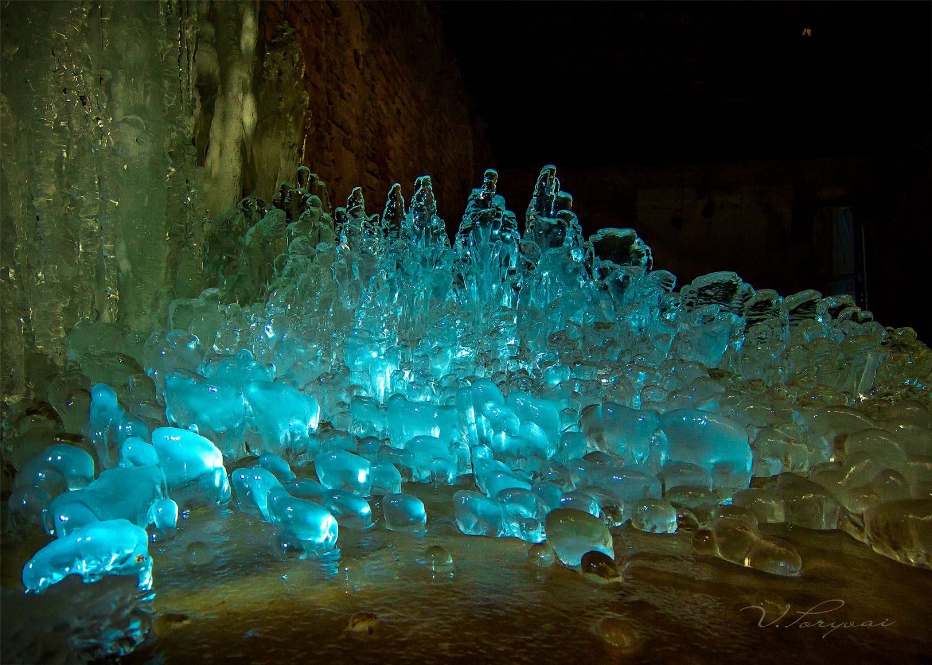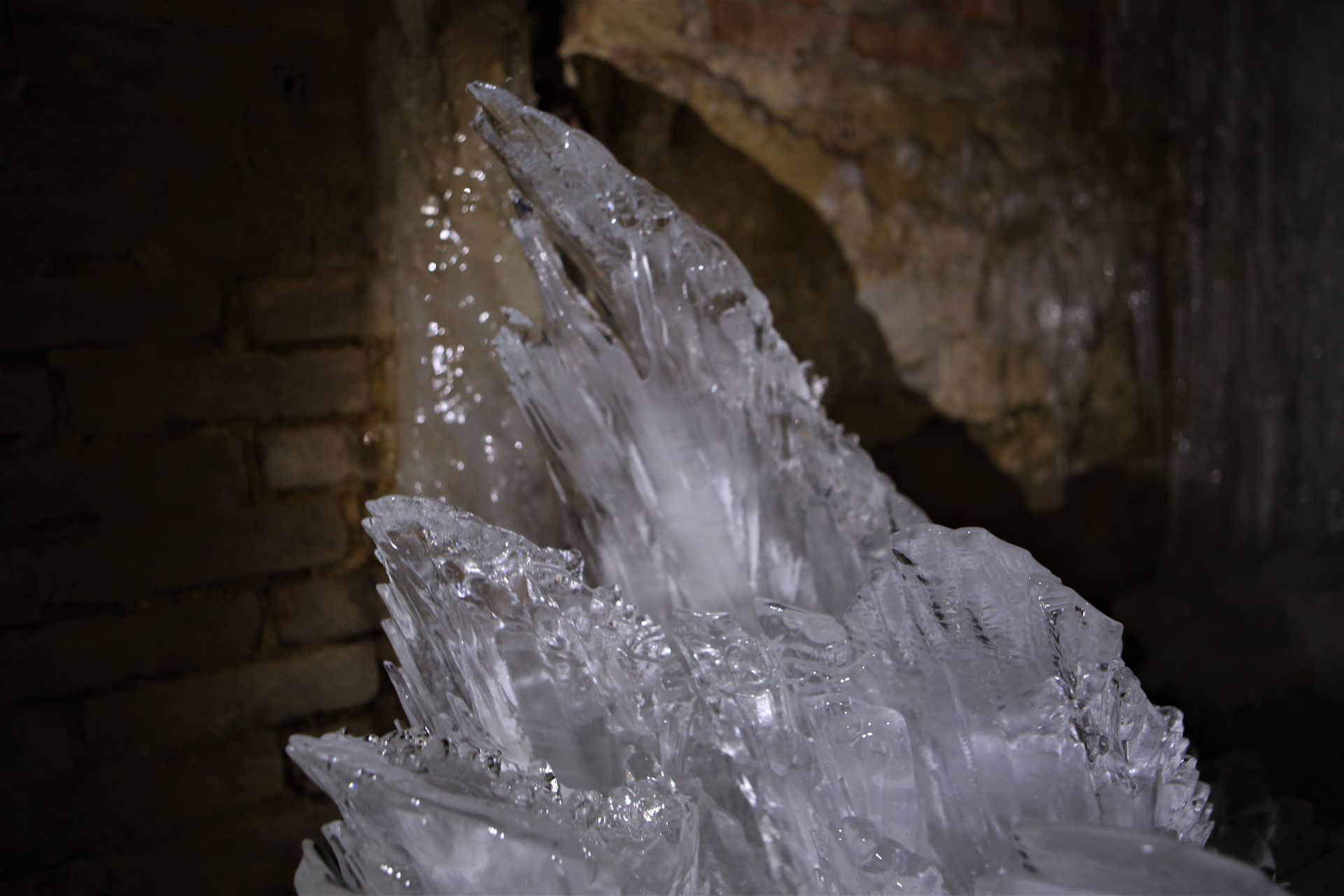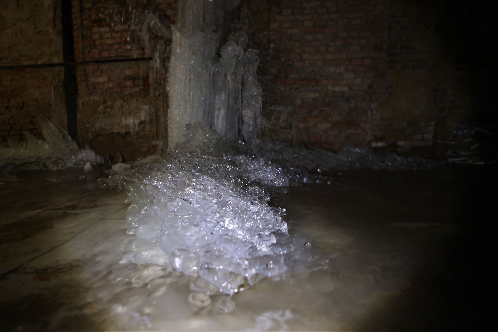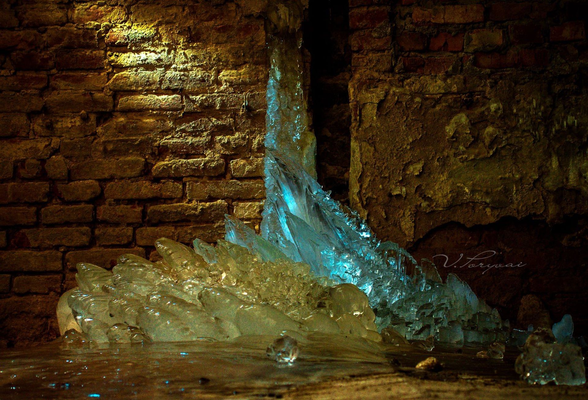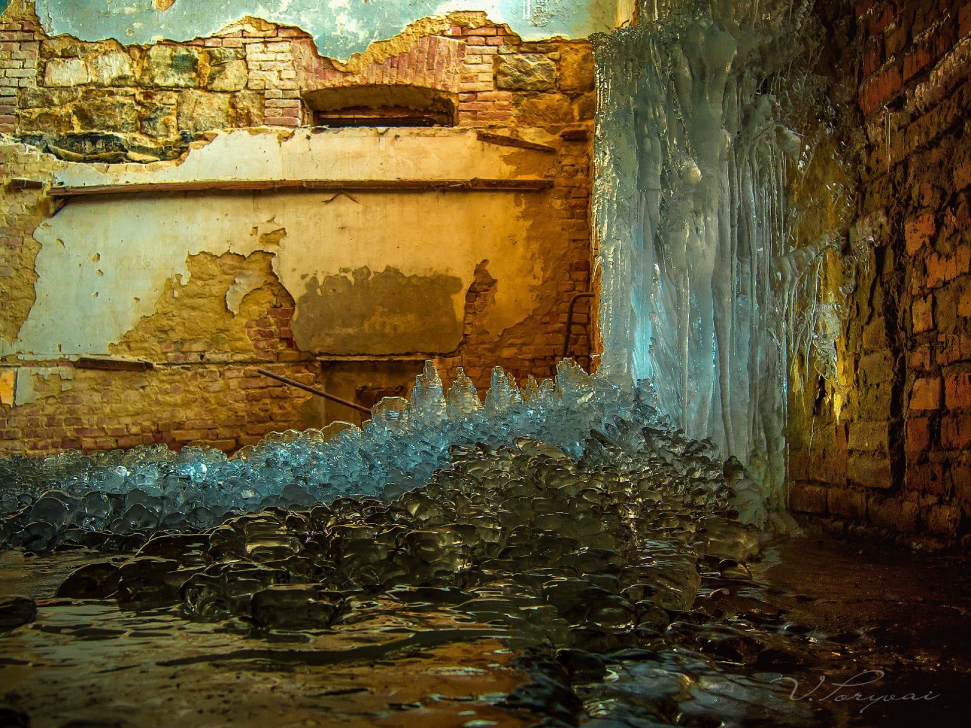 «Вода, просочившись через перекриття, при низьких температурах на цокольному поверсі формує такі цікаві утворення. Підсвічені виглядають просто казково», — пише фотограф.
