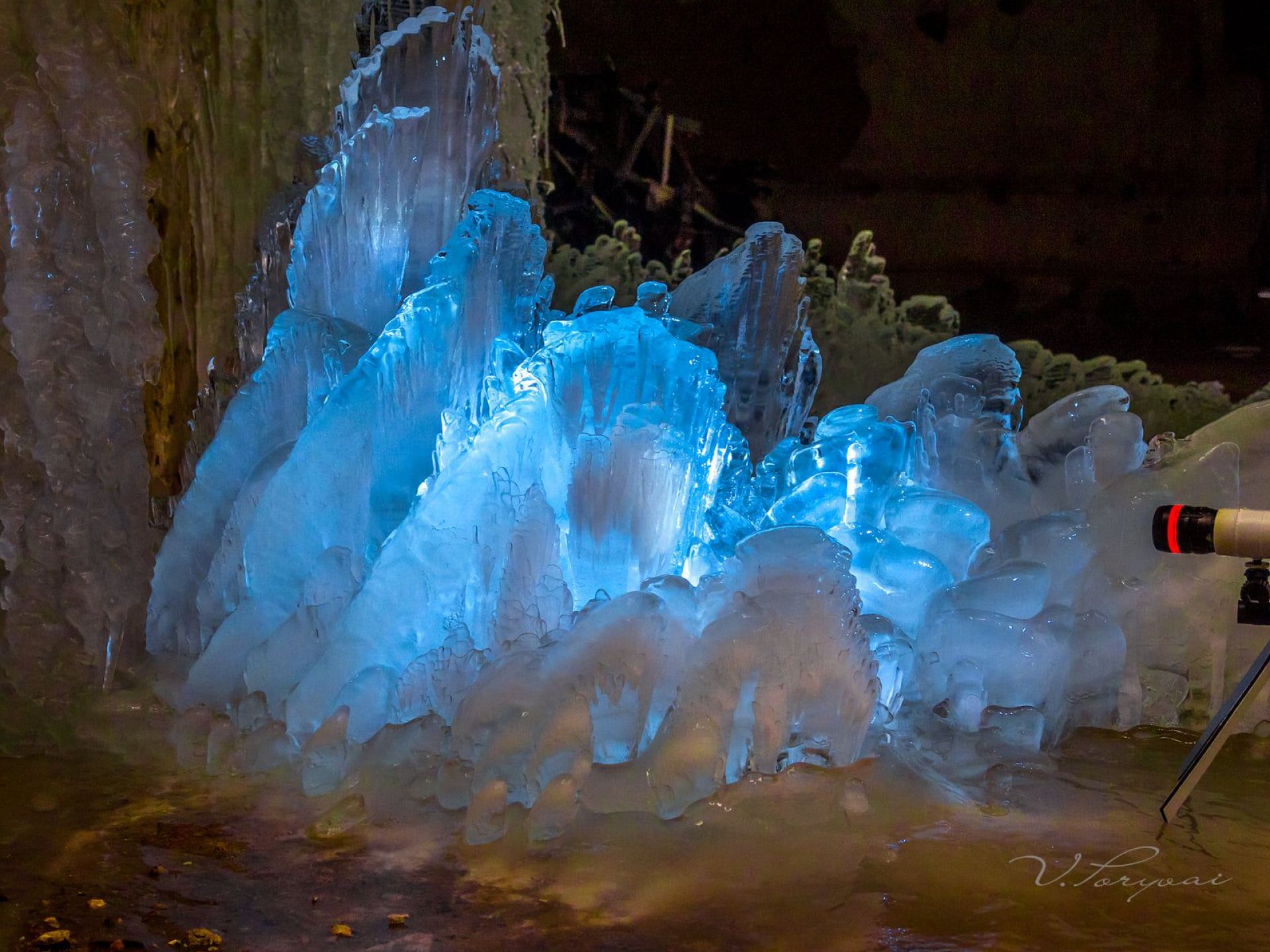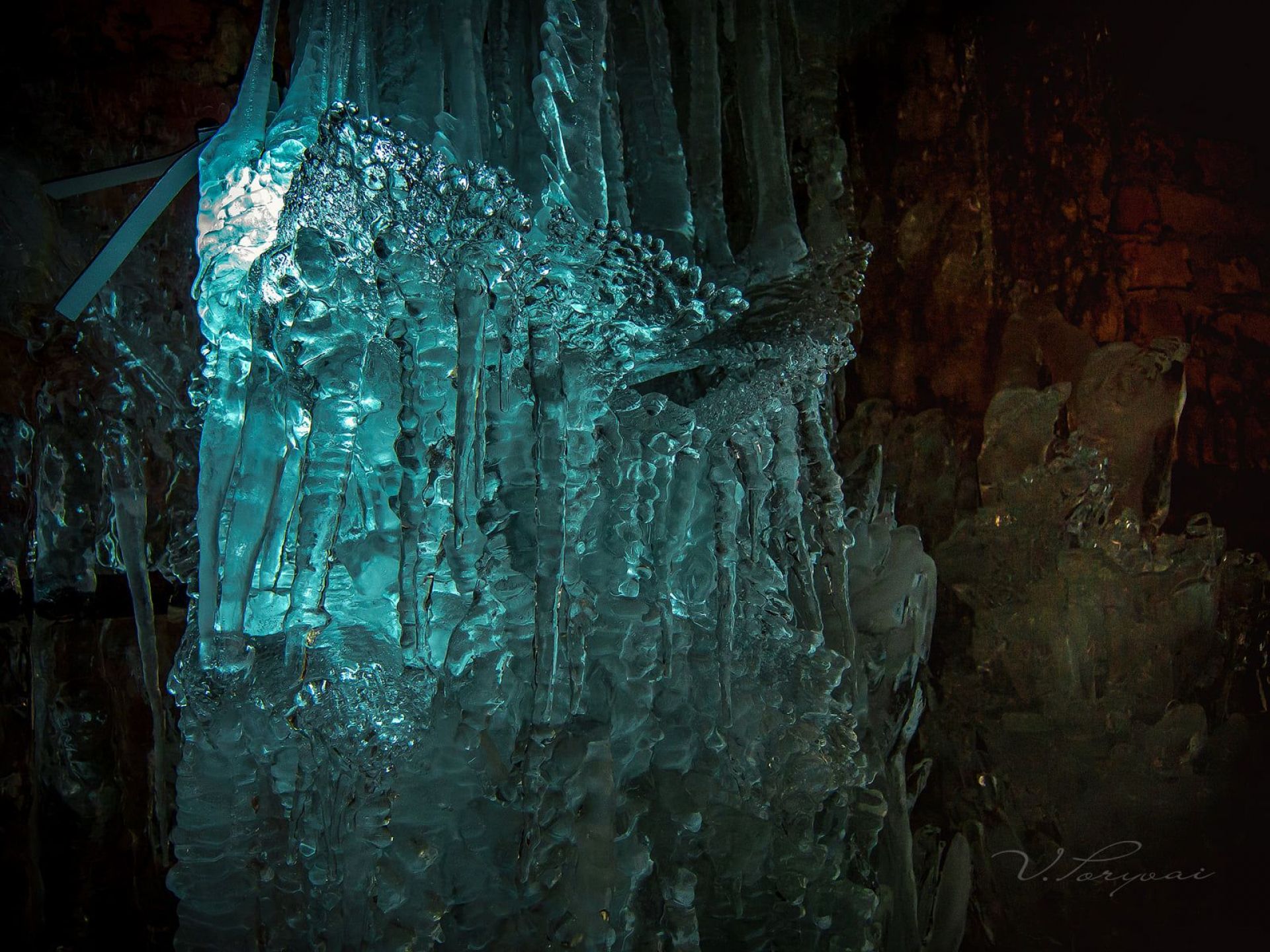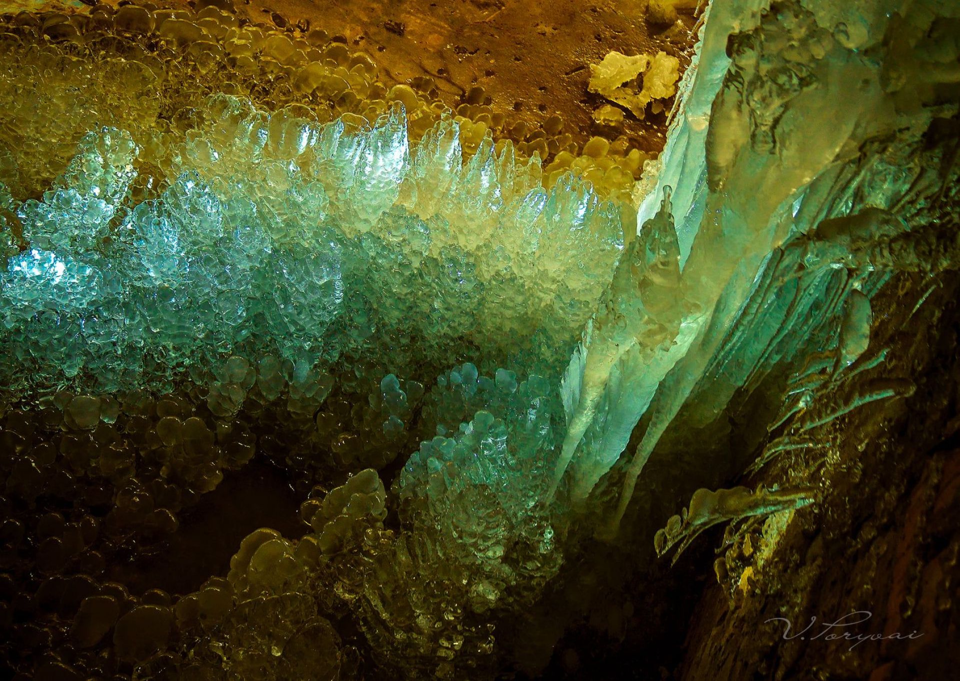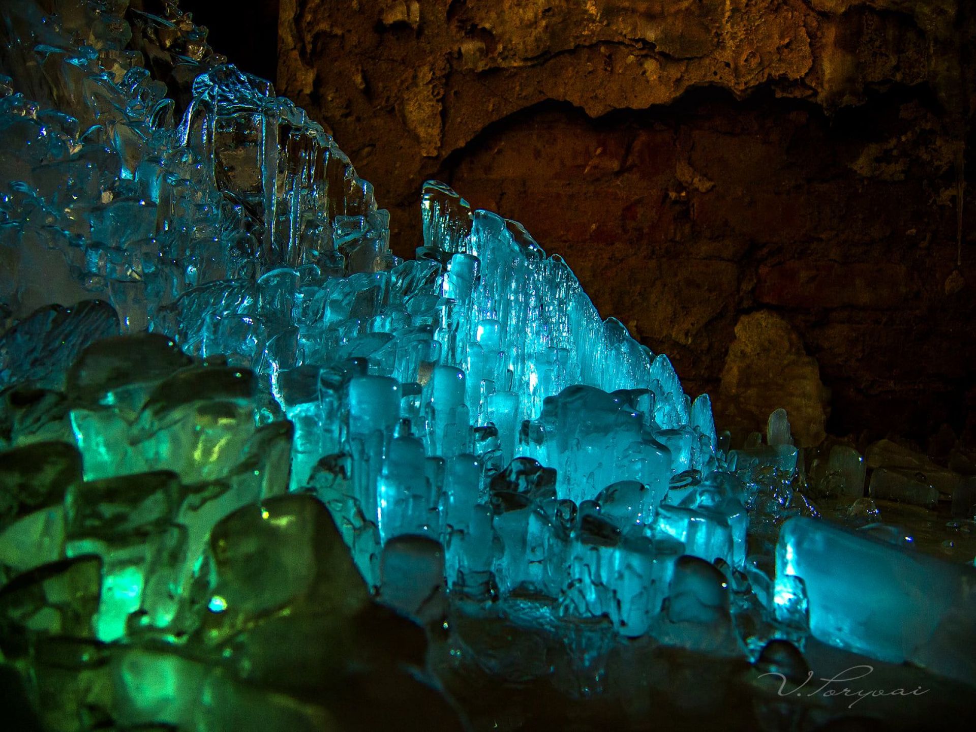 «Вода, просочившись через перекриття, при низьких температурах на цокольному поверсі формує такі цікаві утворення. Підсвічені виглядають просто казково», — пише фотограф.