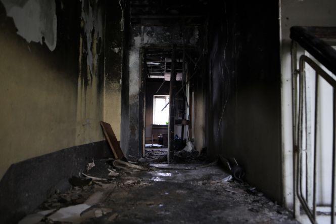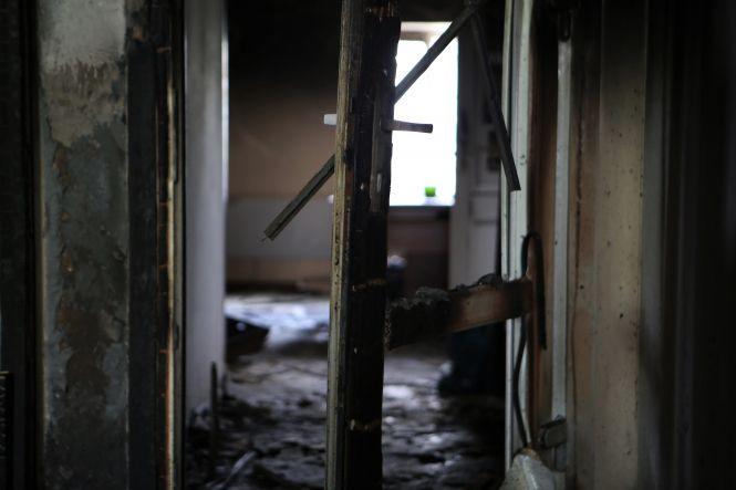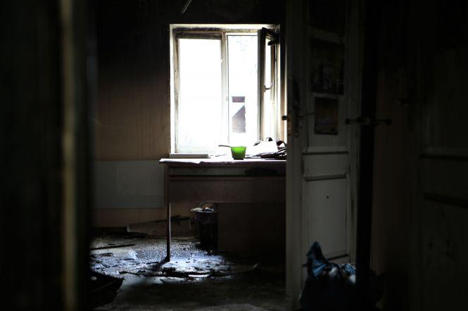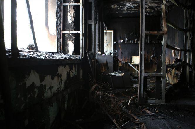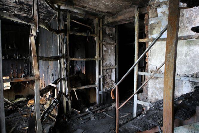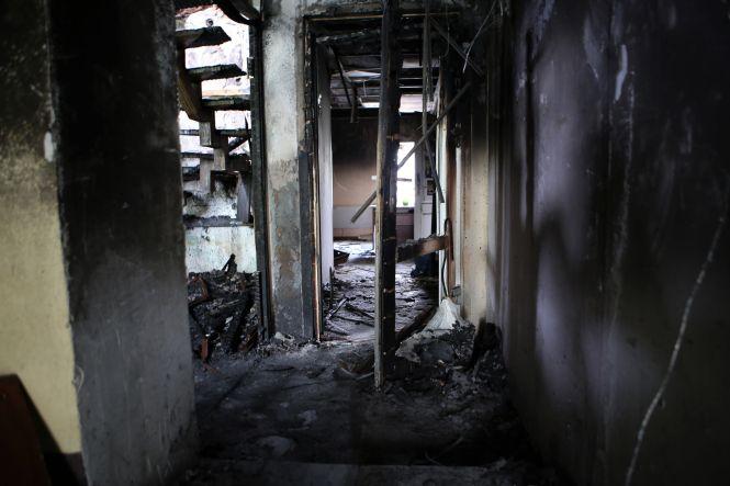 На третьому поверсі зараз немає нікого. Власне, там і знаходитись немає де. Вже на сходовому майданчику, який з’єднує другий і третій поверхи, починається згарище. Видно купи попелу, розплавлений посуд і згорілий верхній одяг, обвуглені речі залишки дверей, вікон та електротехніки.