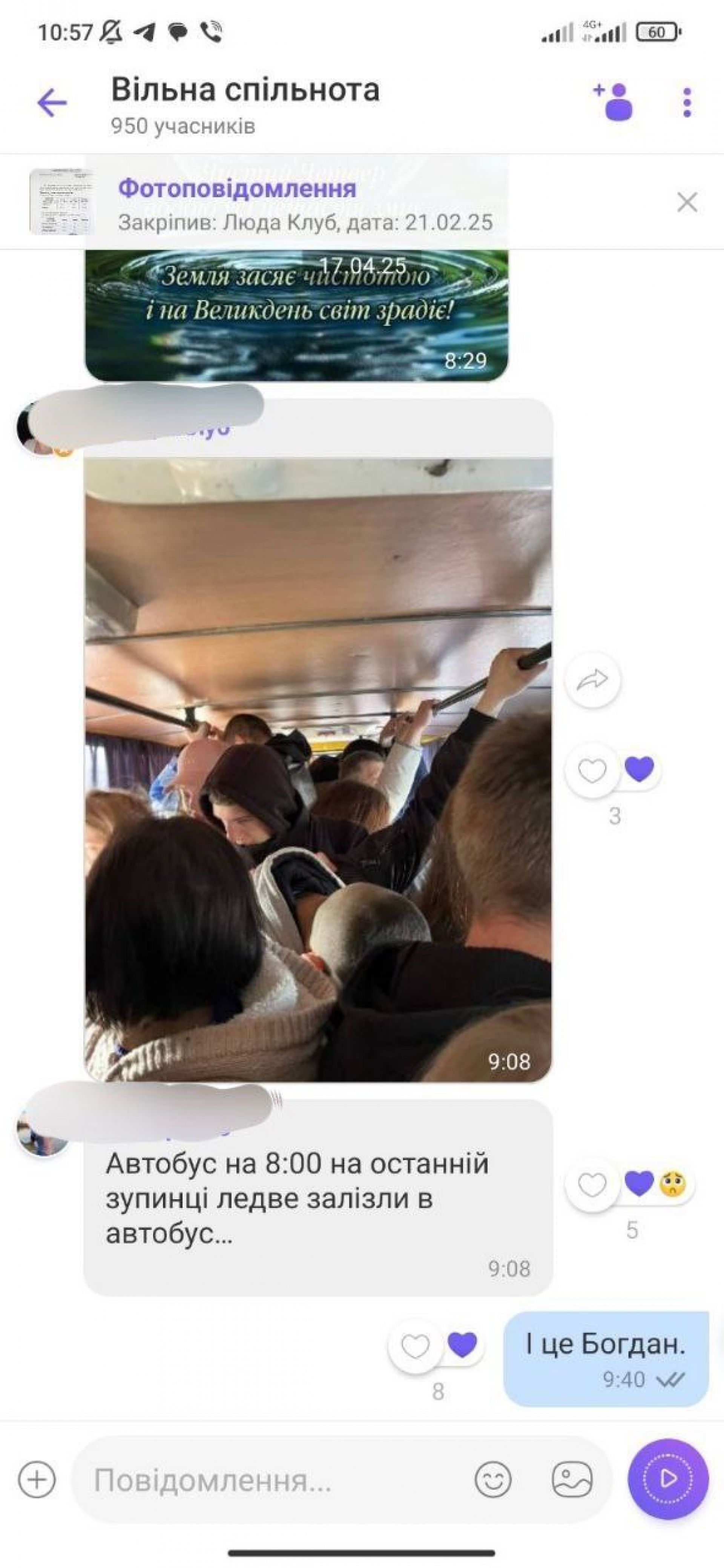 Жінка розповіла, що вони вже зверталися до департаменту транспорту, зустрічалися з перевізником, але всі лише «годує обіцянками». Кажуть, що проводять моніторинг, але мешканці за цей час самі зафіксували ситуацію: робили фото, скільки людей їздить і коли саме.