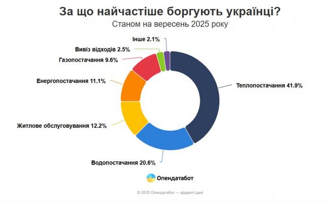 Левова частка заборгованостей стосується теплопостачання — 330 236 випадків (42%). Наслідують борги за воду — 162 455 (21%) та житлове обслуговування — 96 265 (12%). Також значні борги є за енергопостачання (87 708) та газ (75 522).