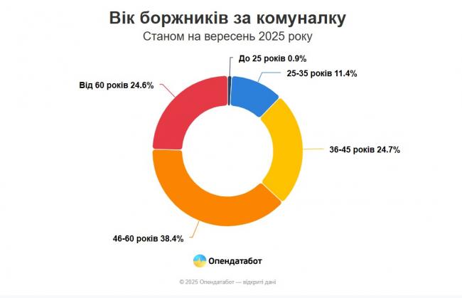 Основний тягар комунальних боргів припадає на людей у віці 46-60 років — 302,8 тисячі проваджень (38%). На другому місці група 36-45 років із 194,7 тис. провадженнями (25%). Майже стільки ж боргів у людей старших за 60 років — 194,1 тисячі (25%).