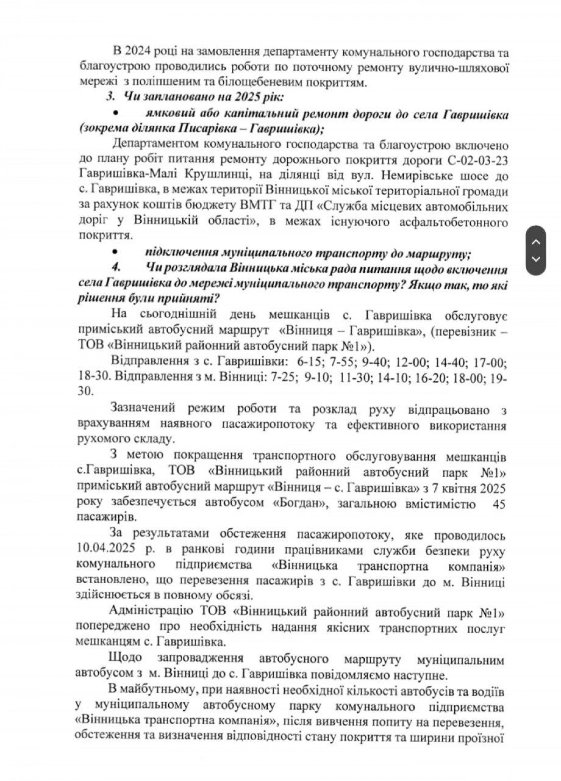 Щодо муніципального транспорту, то у Вінницькій міській раді підтвердили, що на сьогоднішній день мешканців Гавришівки обслуговує приміський автобусний маршрут «Вінниця – Гавришівка», який виконує ТОВ «Вінницький районний автобусний парк №1». З 7 квітня 2025 року на маршруті працює автобус «Богдан» на 45 пасажирів. Після дослідження пасажиропотоку, проведеного 10 квітня, встановили, що всі потреби громади забезпечуються повністю.