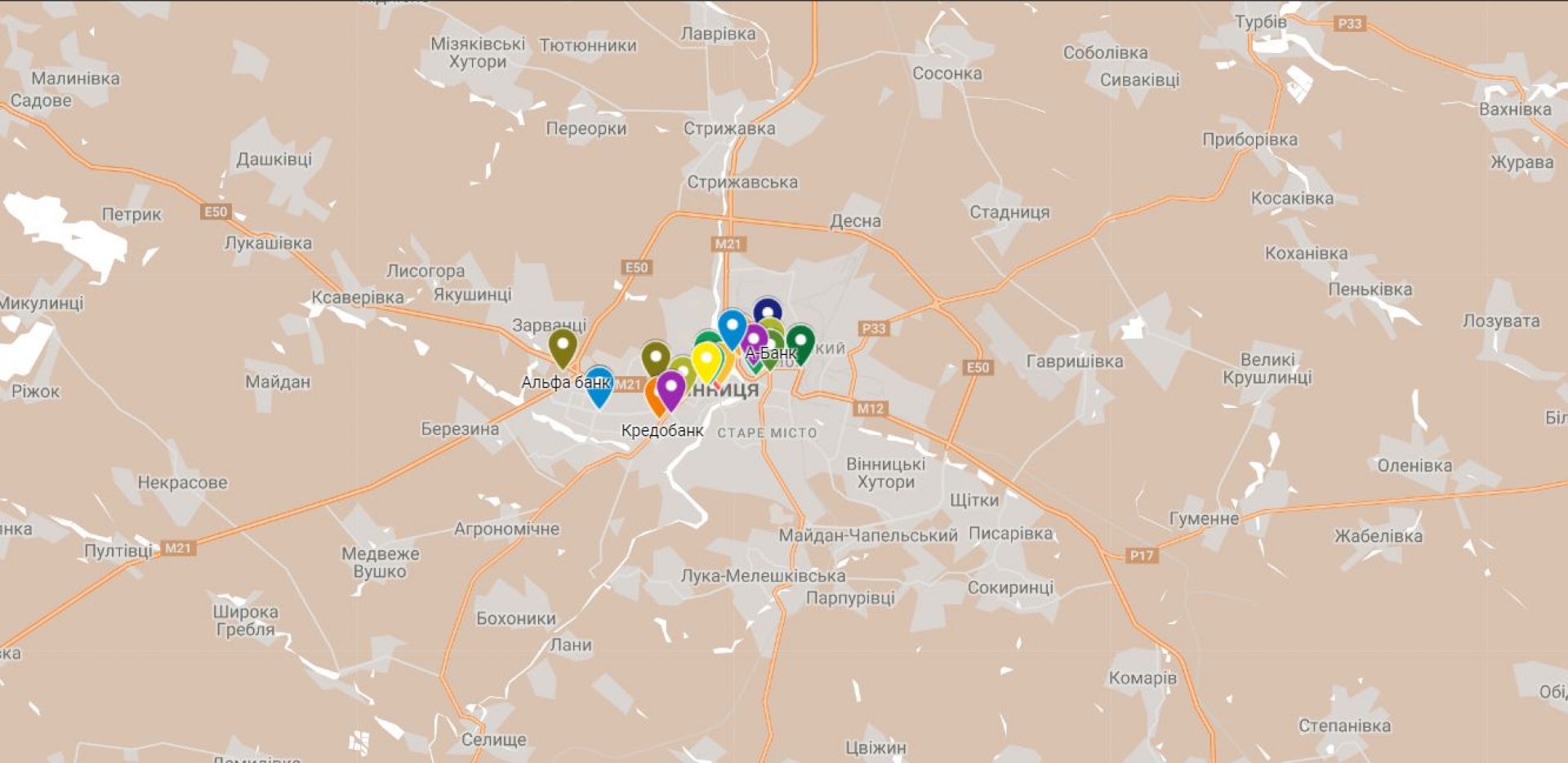 Наразі на карті нанесений 21 банк Вінниці, який продовжує при відключенні обслуговувати клієнтів. Розміщені установи у різних куточках міста.