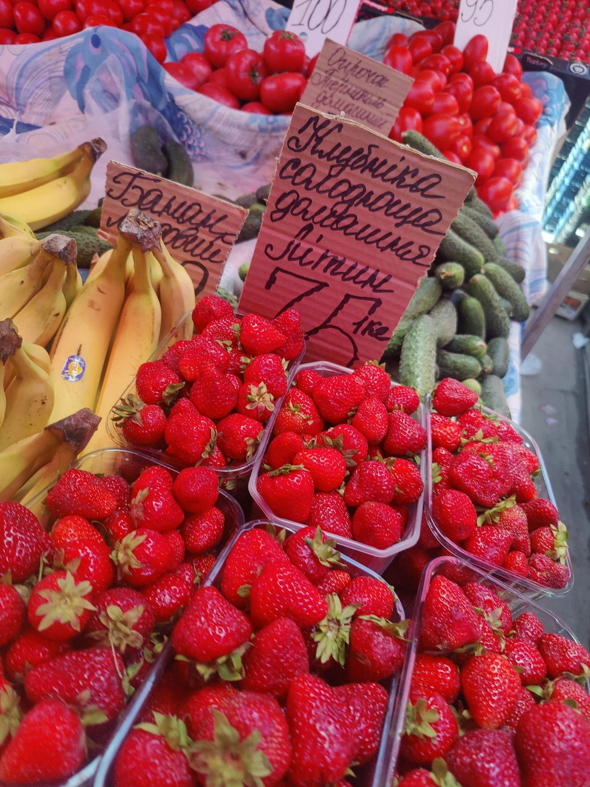 Огірки 53-55 грн, полуниця 65-75 грн, банани по 50 грн, редис 40 грн. За кілограм помідорів просять 75 грн.