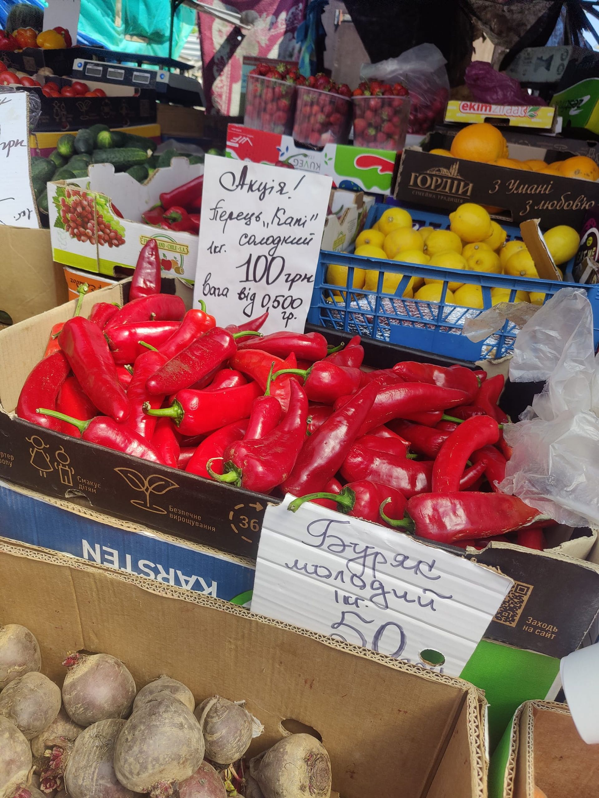 «Порівняно з супермаркетами, ціни — більш-менш, був сьогодні на Привокзальному, пошкодував, що велосумка мала і гаманець теж. Різниця на овочах і грибах 20-30 грн на кіло, мабуть, таки суттєва. Зрозуміло, що живу у віддаленому районі (Академічний), але може трохи цінову політику переглянути. Я розумію, коли ти пізно ввечері вертаєшся з роботи, альтернативи немає, ти купуєш, що треба — помідори по 100, замість 65, огірки по 90 замість 50, капусту по 70 замість 40. Ну і печериці по 100 замість 65... Перці, то окрема тема. Тому ціни Привокзального виграють у першому турі».