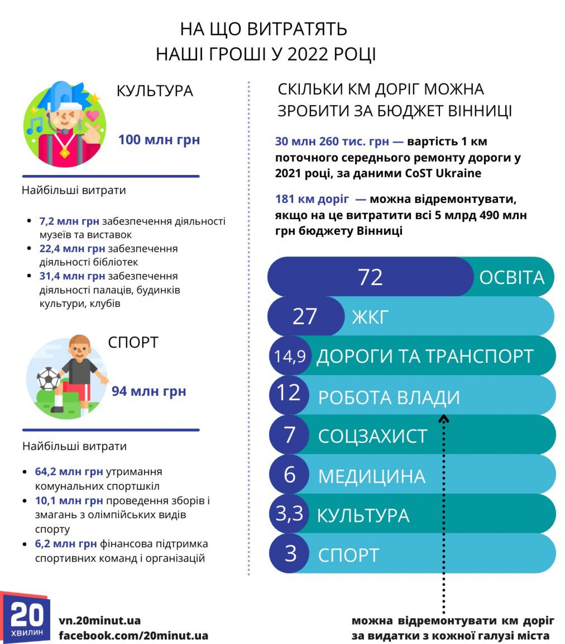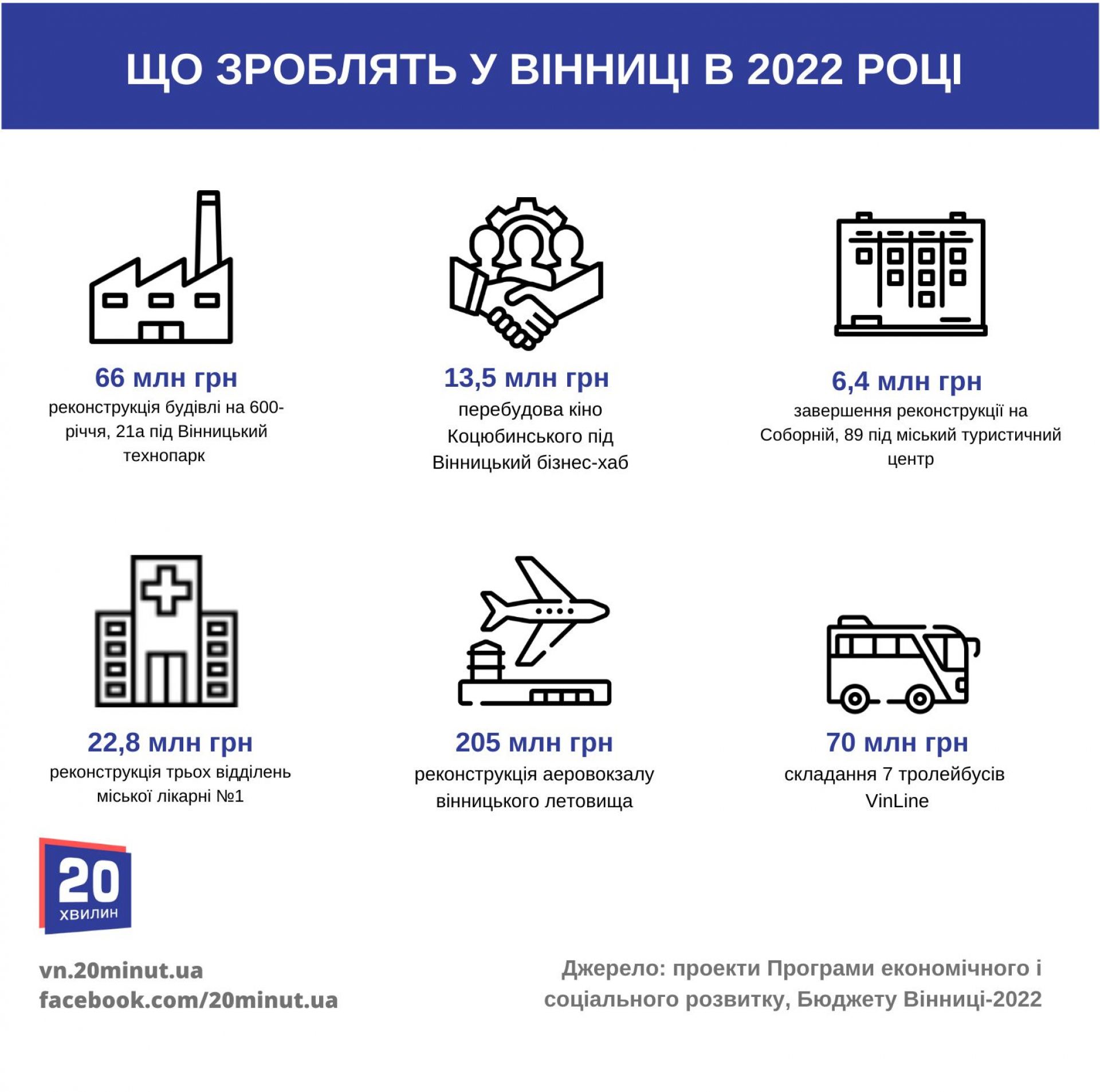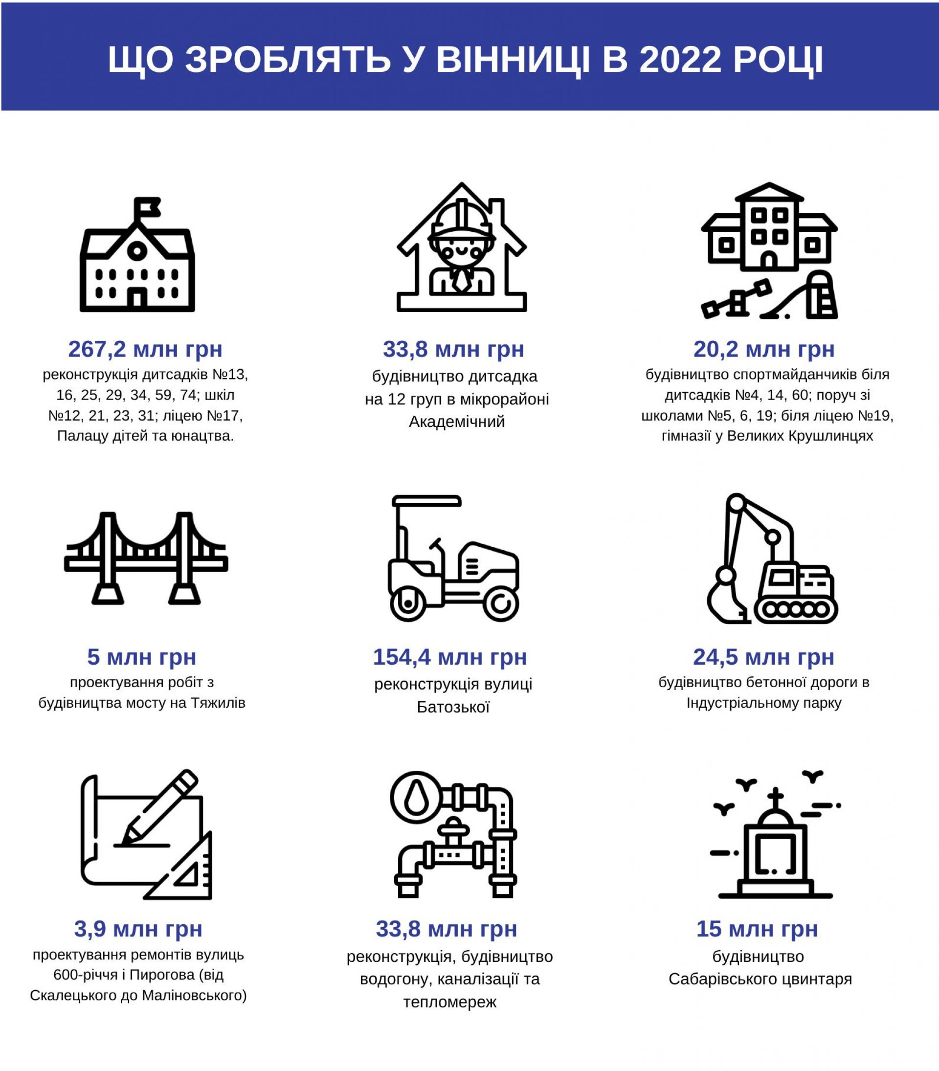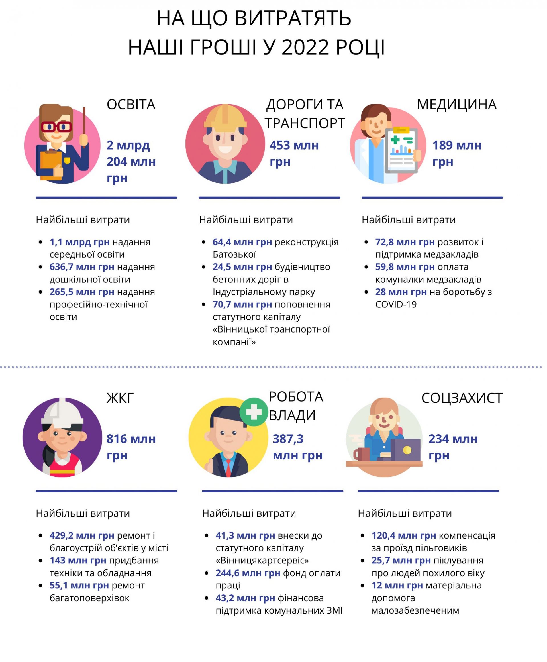 Бюджет Вінниці на 2022 рік складе 5 млрд 493,7 млн грн. Загальні видатки з бюджету складатимуть 5 млрд 767 млн грн. Джерелом покриття різниці між доходами та витратами стануть кредити, які мерія планує брати у 2022 році.