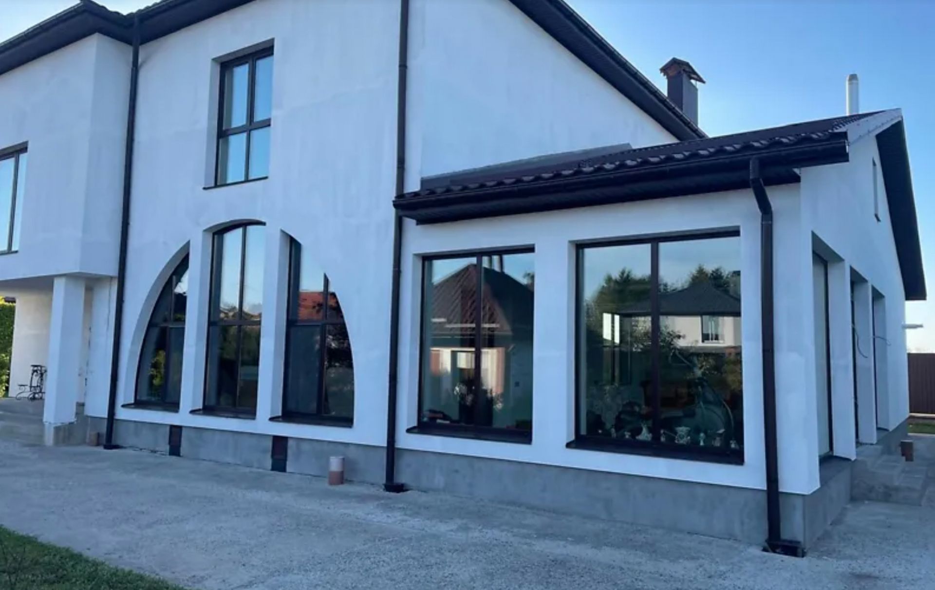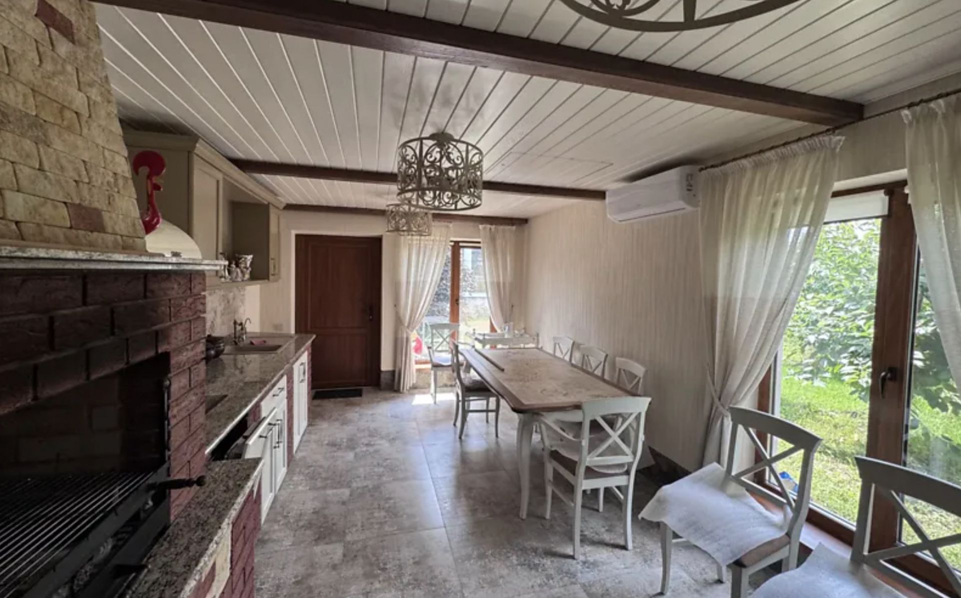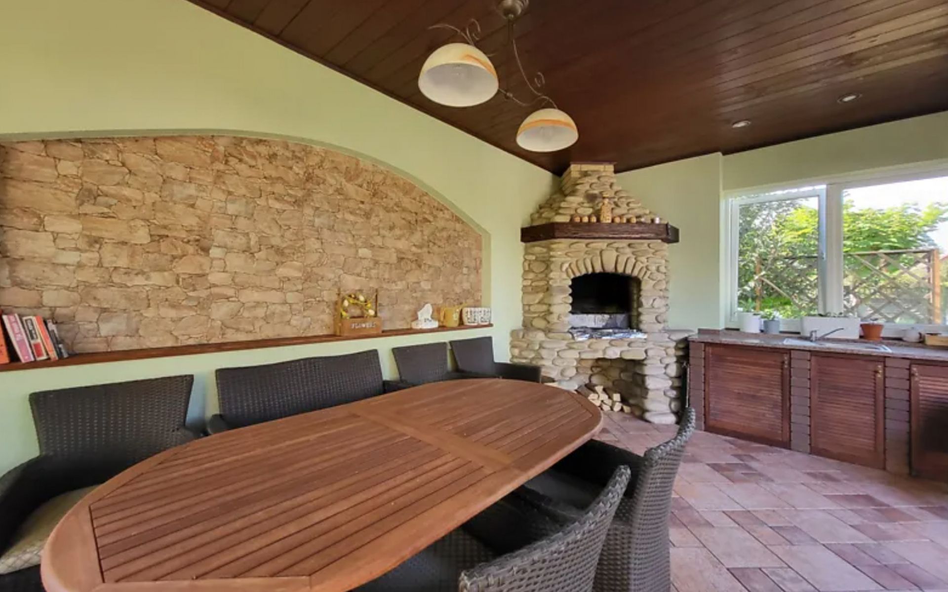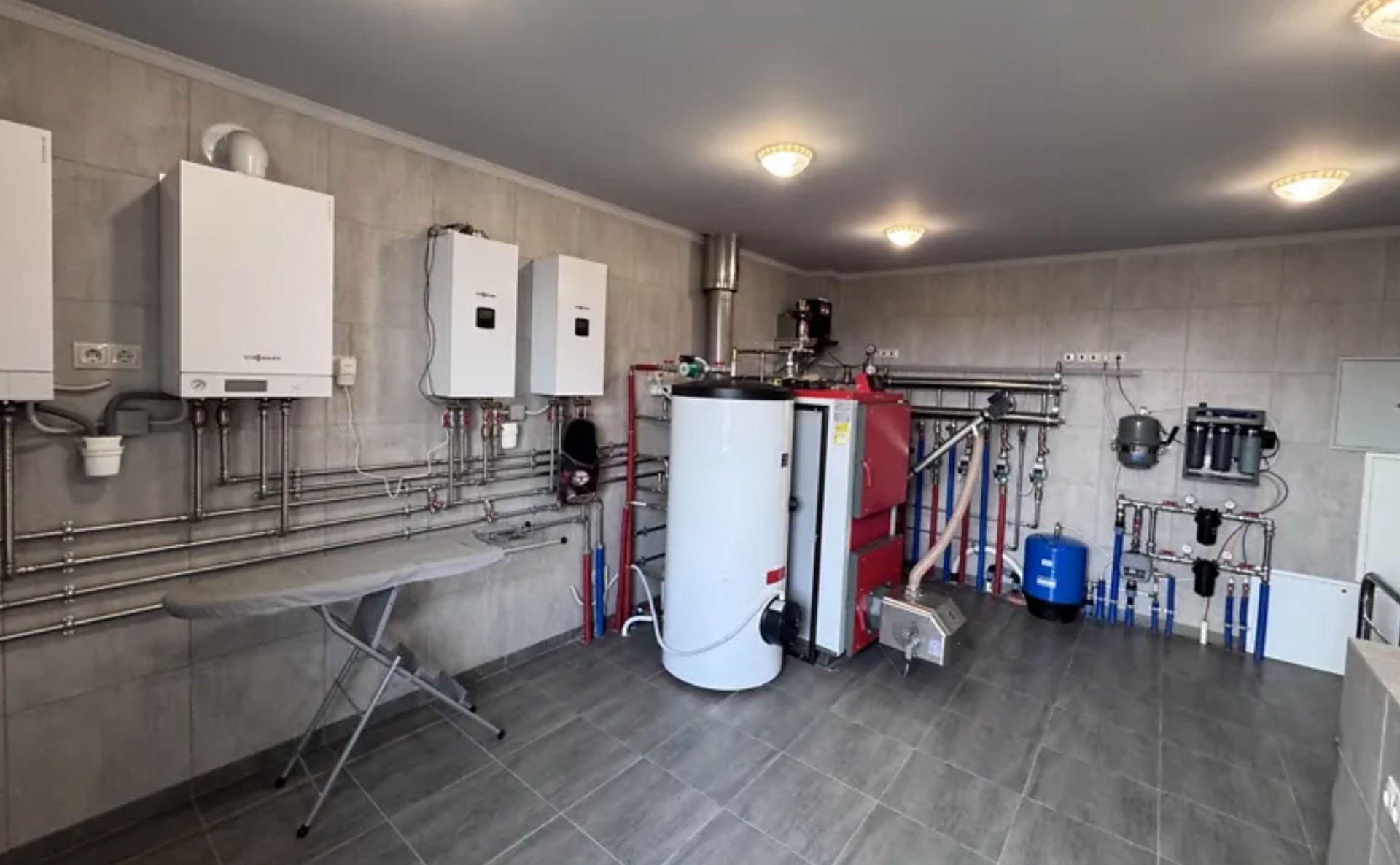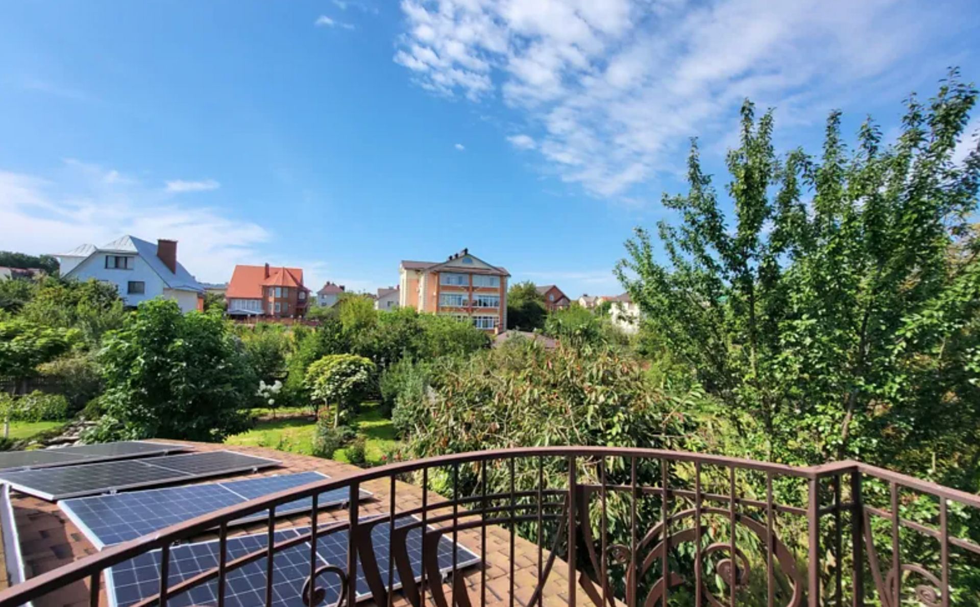 Будинок площею 450 м² розташований біля лісу та оснащений сучасними інженерними рішеннями. Тут встановлена система очищення води, свердловина, а також сонячна електростанція потужністю 6 кВт із можливістю автономного живлення. У будинку є басейн із системою фільтрації, сауна, підігрів підлоги та автоматичний полив газонів.