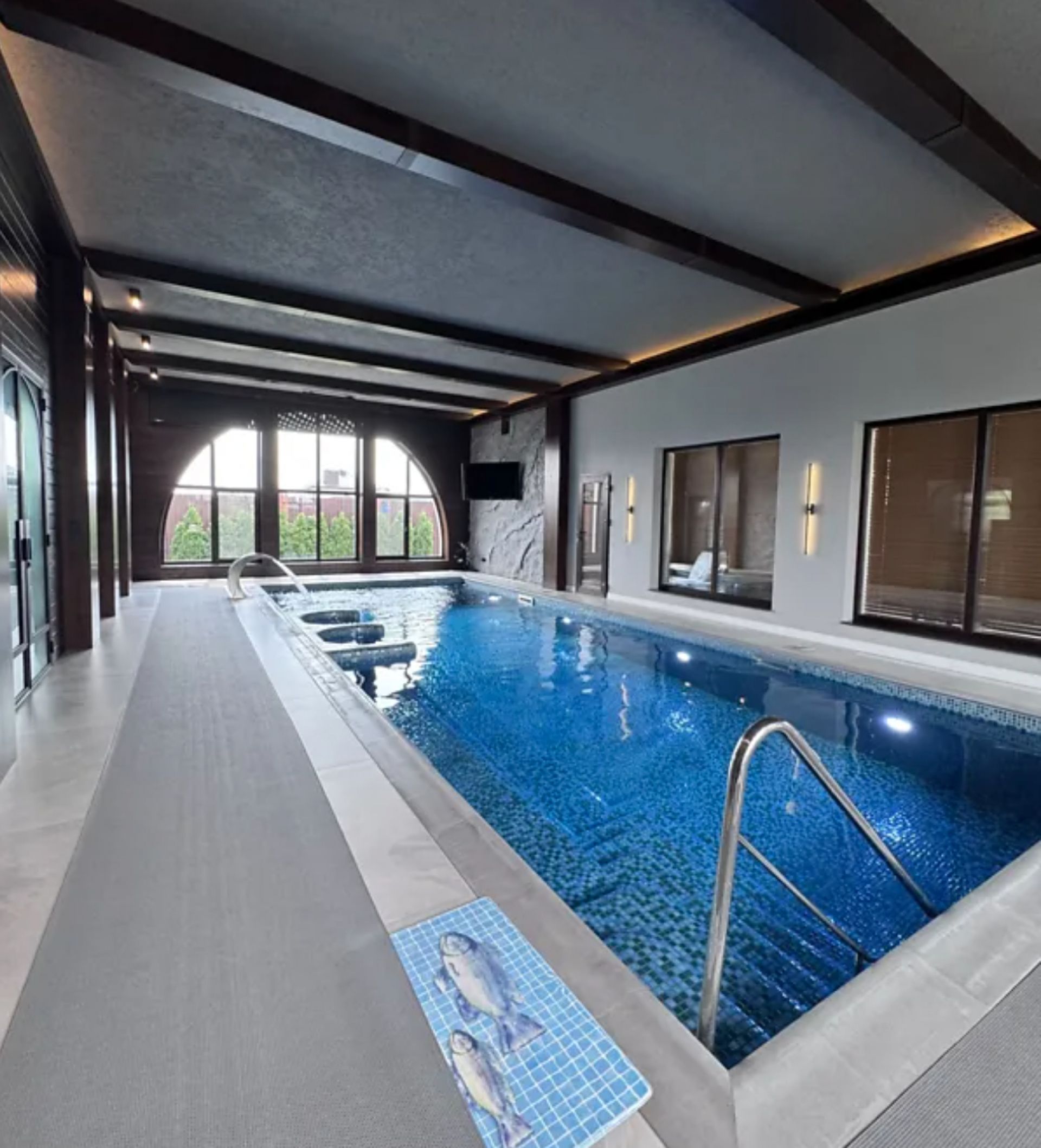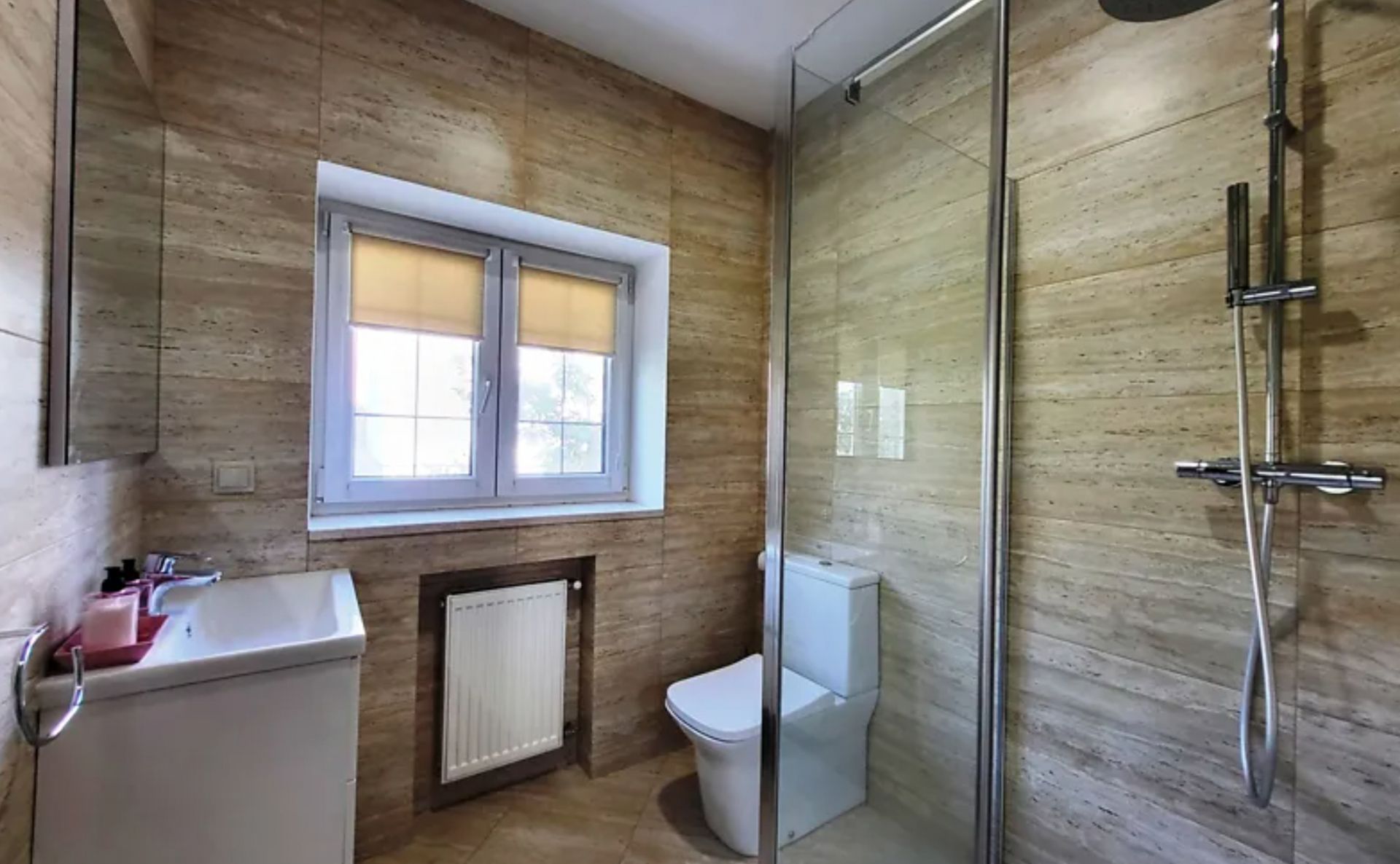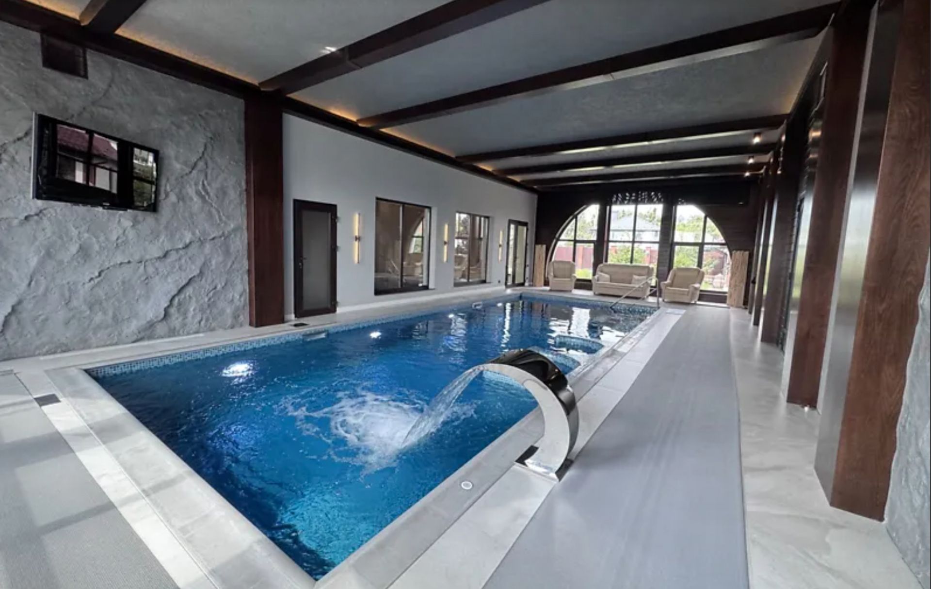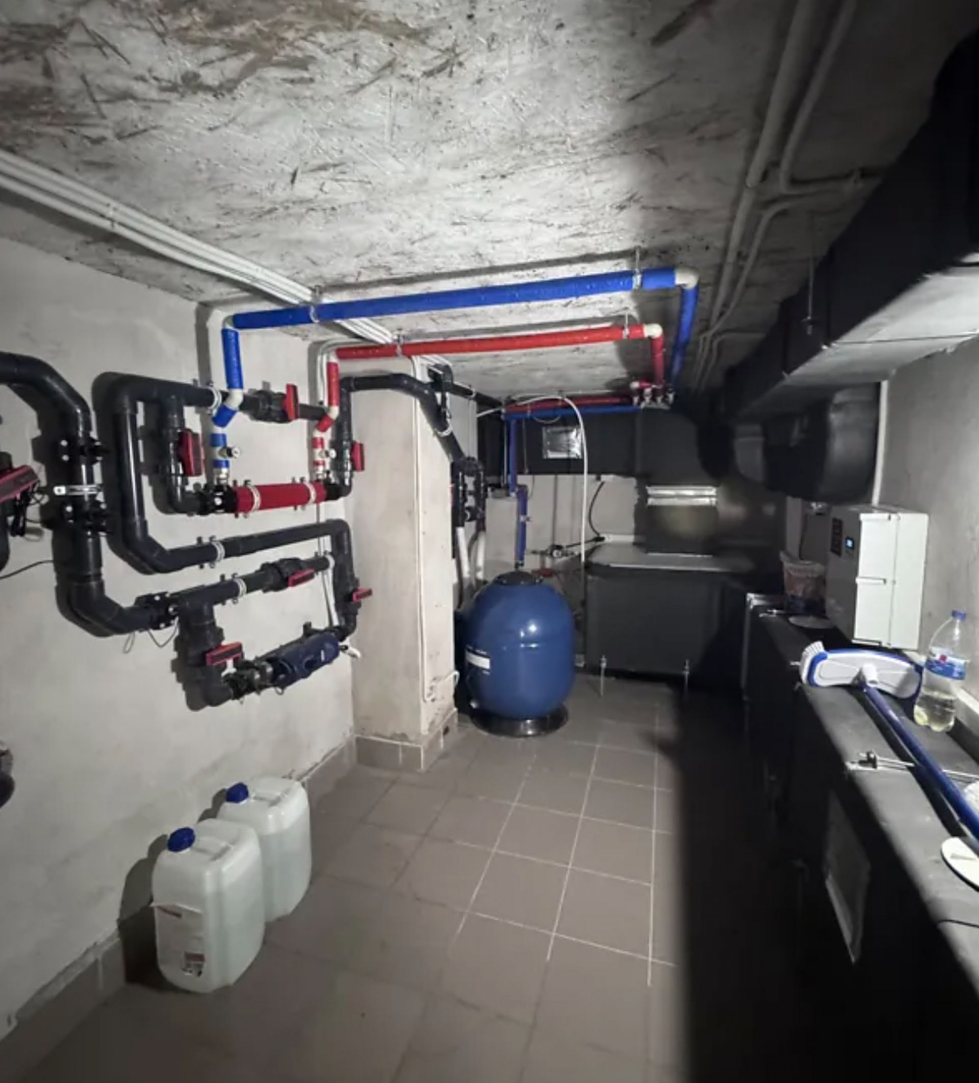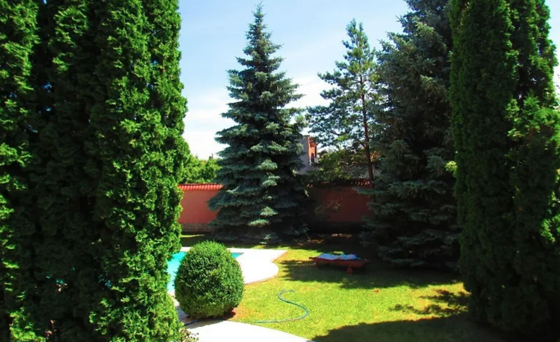 Будинок площею 450 м² розташований біля лісу та оснащений сучасними інженерними рішеннями. Тут встановлена система очищення води, свердловина, а також сонячна електростанція потужністю 6 кВт із можливістю автономного живлення. У будинку є басейн із системою фільтрації, сауна, підігрів підлоги та автоматичний полив газонів.