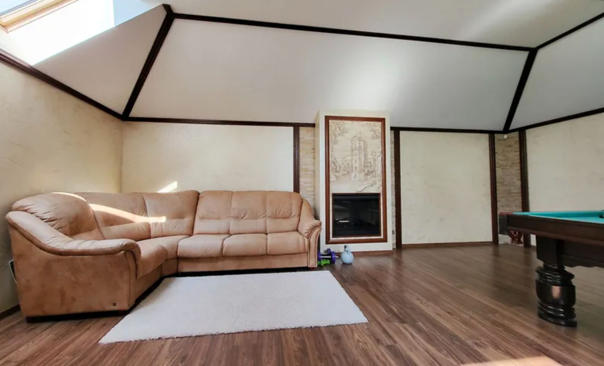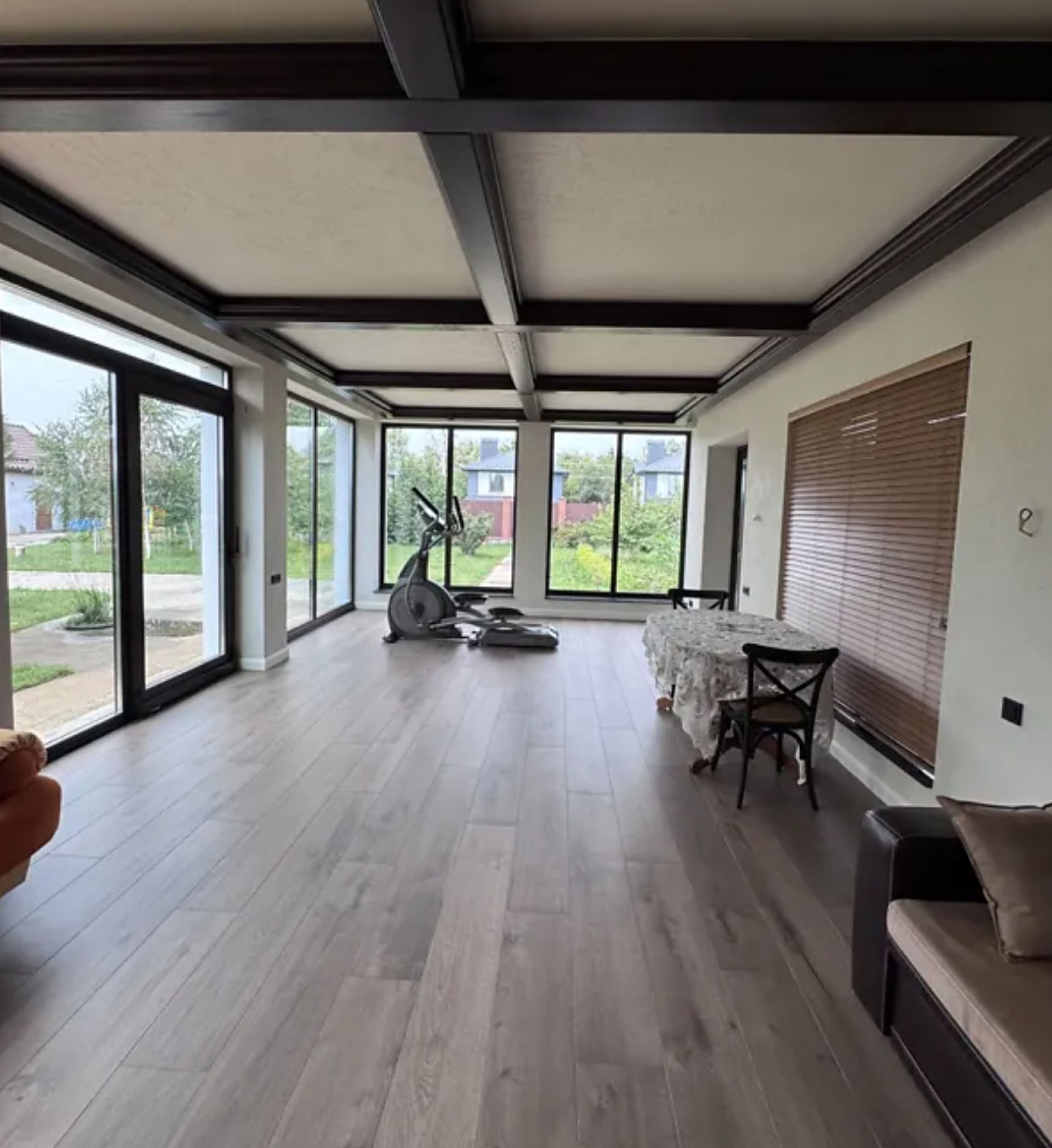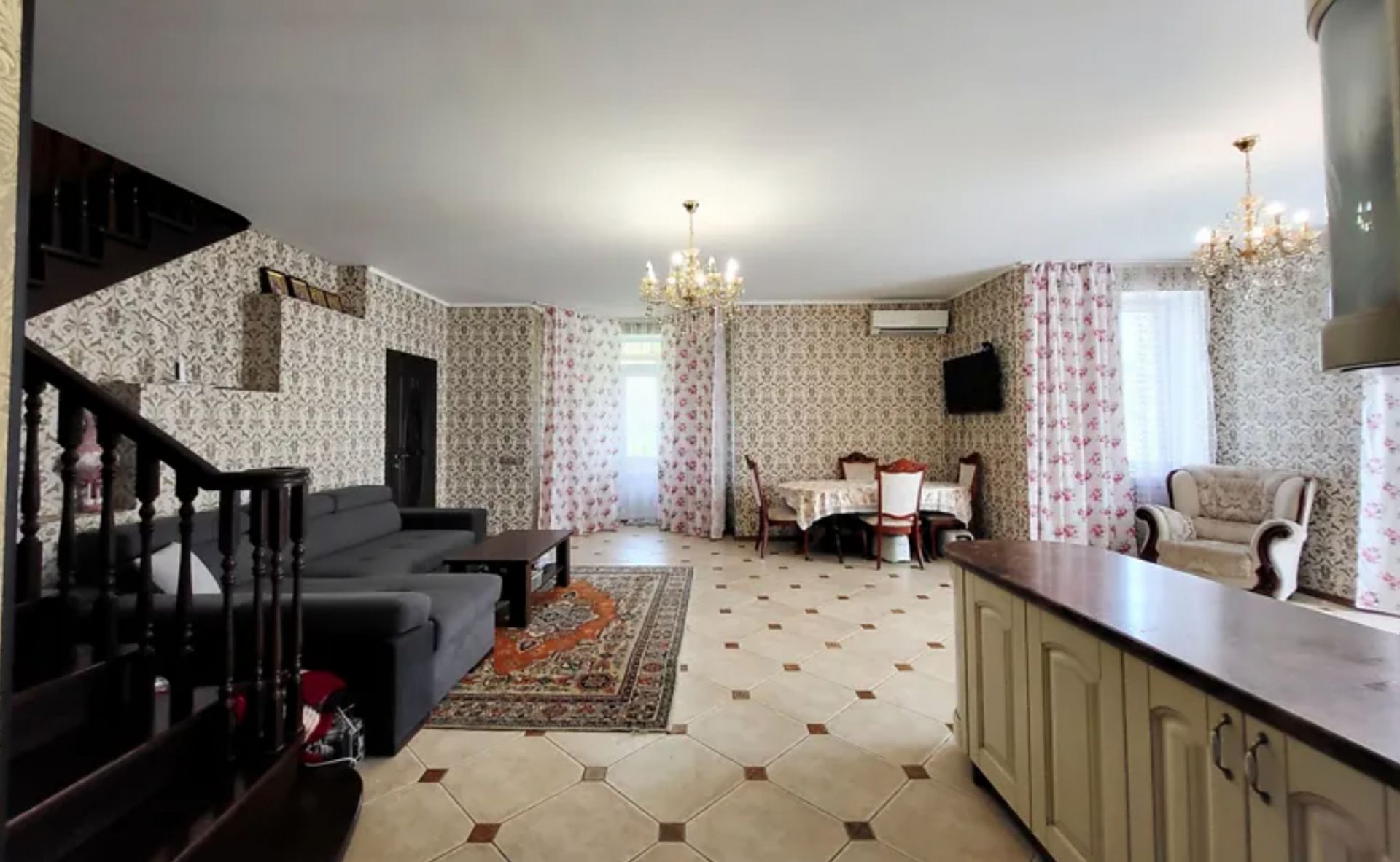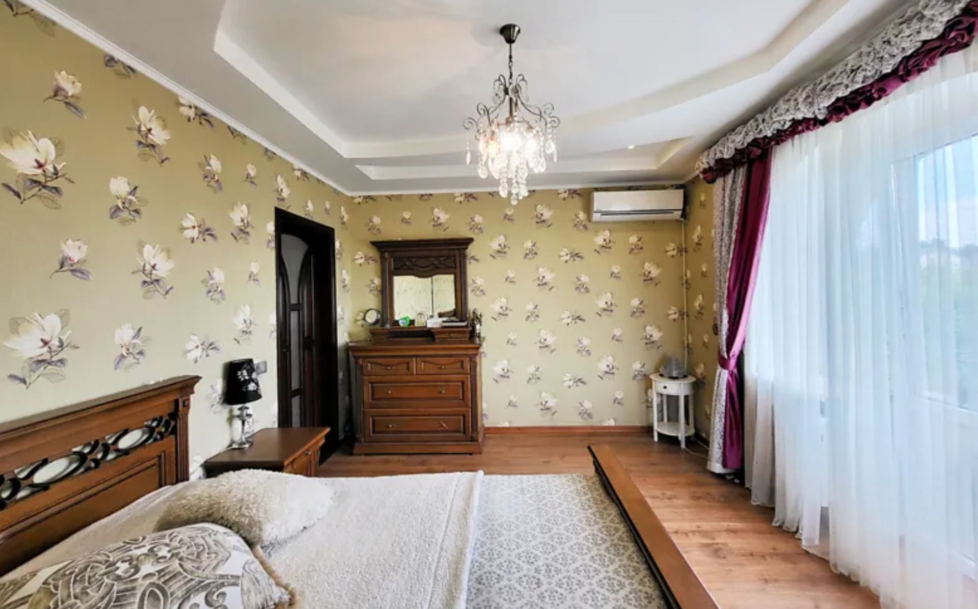 Просторий будинок площею 450 м² має п’ять кімнат, серед яких три спальні, вітальня, кабінет і кухня-студія. Інтер’єр виконаний із якісних матеріалів, а на першому поверсі та в санвузлах облаштована тепла підлога. Додатково є мансарда для відпочинку та підвал із холодною кухонною зоною і спортзалом.