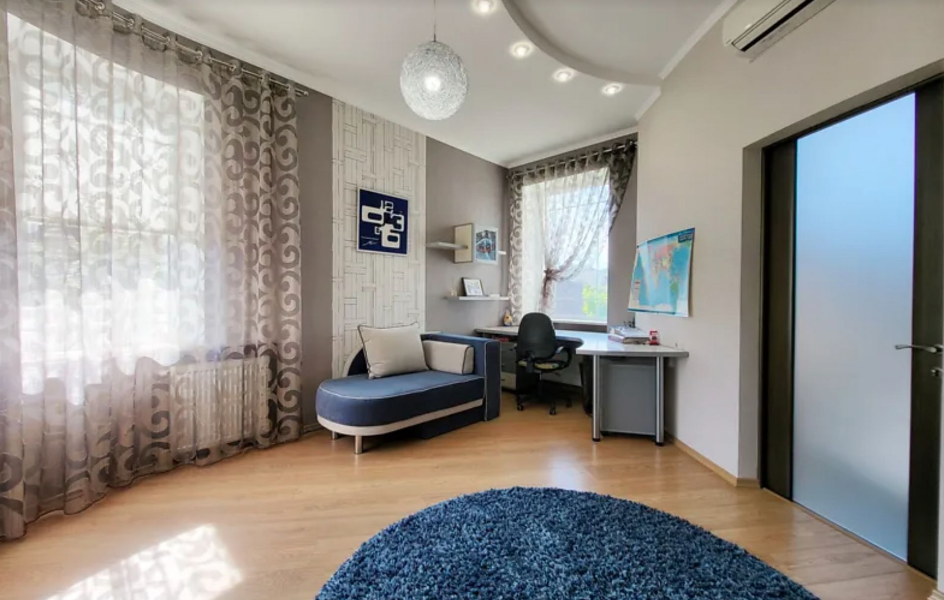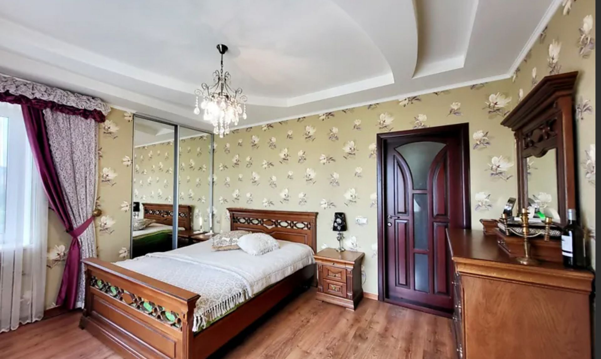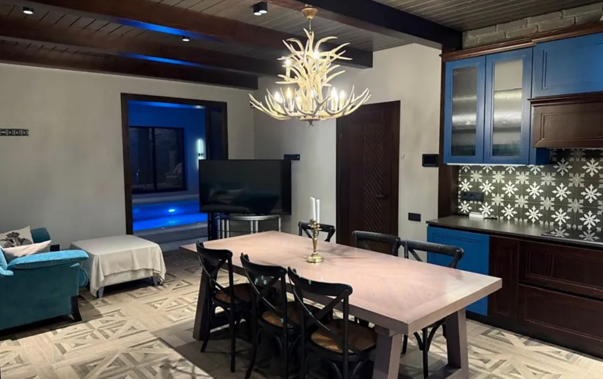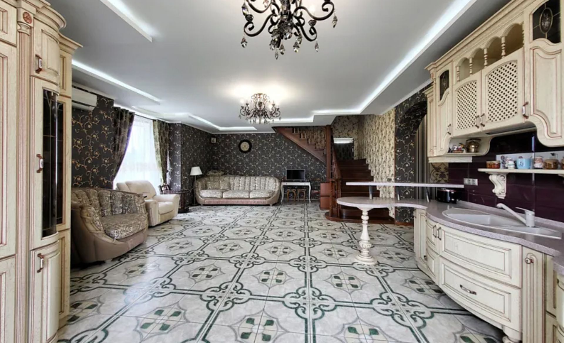 Просторий будинок площею 450 м² має п’ять кімнат, серед яких три спальні, вітальня, кабінет і кухня-студія. Інтер’єр виконаний із якісних матеріалів, а на першому поверсі та в санвузлах облаштована тепла підлога. Додатково є мансарда для відпочинку та підвал із холодною кухонною зоною і спортзалом.