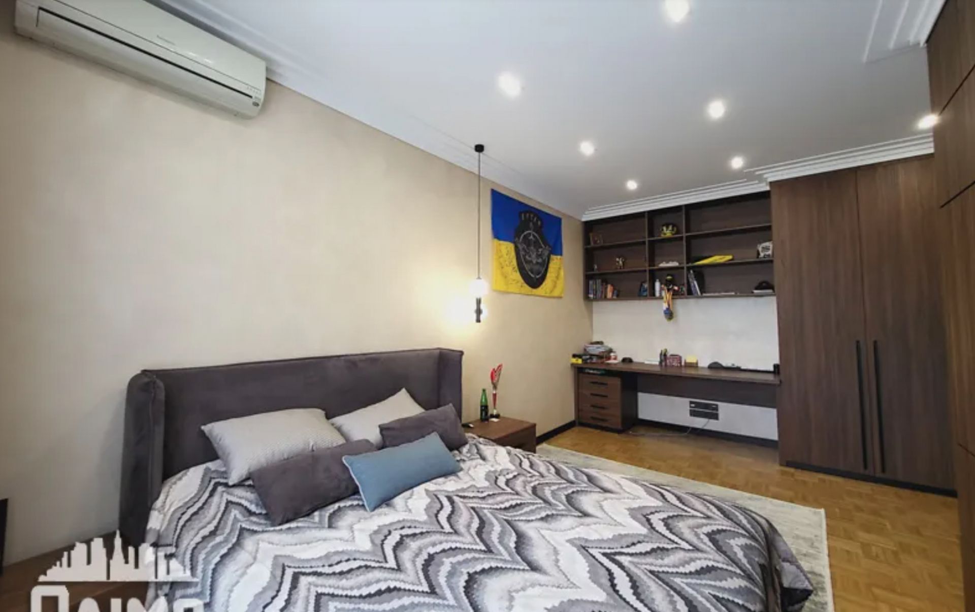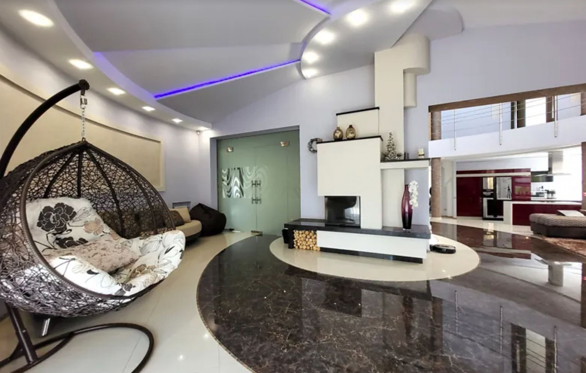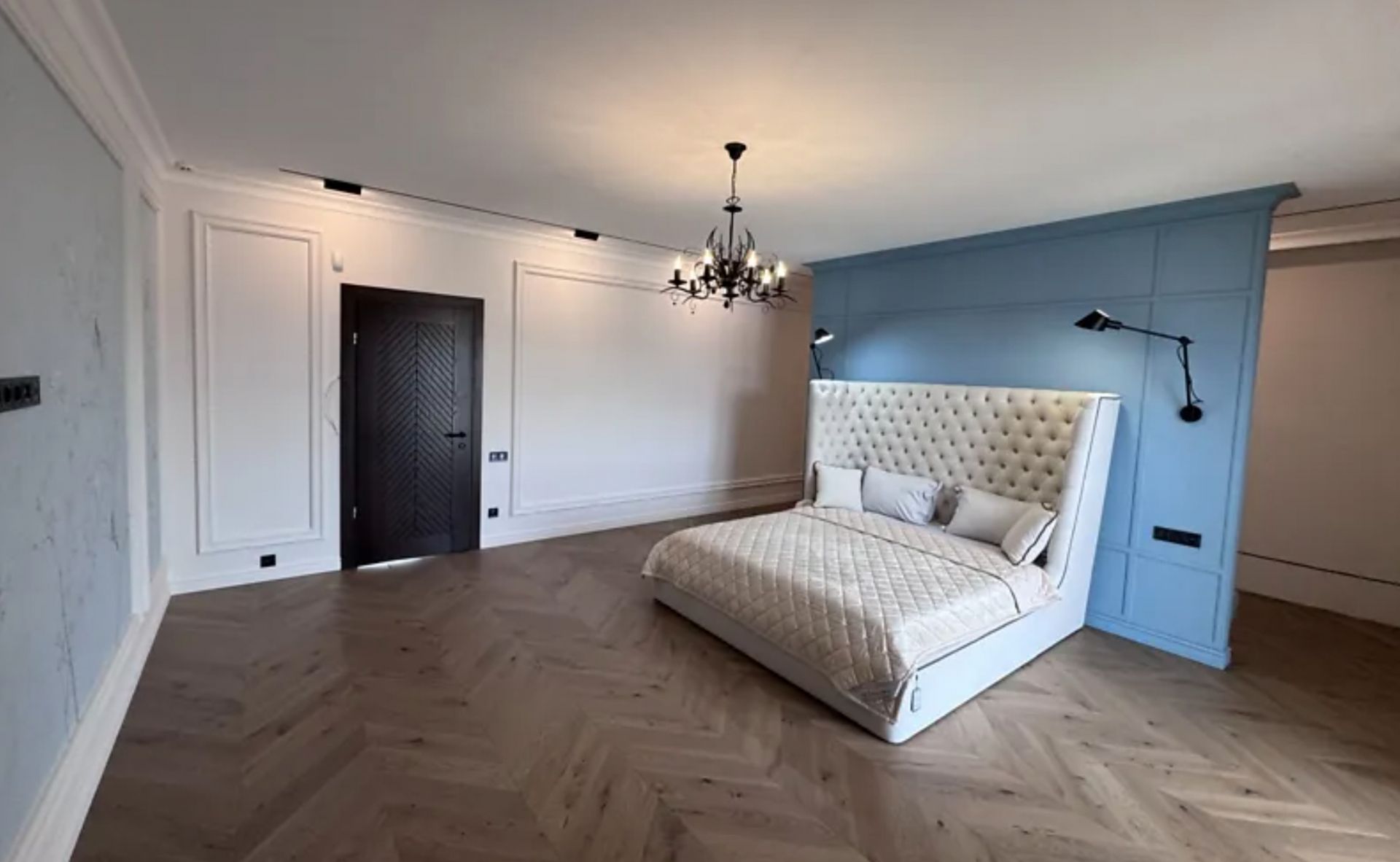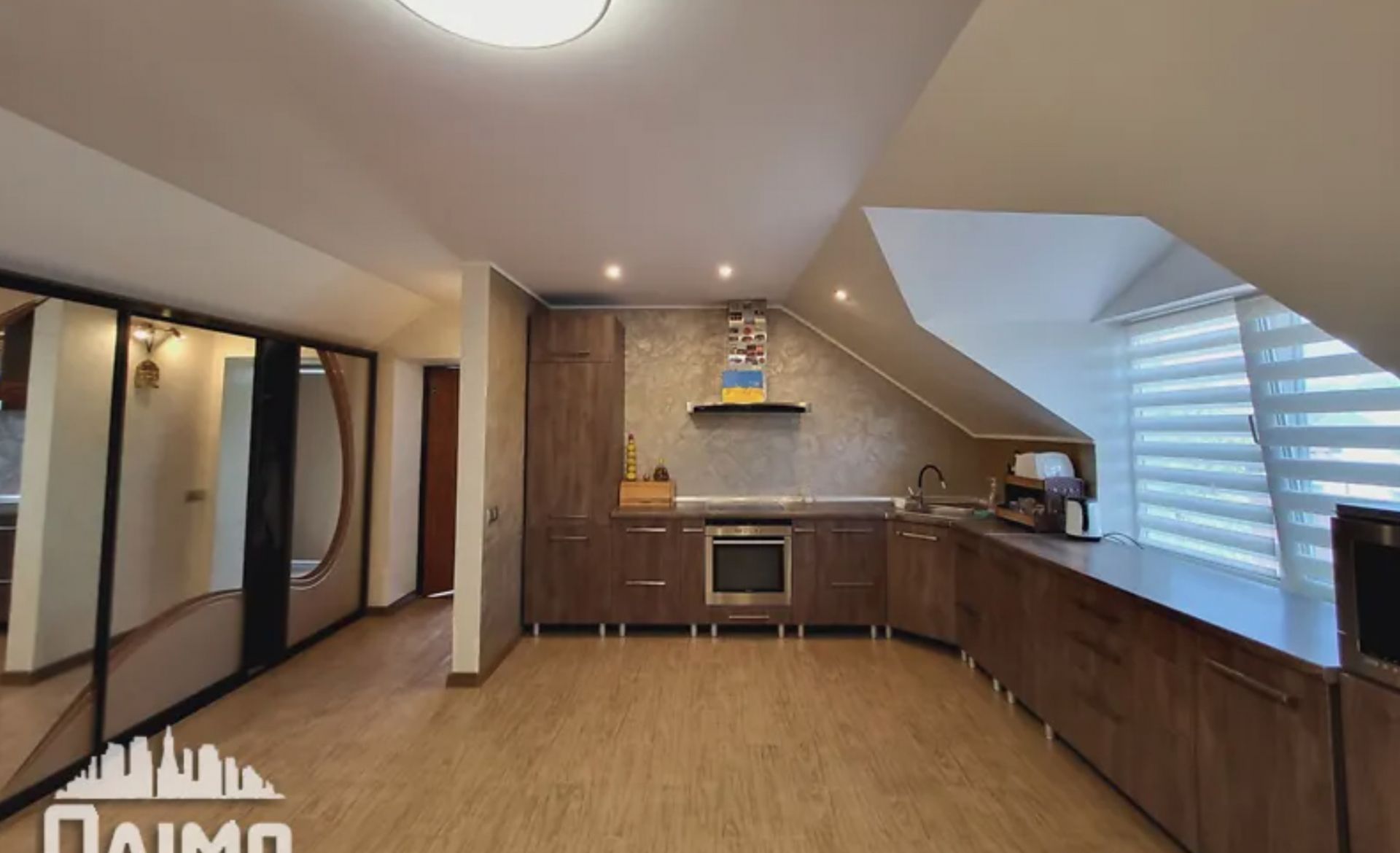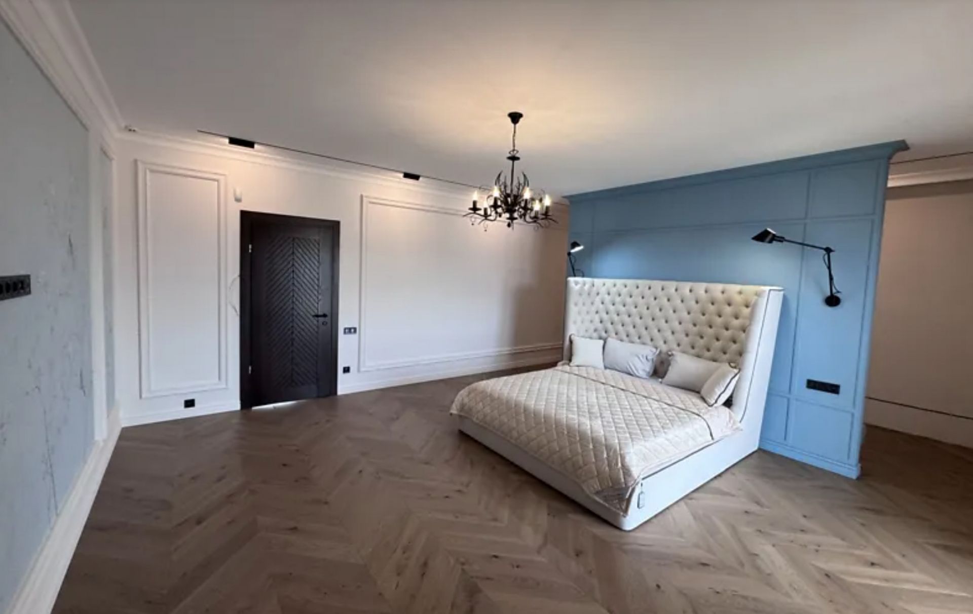 Просторий будинок площею 450 м² має п’ять кімнат, серед яких три спальні, вітальня, кабінет і кухня-студія. Інтер’єр виконаний із якісних матеріалів, а на першому поверсі та в санвузлах облаштована тепла підлога. Додатково є мансарда для відпочинку та підвал із холодною кухонною зоною і спортзалом.