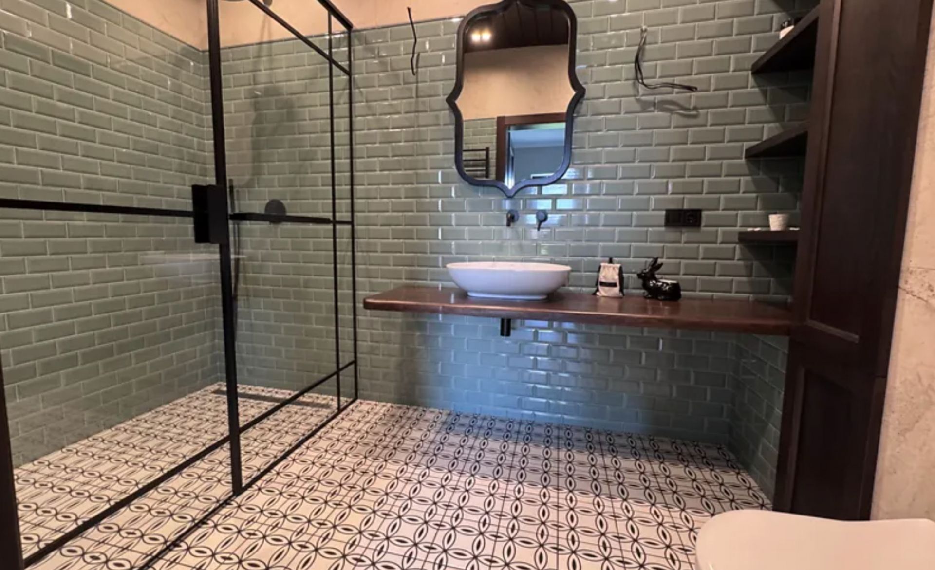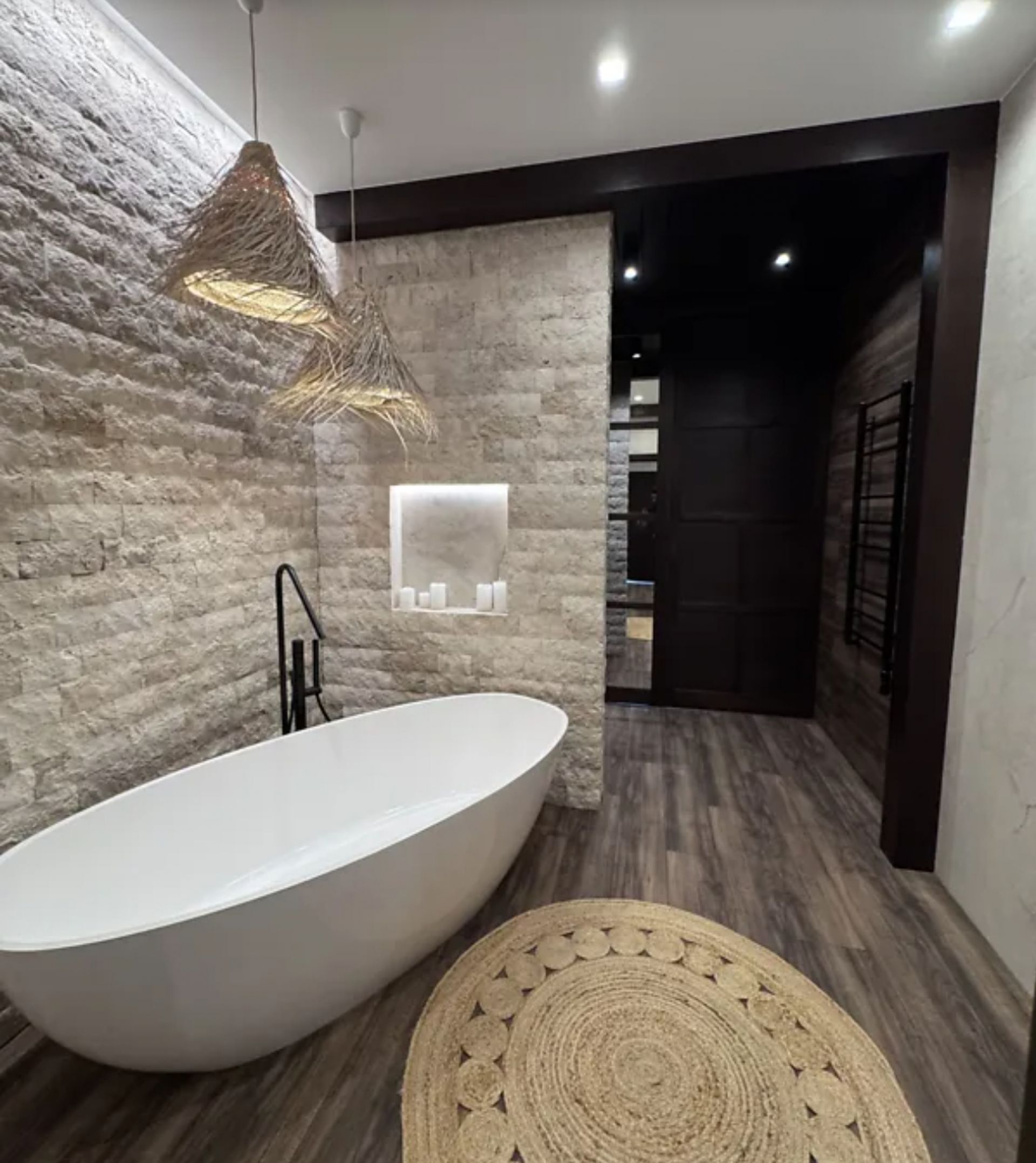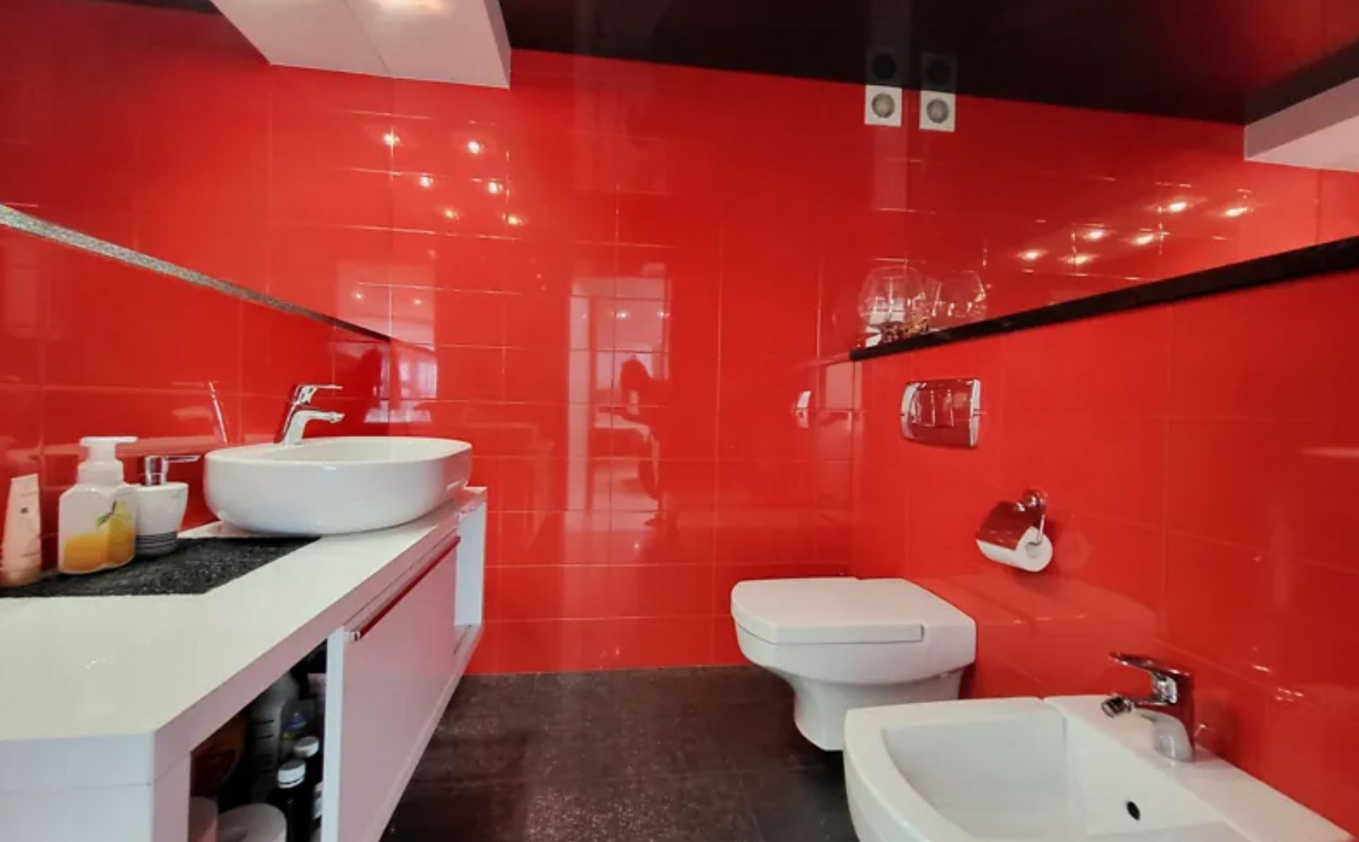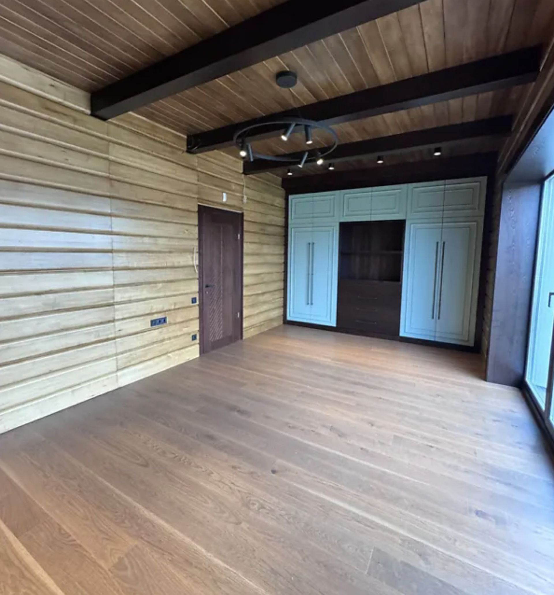 Просторий будинок площею 450 м² має п’ять кімнат, серед яких три спальні, вітальня, кабінет і кухня-студія. Інтер’єр виконаний із якісних матеріалів, а на першому поверсі та в санвузлах облаштована тепла підлога. Додатково є мансарда для відпочинку та підвал із холодною кухонною зоною і спортзалом.
