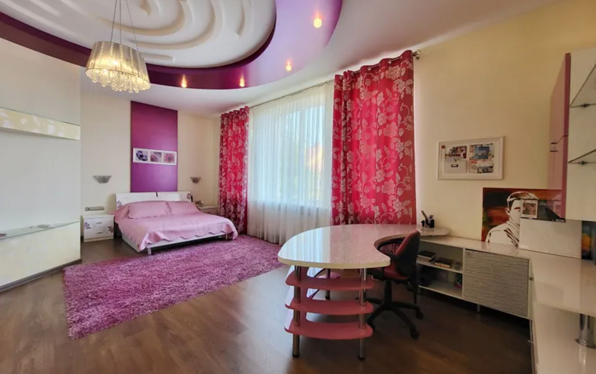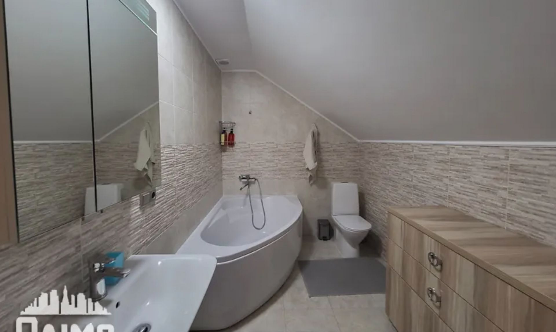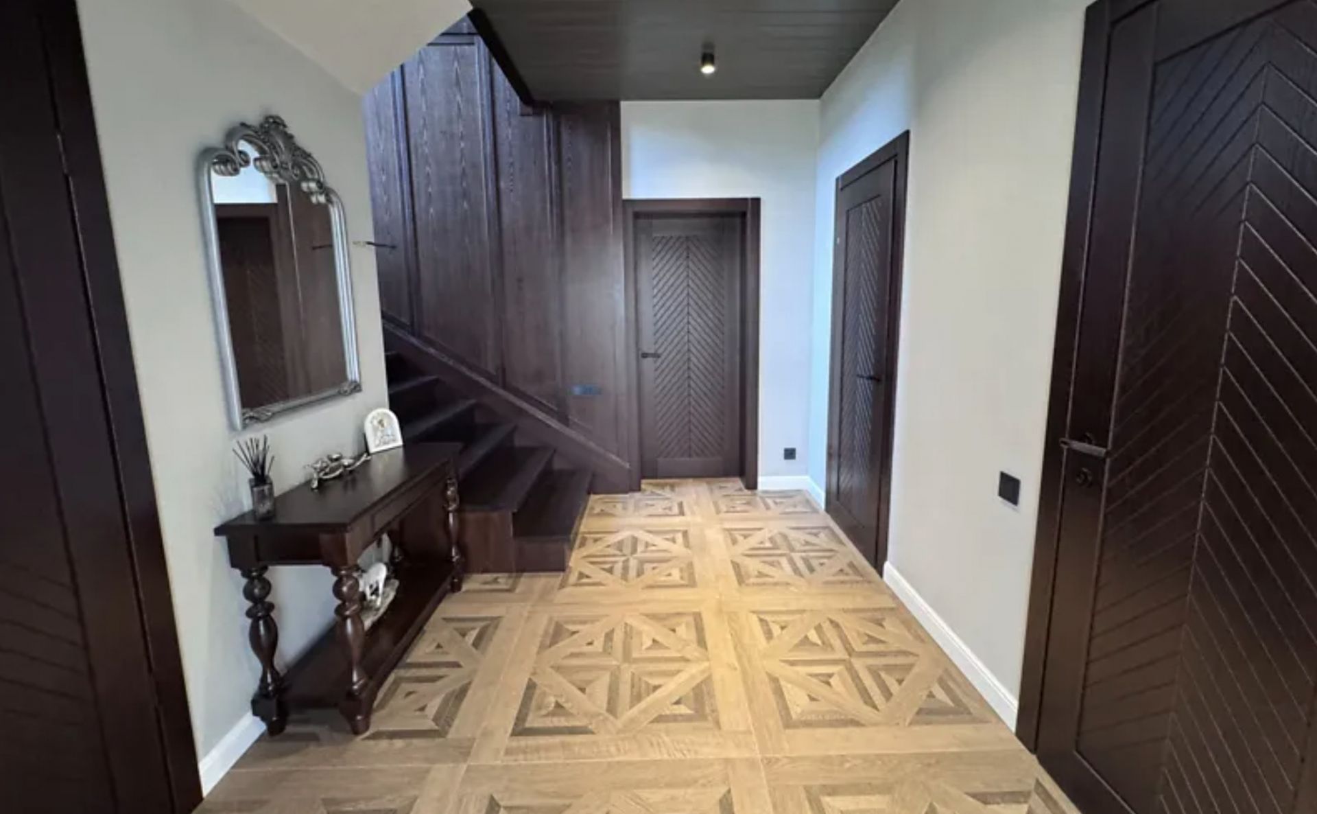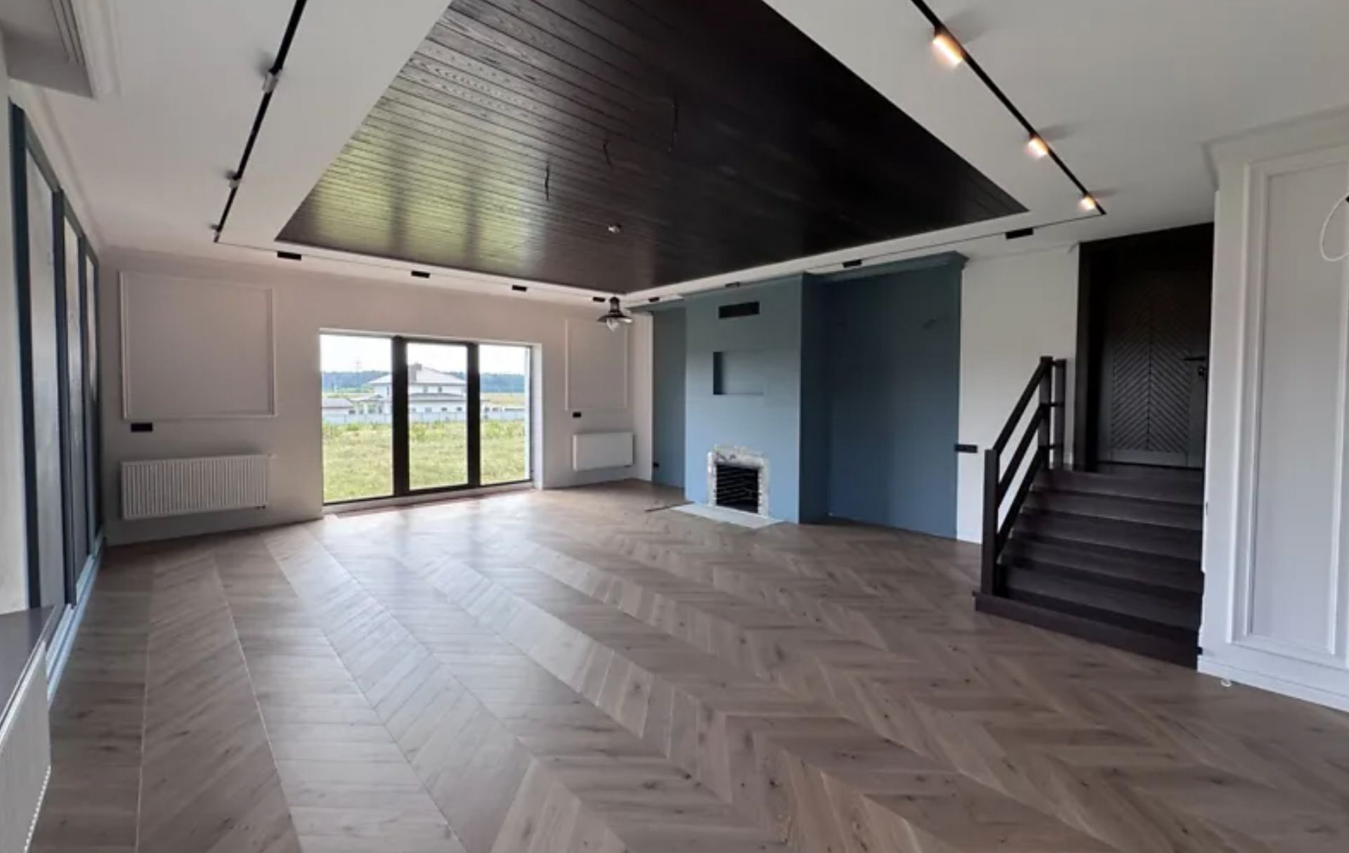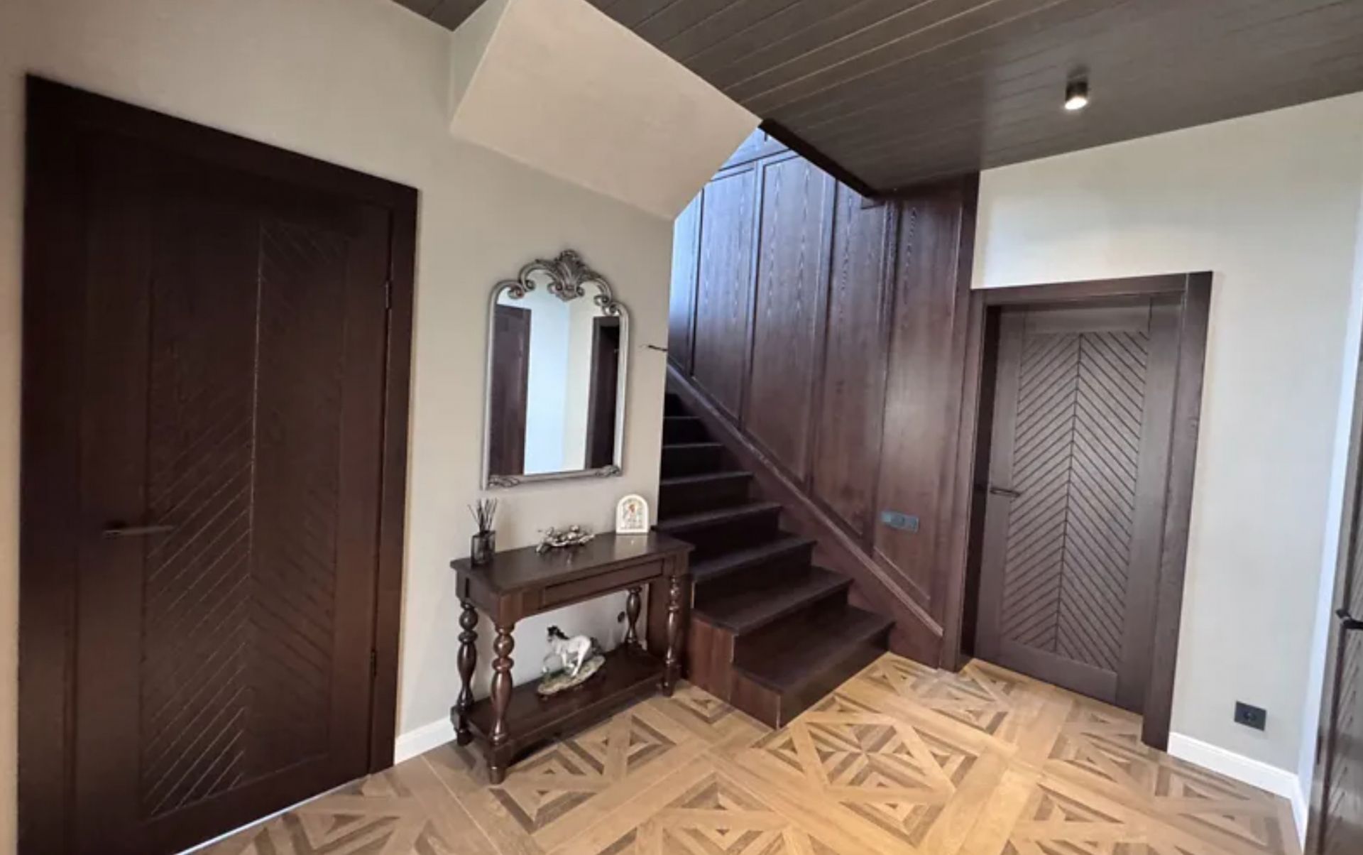 Цей будинок площею 495 м² розташований у престижному районі біля лісу та збудований за індивідуальним проєктом із використанням сучасних технологій. У ньому два житлові поверхи та цоколь, загалом передбачено п’ять житлових кімнат, серед яких три спальні та кабінет. Усередині облаштовані сауна, басейн, три санвузли, гардеробна і комора, що формує повноцінний простір для комфортного проживання.