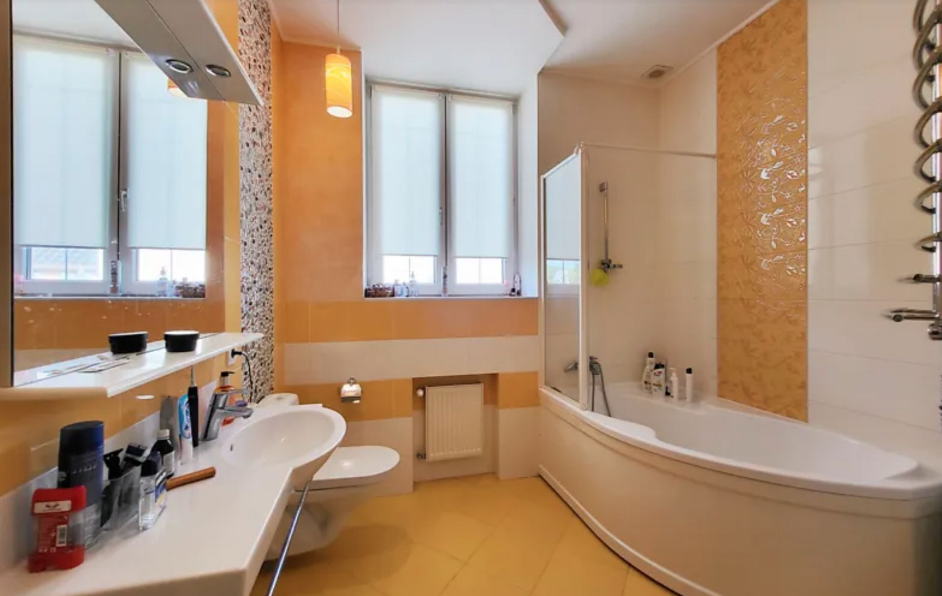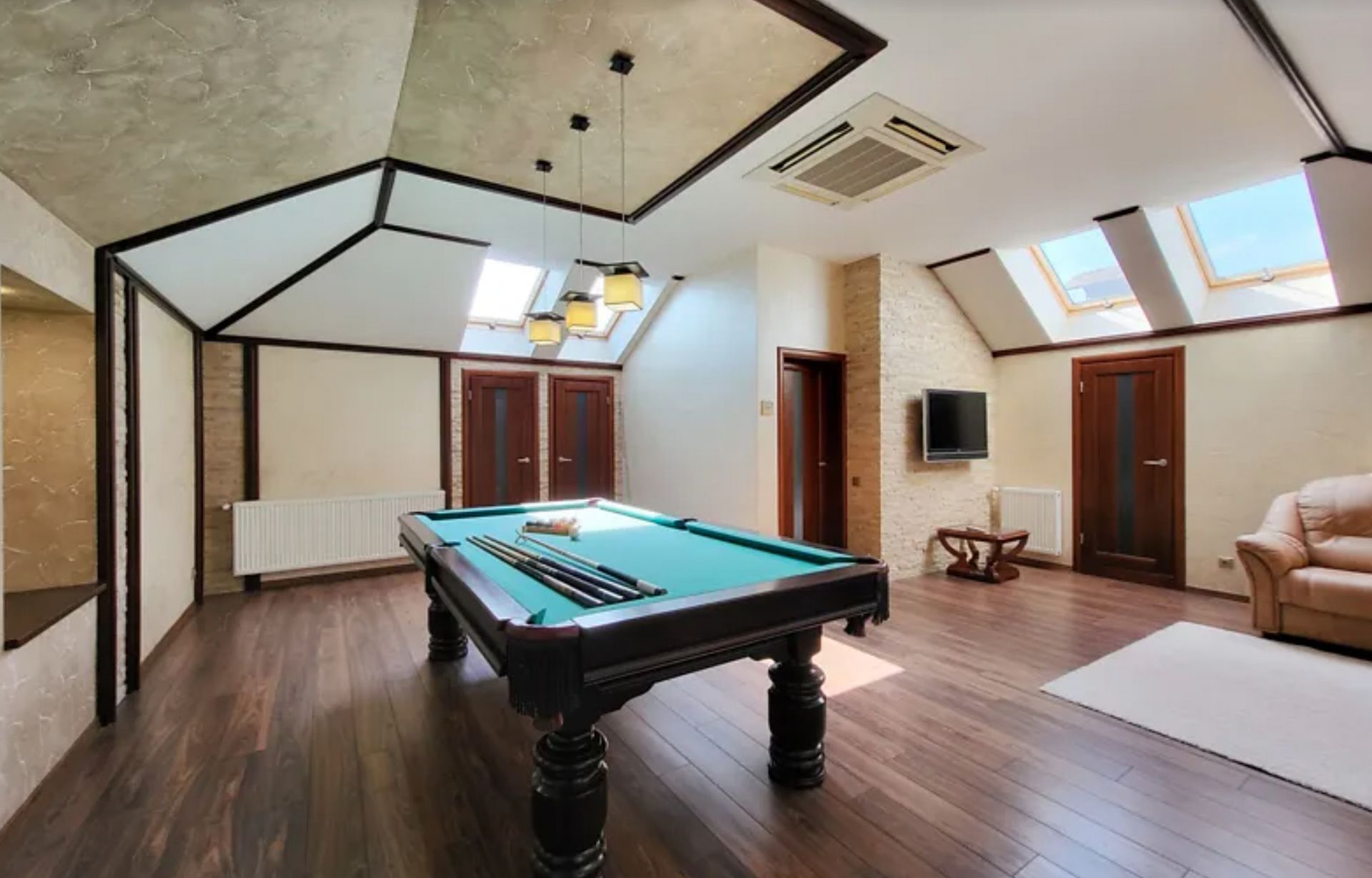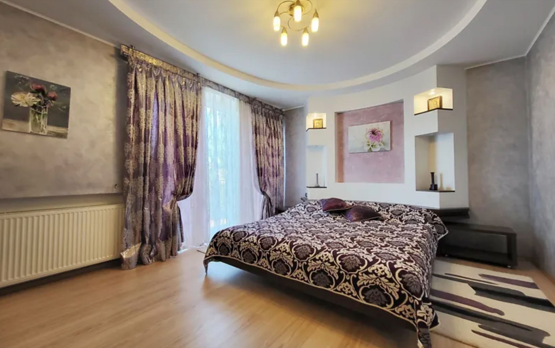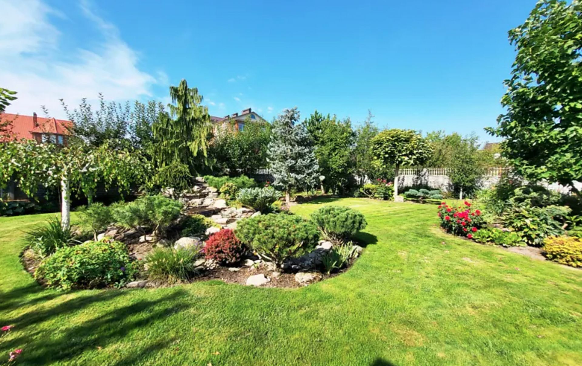 Цей будинок площею 495 м² розташований у престижному районі біля лісу та збудований за індивідуальним проєктом із використанням сучасних технологій. У ньому два житлові поверхи та цоколь, загалом передбачено п’ять житлових кімнат, серед яких три спальні та кабінет. Усередині облаштовані сауна, басейн, три санвузли, гардеробна і комора, що формує повноцінний простір для комфортного проживання.