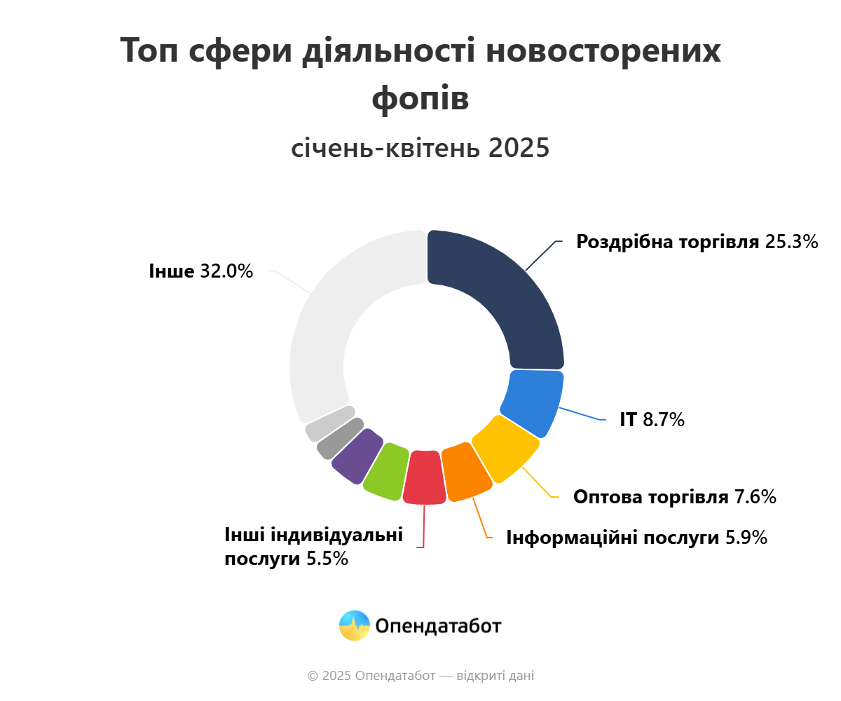 Чверть усіх нових ФОПів займаються роздрібною торгівлею — це 20 763 підприємці. Ще 7 129 ФОПів обрали ІТ та консалтинг у програмуванні. Замикає трійку оптова торгівля — 6 216 нових підприємців.