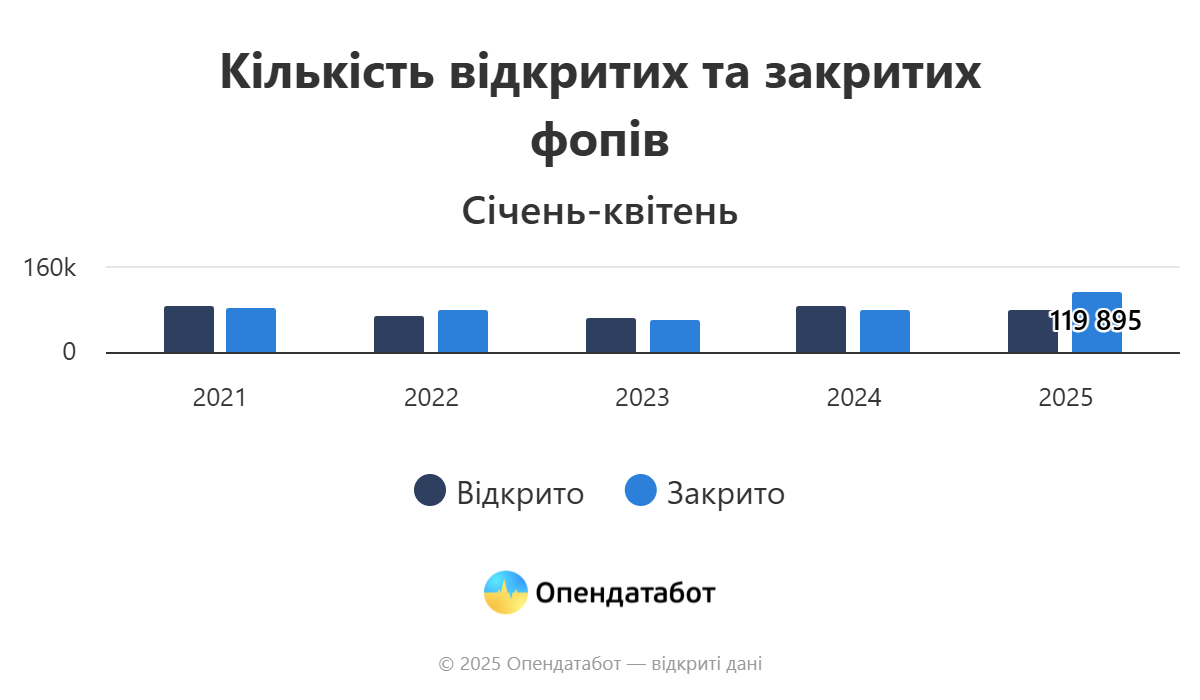 «Закривалися непрацюючі ФОПи 1-ї та 2-ї груп, адже для них відновилися довоєнні правила сплати ЄСВ. Також було визначено військовий збір (ВЗ) від мінімальної зарплати на 2025 рік — це 800 грн на місяць, незалежно від того, здійснюють вони діяльність чи ні. Оскільки такі ФОПи не ведуть реальної діяльності, вони ухвалюють рішення про закриття, аби уникнути нарахування податку. Водночас починаючи з березня 2025 року, кількість відкритих ФОПів (20 029) перевищує кількість закритих (18 477). Так само і у квітні: 21 517 нових — на 3 899 більше, ніж закритих», — коментує Данило Гетманцев.