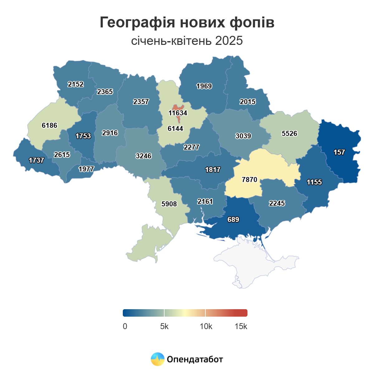 Найбільше ФОПів цьогоріч зареєстровано у Києві — 11,6 тисячі (або 14,2%). Далі йдуть Дніпропетровщина — 7,8 тисячі (9,6%) та Львівщина — 6,1 тисячі (7,6%). На Вінниччині за чотири місяці з'явилося 3 246 нових фопів.