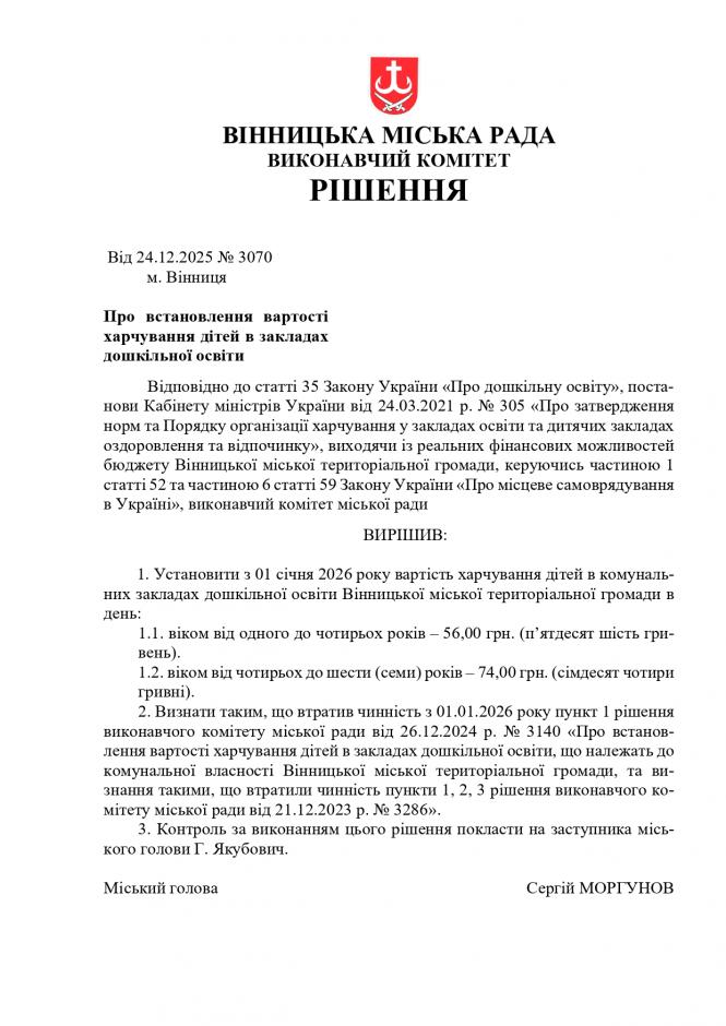 Вінницька міська рада переглянула вартість щоденного раціону дітей у комунальних садочках громади. Це щорічна процедура, яка враховує актуальні ціни на продукти та оновлені державні норми. Нові тарифи вступають у силу з 1 січня 2026 року та стосуються всіх муніципальних закладів дошкільної освіти.