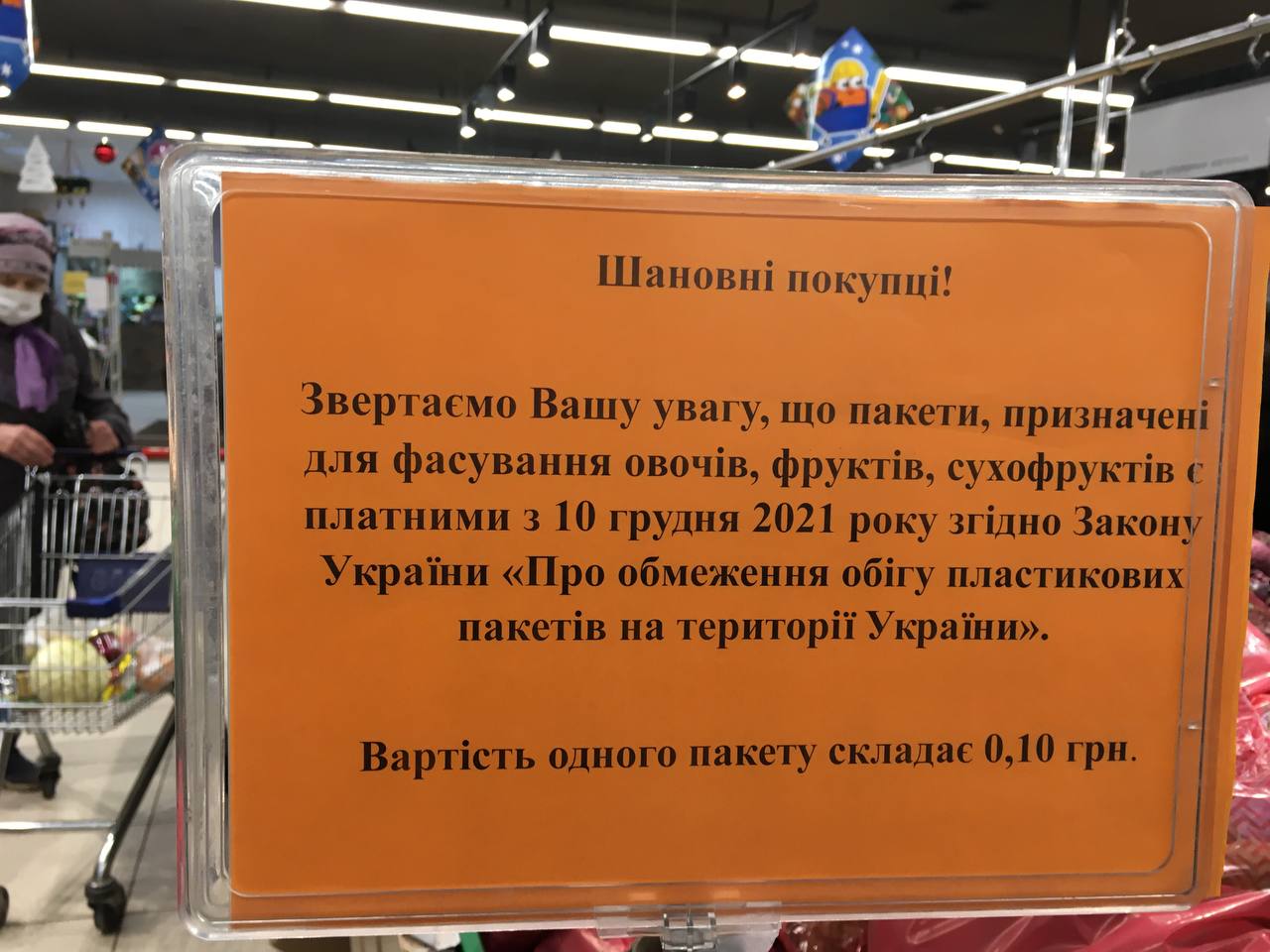 Саме для фруктів часто знадобляються поліетиленові пакети. І в супермаркеті біля стійок з рулонами (які стоять на своїх звичних місцях), відтепер є таблички з таким змістом: «З 10.12.2021 вартість пакетиків з ручками: 0,12 гривні. Пакет без ручок: 0,09 гривень. Пакети продаються поштучно для фасування вагових товарів. Просимо Вас поставитися з розумінням до таких нововведень».