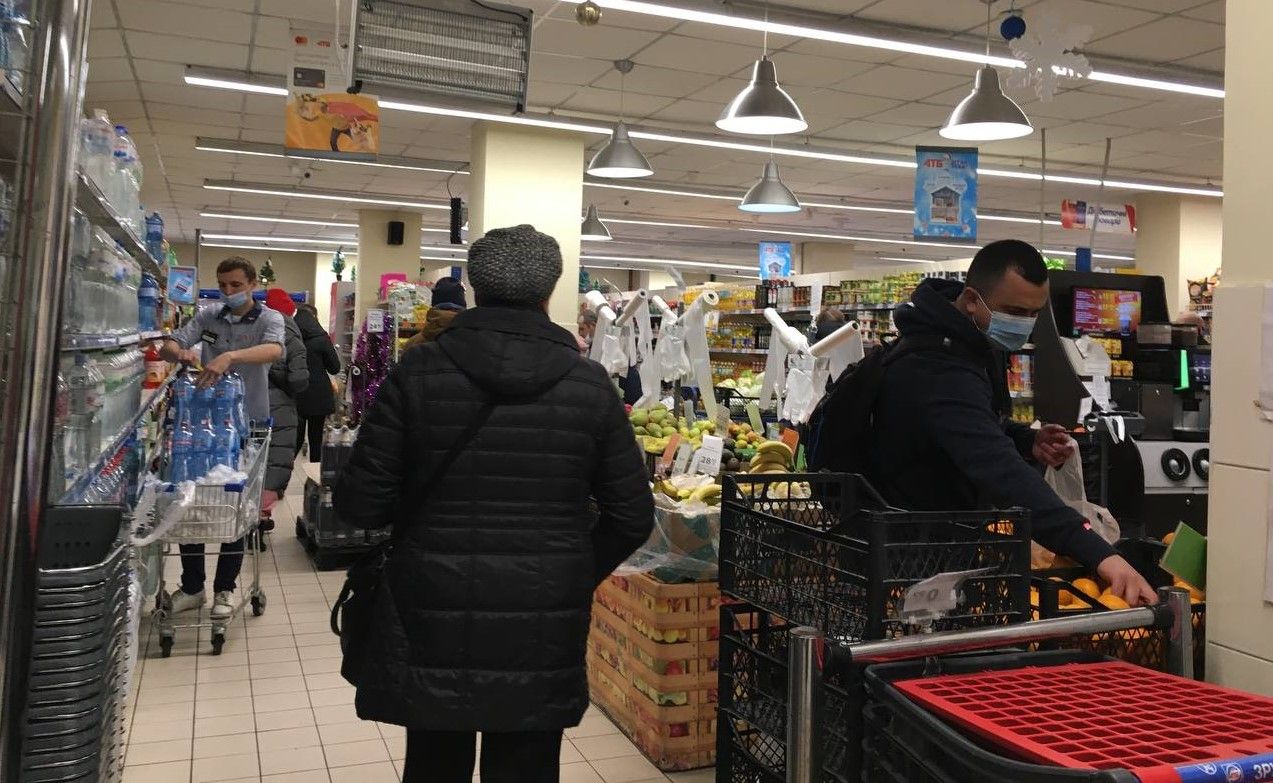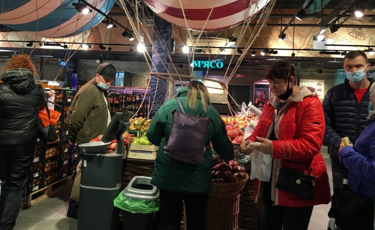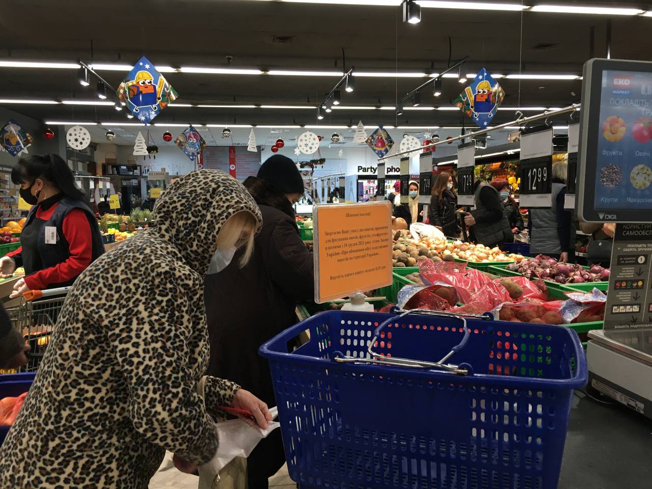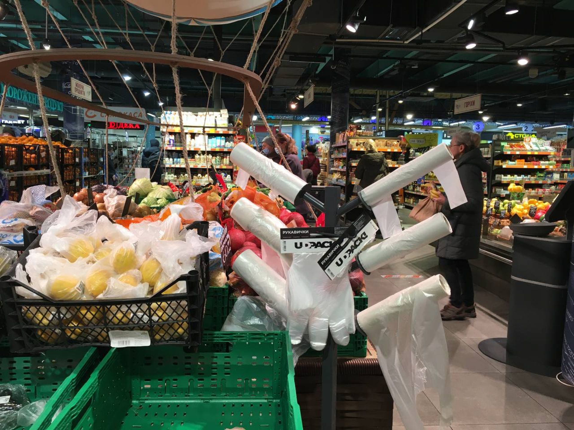 Наступний супермаркет, в який ми прийшли, був «Еко-маркет». Там біля стійок з рулонами пластикових пакетів традиційно людно. Вінничани набирають мандарини, картоплю чи банани — у пакетики.