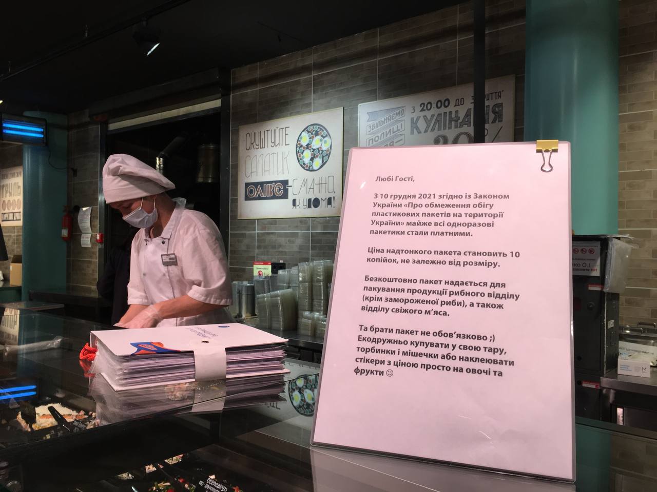 У самому магазині у кількох місцях є оголошення такого змісту: «Безкоштовно пакет надається для пакування продукції рибного відділу, а також відділу свіжого м'яса. Та брати пакет не обов'язково. Екодружньо купувати у свою тару, торбинки й мішечки. Або наклеювати наліпки з ціною просто на овочі та фрукти».