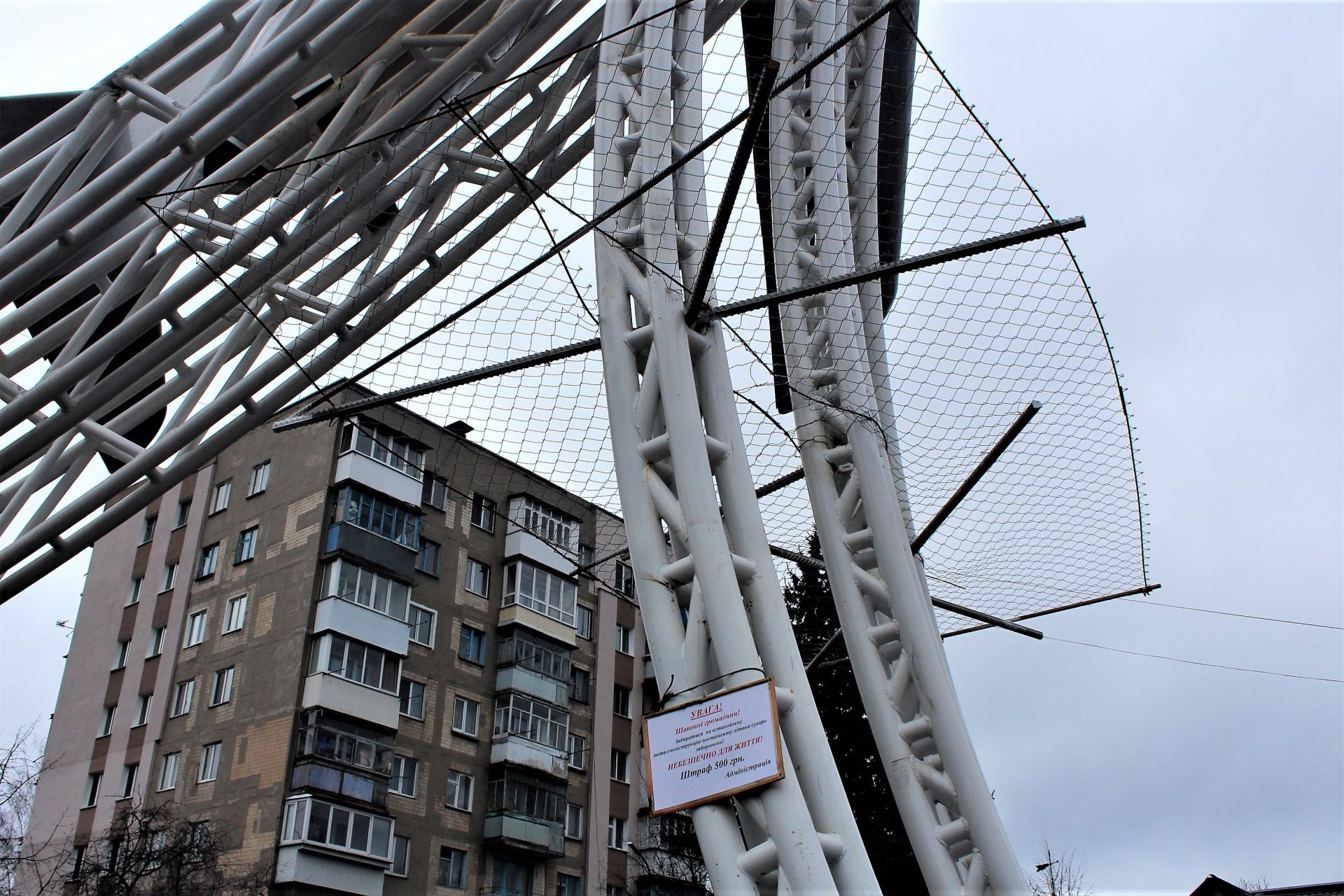 Постамент для МіГ-15, який критикують в соцмережах, ще незавершений. Як казали в мерії, металеві секції пам’ятника хочуть обшити пластиком. А зараз, щоб люди не залізали по трубам, встановили бар’єри. І якась невідома «Адміністрація» обіцяє штрафувати на 500 гривень тих, хто все ж полізе до літака.