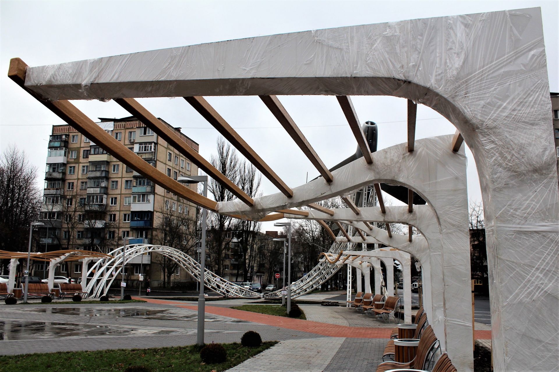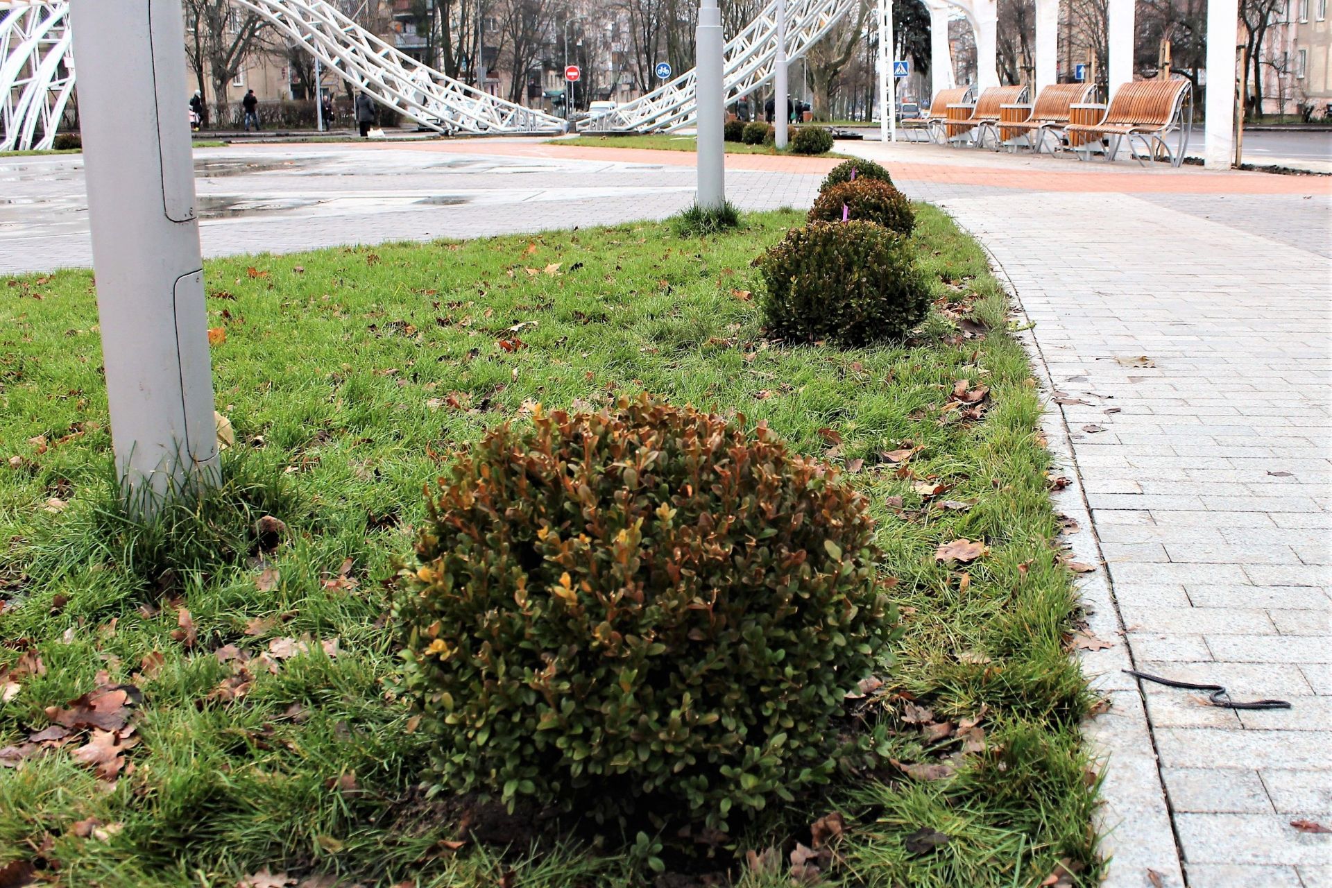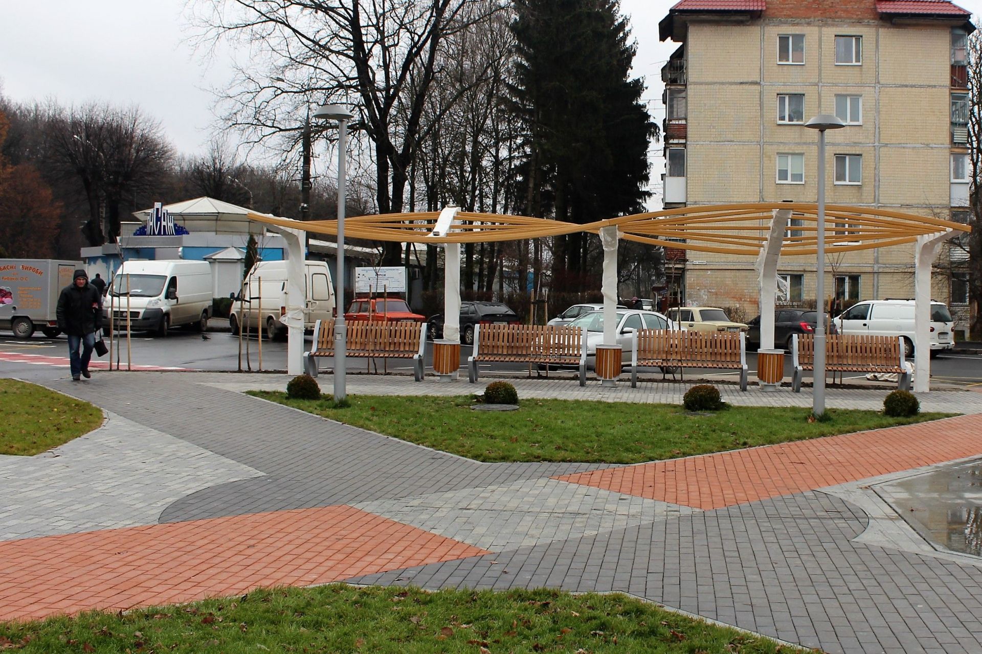 У четвер, 30 листопада, журналіст не побачив будівельників на цій ділянці. Але більшість роботи вони вже зробили: озеленили територію, висадили липи та доробили перголи з лавками. Останніх тут тепер 16 штук.