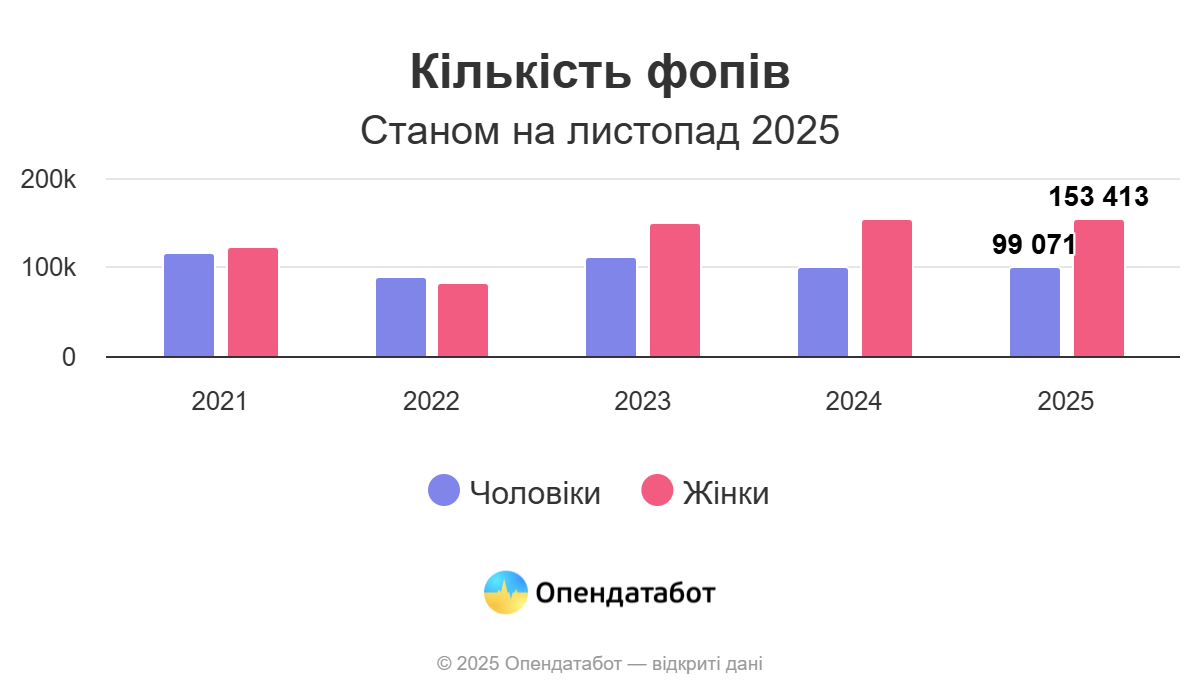 - Понад 153 тисячі нових ФОПів відкрили жінки за 10 місяців 2025 року в Україні, за даними Єдиного державного реєстру.