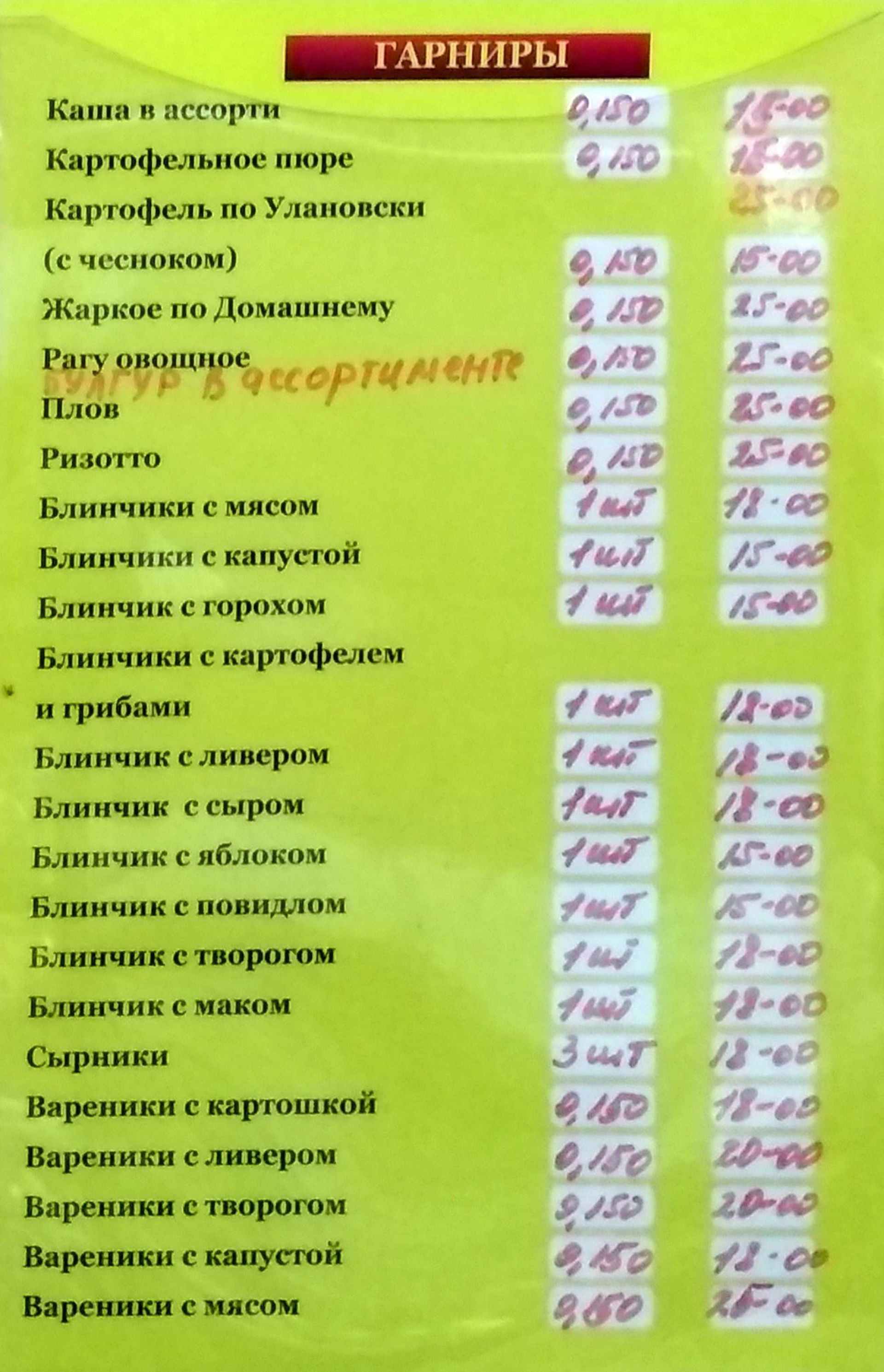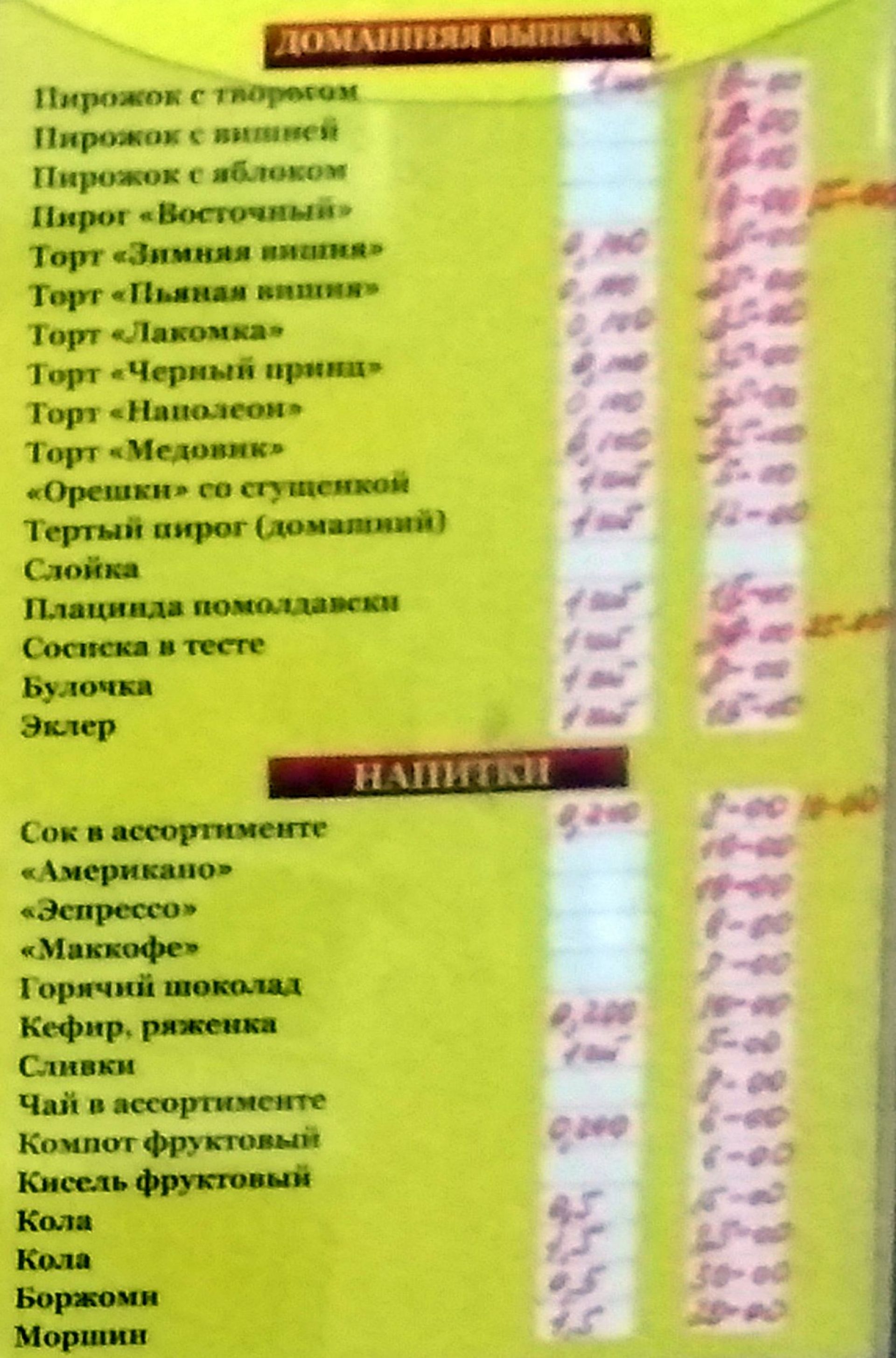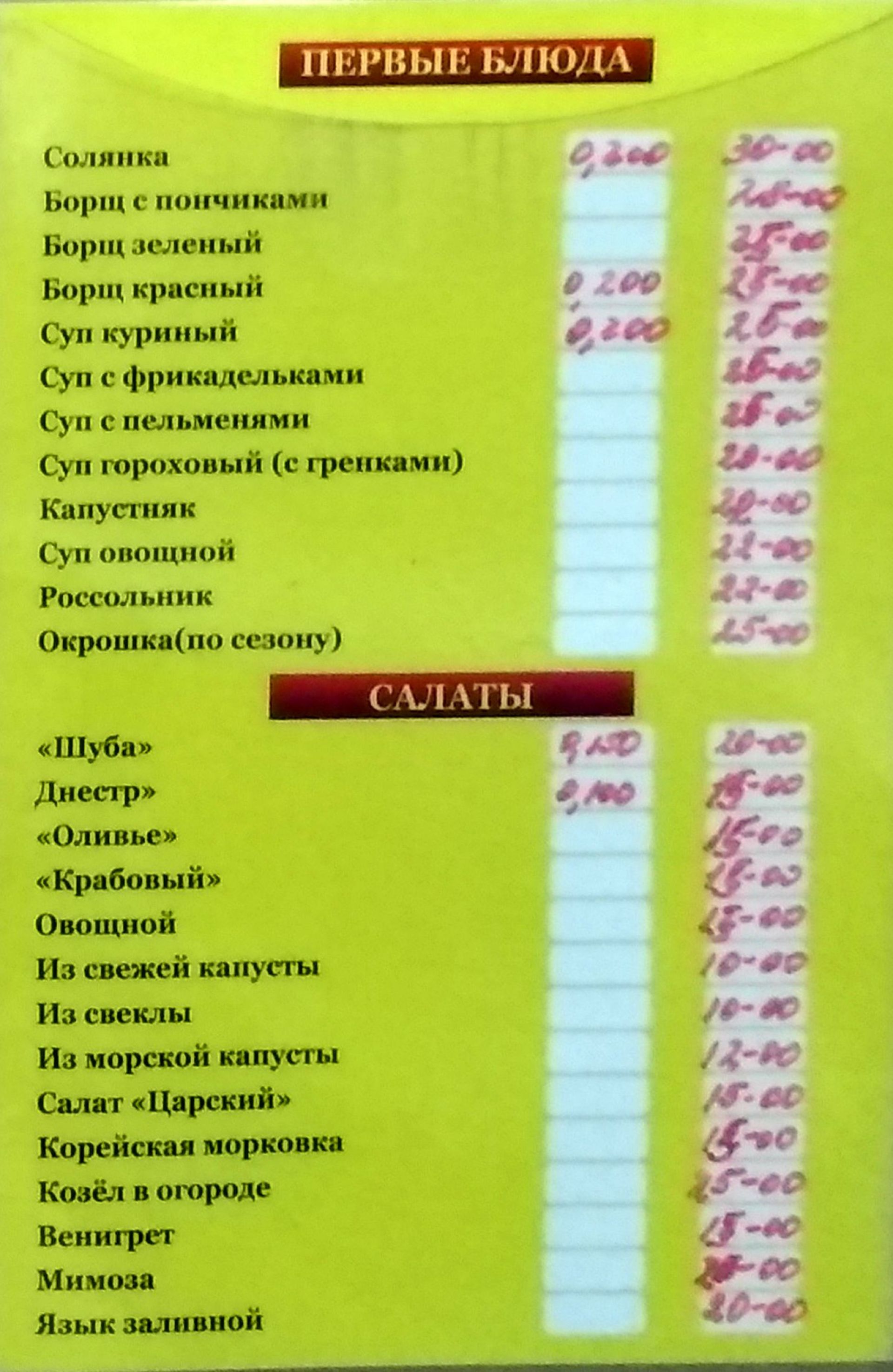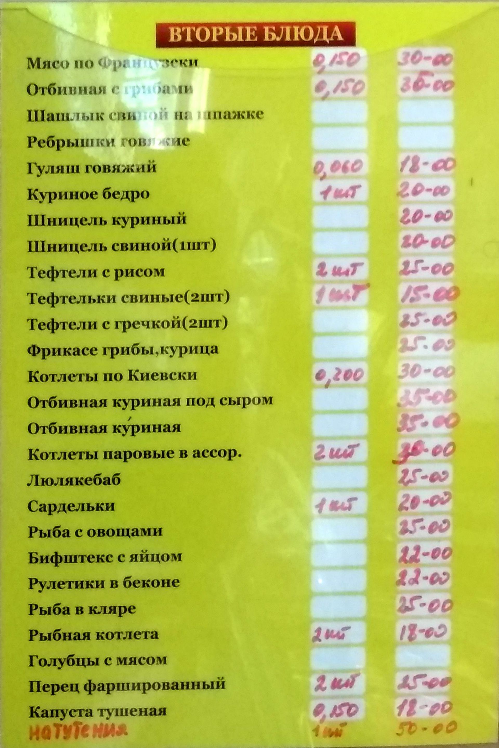 Меню. Висить біля стола роздачі. Обід обійшовся в 74 гривні. Складався борщу, гречаної каші, курячої котлети, компоту та шматочка хліба.