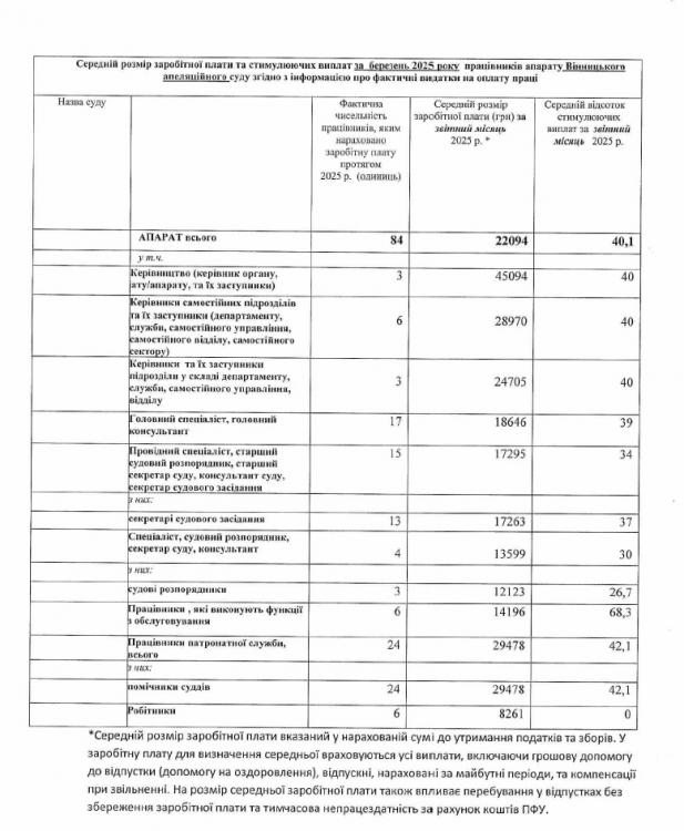 - Вінницький апеляційний суд розкрив, скільки в середньому отримували його працівники у березні 2025 року.