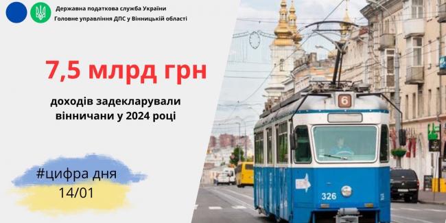 За даними управління оподаткування фізичних осіб ГУ ДПС у Вінницькій області, станом на 1 січня 2025 року, мешканці Вінницької області задекларували 7 мільярдів 541 мільйон 805,4 тисяч гривень доходів за 2024 рік.