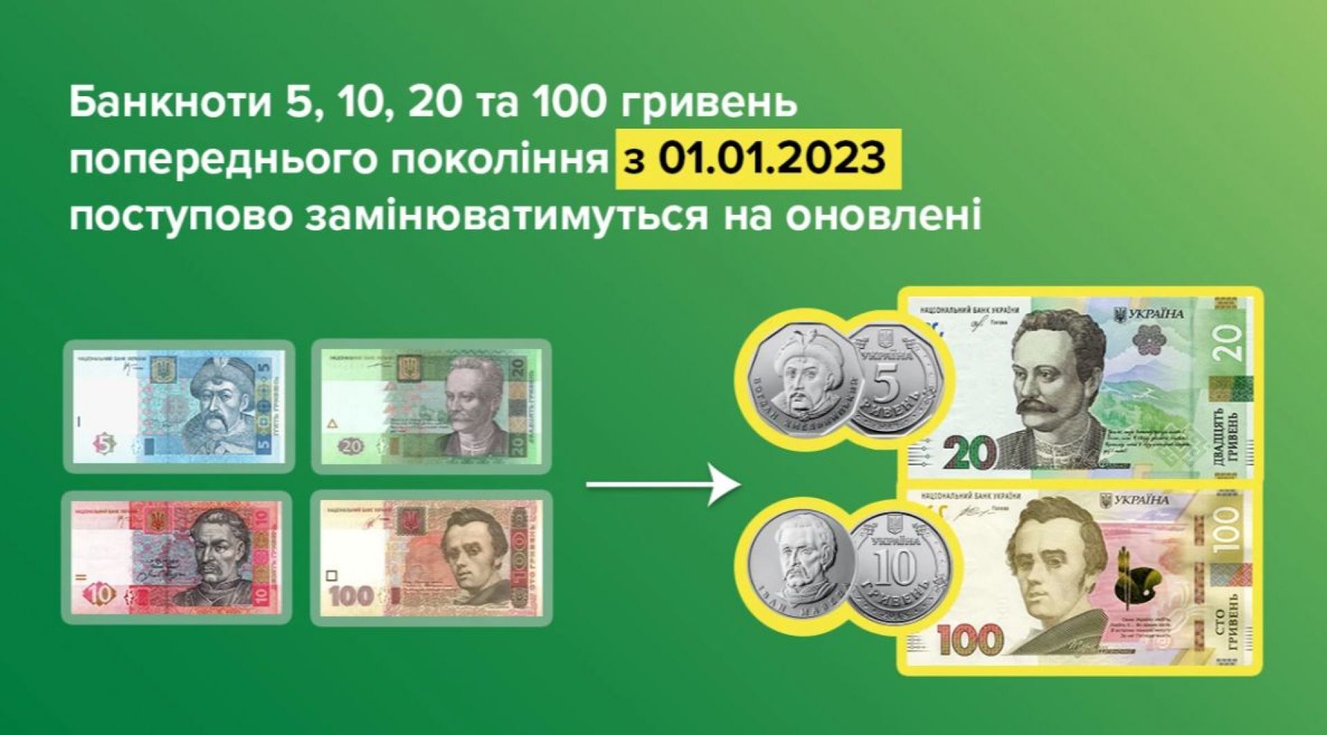З 1 січня 2023 року Національний банк розпочне поступово вилучати з обігу паперові банкноти номіналами 5, 10, 20 та 100 гривень зразків 2003-2007 років (тобто попереднього покоління) з метою поступової їх заміни на оновлені грошові знаки.