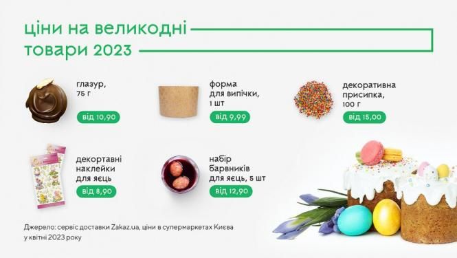 Один із сервісів доставки вказав ціни на великодні товари. Вони наведені з огляду на вартість у київських супермаркетах. До прикладу, у Вінниці форму для випікання можна придбати дешевше, за 5,5 грн. А глазур — за 8 грн.