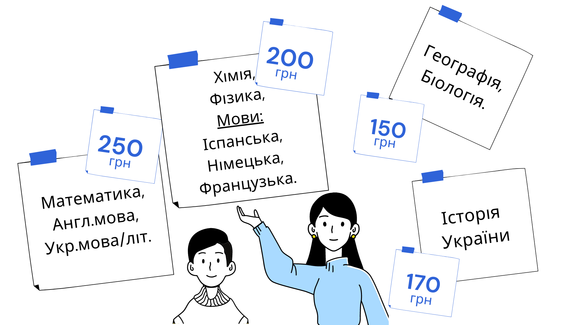 Звісно, годинна вартість роботи вчителя залежить від багатьох факторів, серед них: досвід роботи, офлайн чи онлайн, частота занять. До прикладу, ми бачили оголошення викладачів з англійської мови, які за 60 хвилин беруть 800 гривень. Ми ж вказуємо середню вартість послуг.