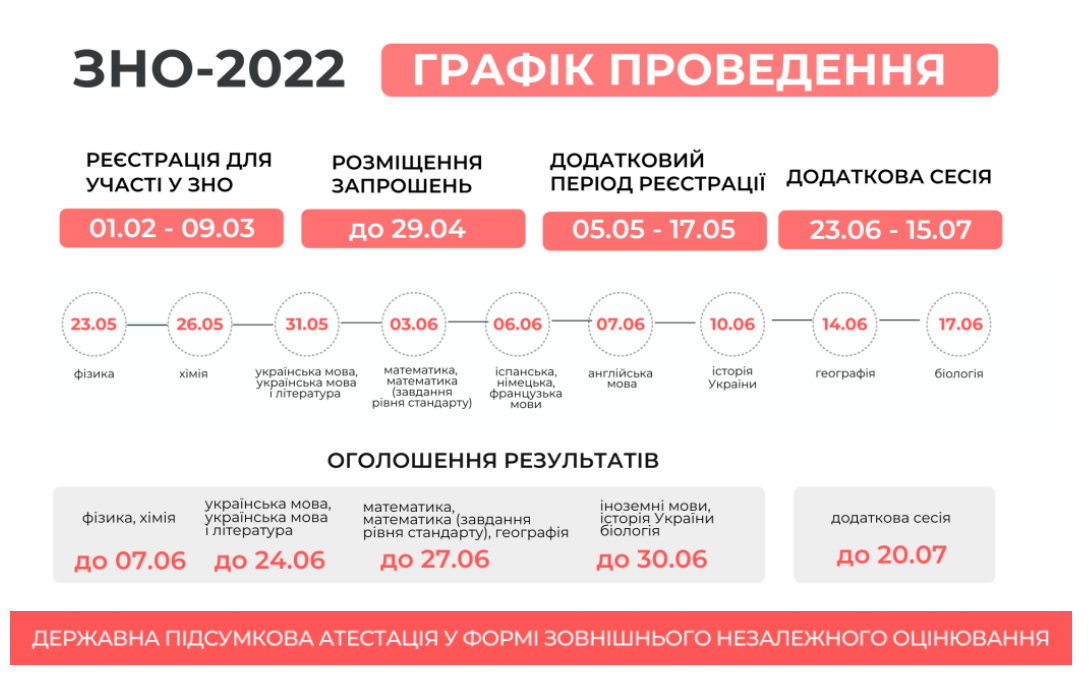 Основна сесія ЗНО-2022 відбудеться з 23 травня до 17 червня. Тестування основної сесії ЗНО-2022 відбудуться за таким графіком: