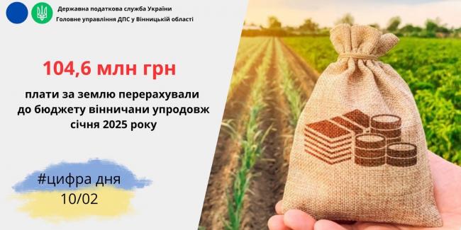 У січні на Вінниччині сплатили понад 104 мільйони гривень плати за землю, що значно перевищує очікування. Юридичні особи внесли 86,2 мільйони гривень, фізичні — 18,3 мільйони гривень.