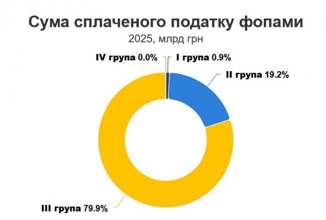 Найбільший внесок зробили підприємці третьої групи: вони сплатили понад 47,8 мільярда гривень, що складає 80% від усієї суми надходжень. Хоча кількість ФОПів цієї категорії майже не змінилася — 801,5 тисяч осіб наприкінці 2025 року проти 798,3 тисяч роком раніше — сума податку зросла на 6,5%, демонструючи зростання доходів бізнесу.