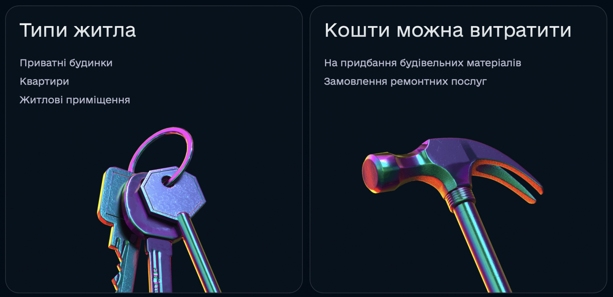 У програмі підтримки можуть брати участь власники і приватних будинків, і квартир, і житлових приміщень. Отримані гроші ви можете витратити на придбання будівельних матеріалів та замовлення ремонтних послуг. Однак купувати матеріали для ремонту можна лише в будівельних магазинах, що є учасниками програми відновлення та зареєстровані з МСС-кодом 5211 (будівельні магазини) або 5231 (магазини фарб, шпалер). Підрядники теж мають бути зареєстровані за МСС-кодом 1520 (підрядники в галузі будівництва).