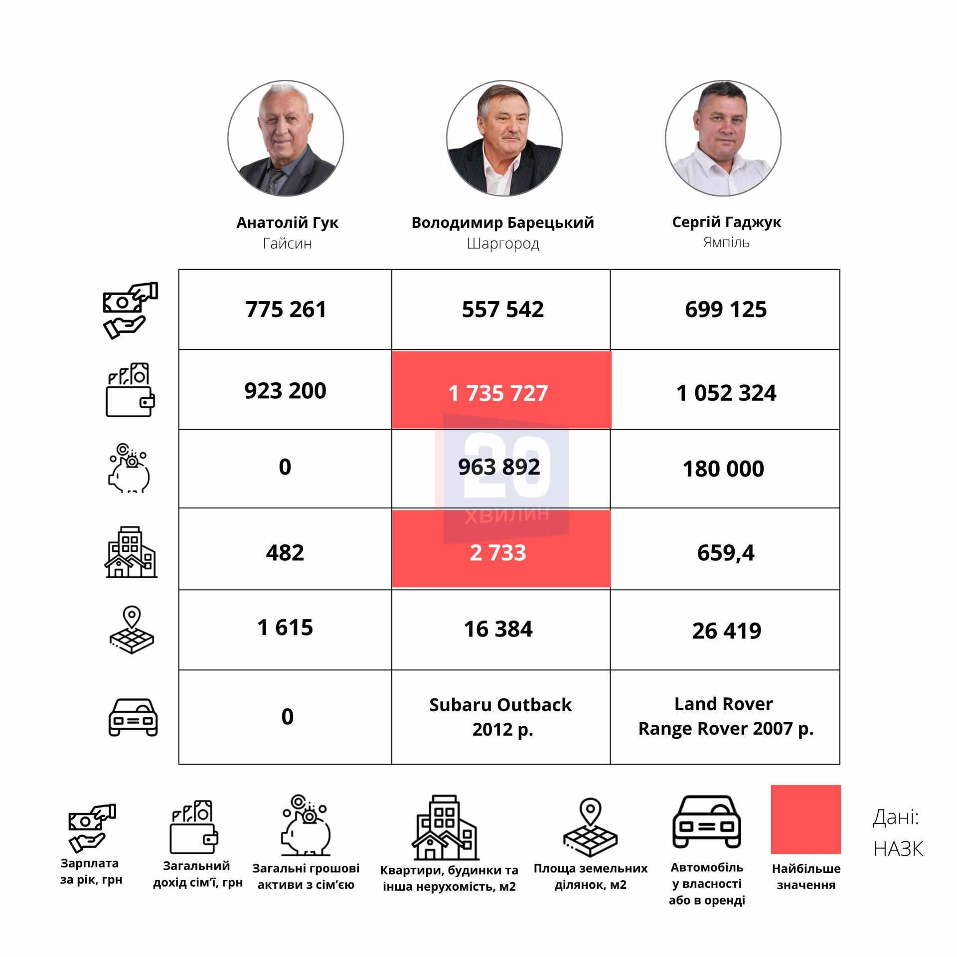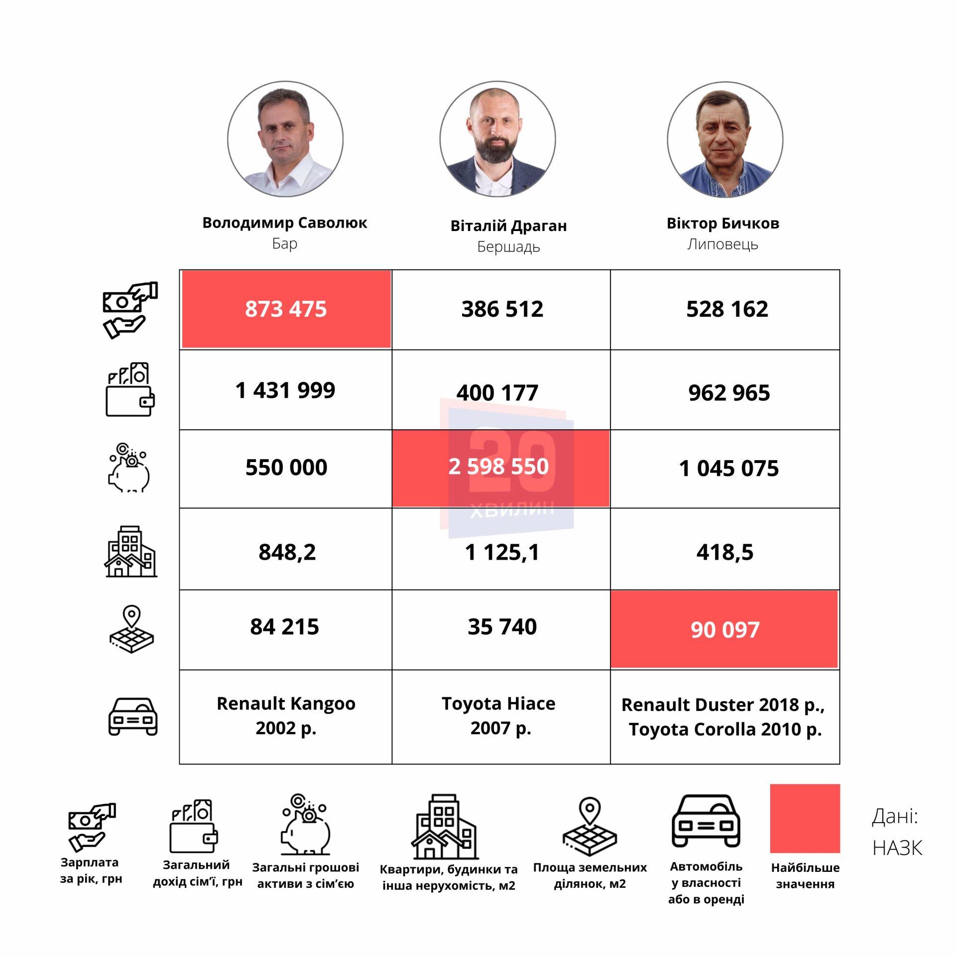 У першій частині — найбільшу зарплату серед мерів найбільших міст на Вінниччині отримав виконувач обов’язків голови Ладижина Олександр Коломієць — 776 тисяч гривень за увесь рік, до оподаткування. Найбільший сімейний дохід та найбільша кількість землі у мера Хмільника Миколи Юрчишина — понад 11 мільйонів гривень та 119 гектарів земельних ділянок. Найбільше заощаджень і нерухомості — в мера Могилів-Подільського Геннадія Глухманюка: 22,6 мільйона гривень та 2,6 тисячі кв.метрів відповідно.