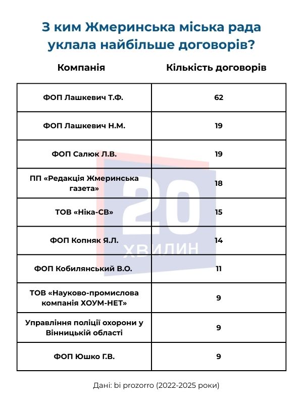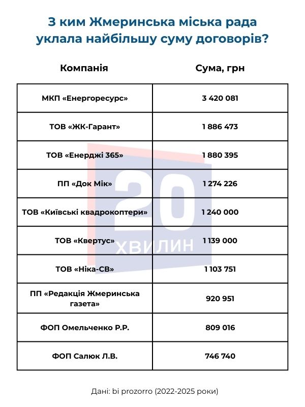 Попри те, що з деякими підрядниками Жмеринська міська рада уклала найбільшу кількість договорів, загальні суми по них можуть бути незначними. Тому ми вирішили окремо скласти рейтинг підрядників, із якими були підписані договори на найбільші суми.