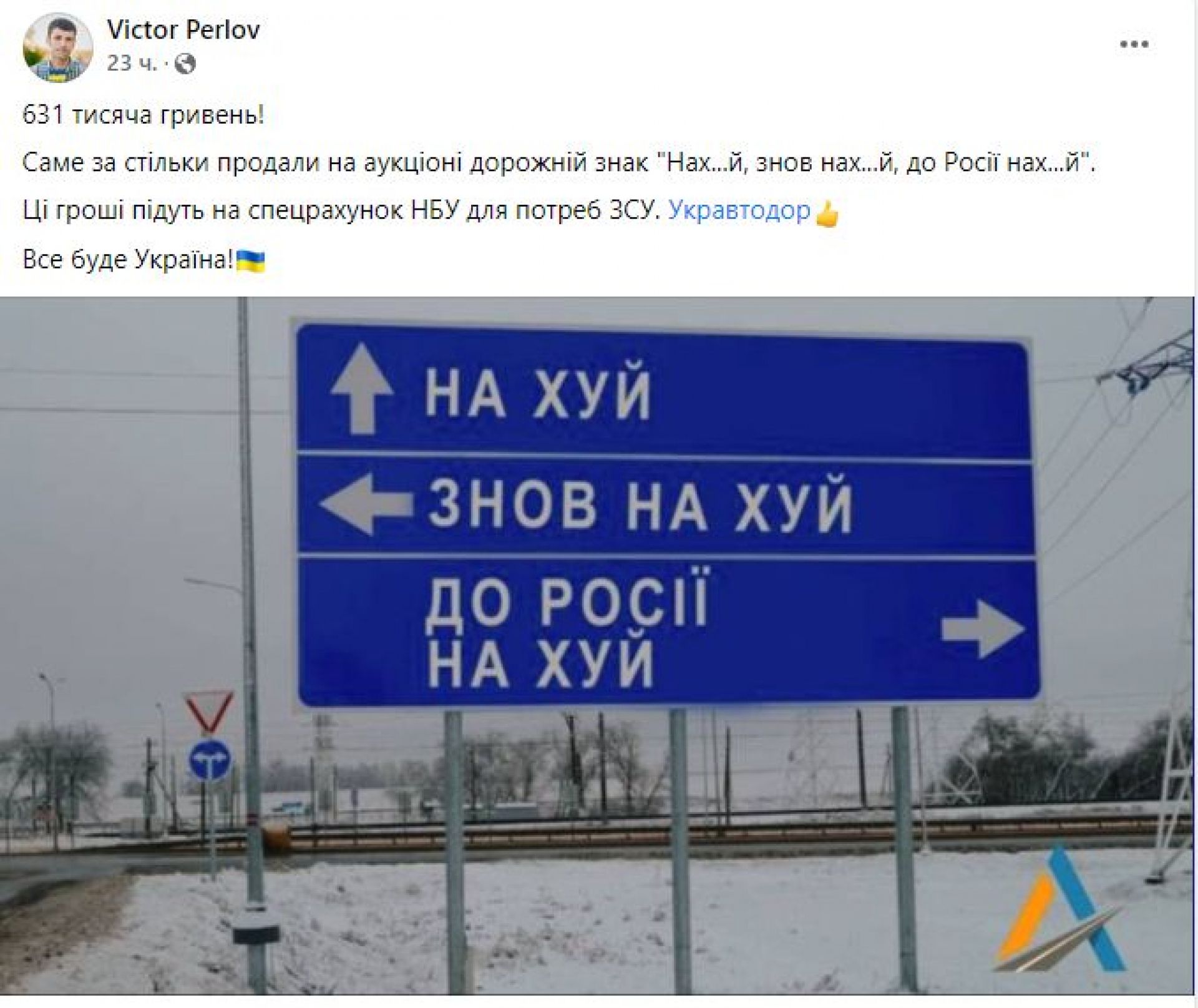 — 631 тисяча гривень! Саме за стільки продали на аукціоні дорожній знак «Нах...й, знов нах...й, до Росії нах...й», — написав у фейсбук вінницький депутат Віктор Перлов. — Ці гроші підуть на спецрахунок НБУ для потреб ЗСУ.