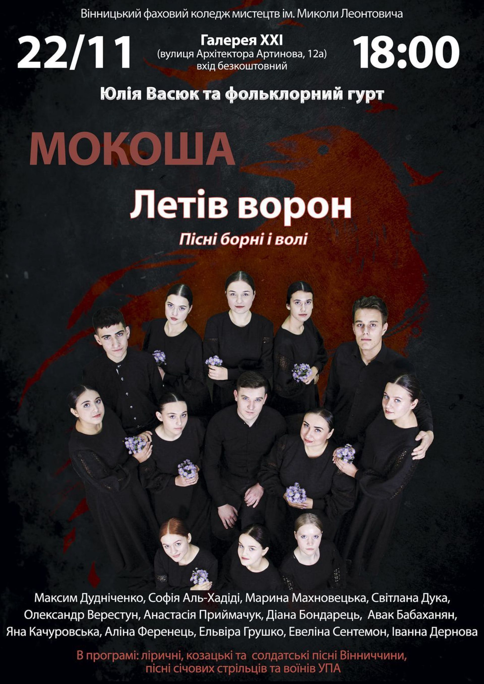 - Завтра, 22 листопада, вінничан запрошують на благодійний концерт «Летів ворон. Пісні борні і волі». Захід організовує Юлія Васюк та фольклорний гурт «Мокоша».