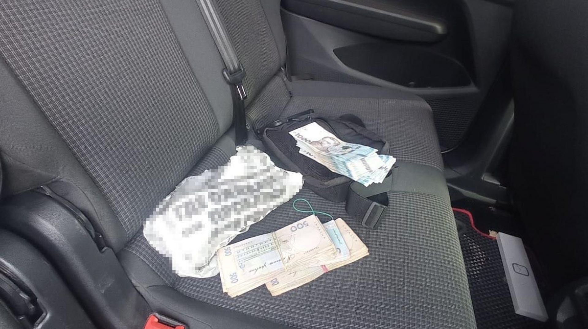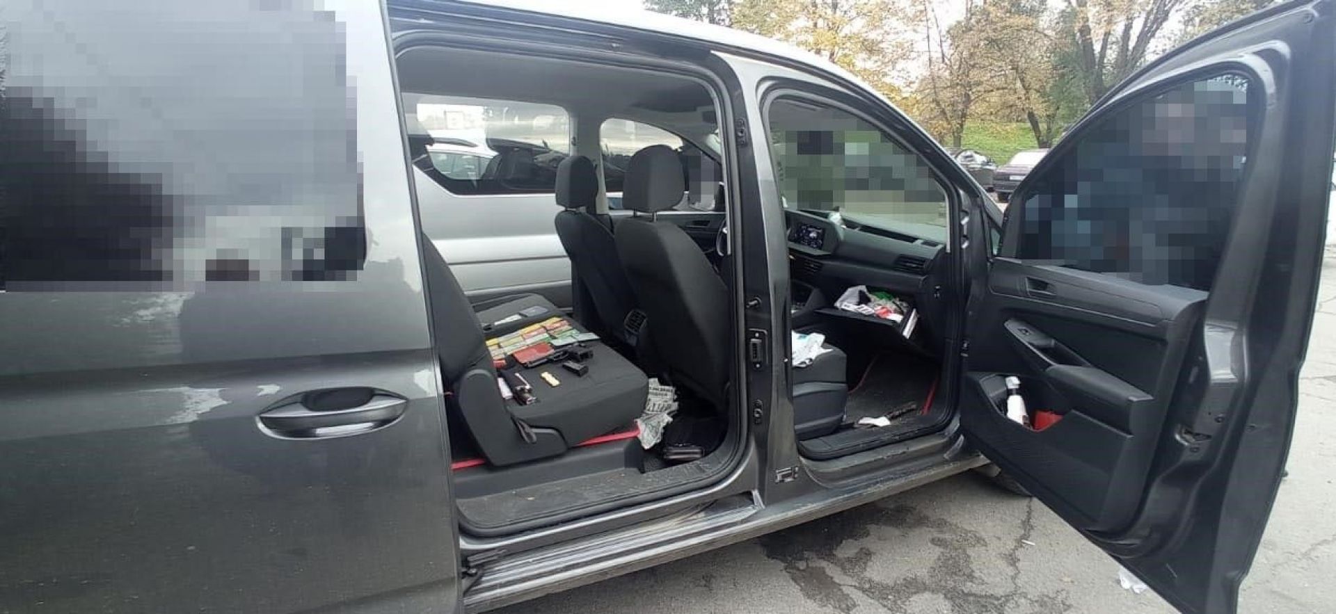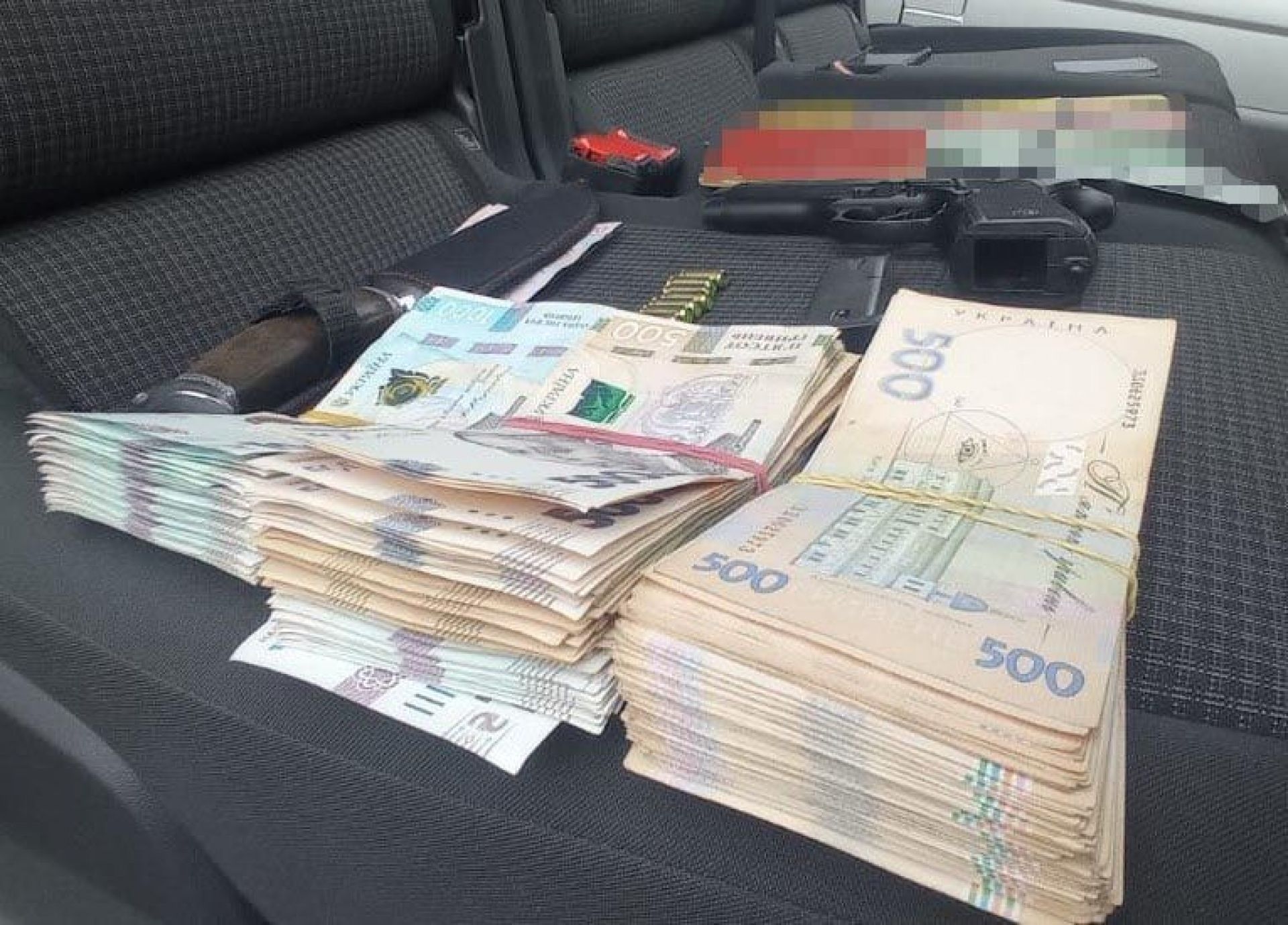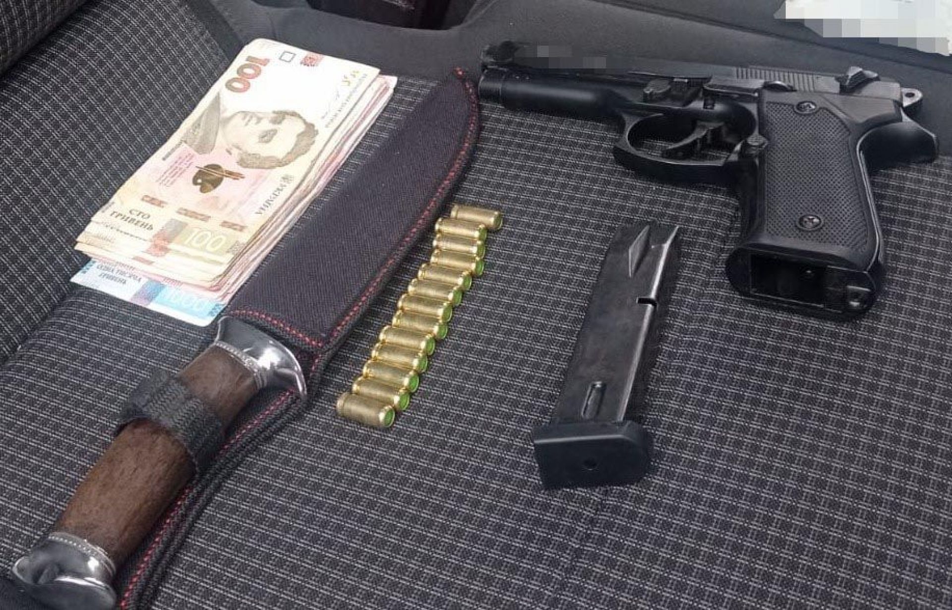 Поліцейські провели огляд транспортного засобу, який належить одному із затриманих вимагачів. У результаті процесуальної дії вилучили грошові кошти, пістолет, ніж, документи, банківські картки, мобільні телефони.