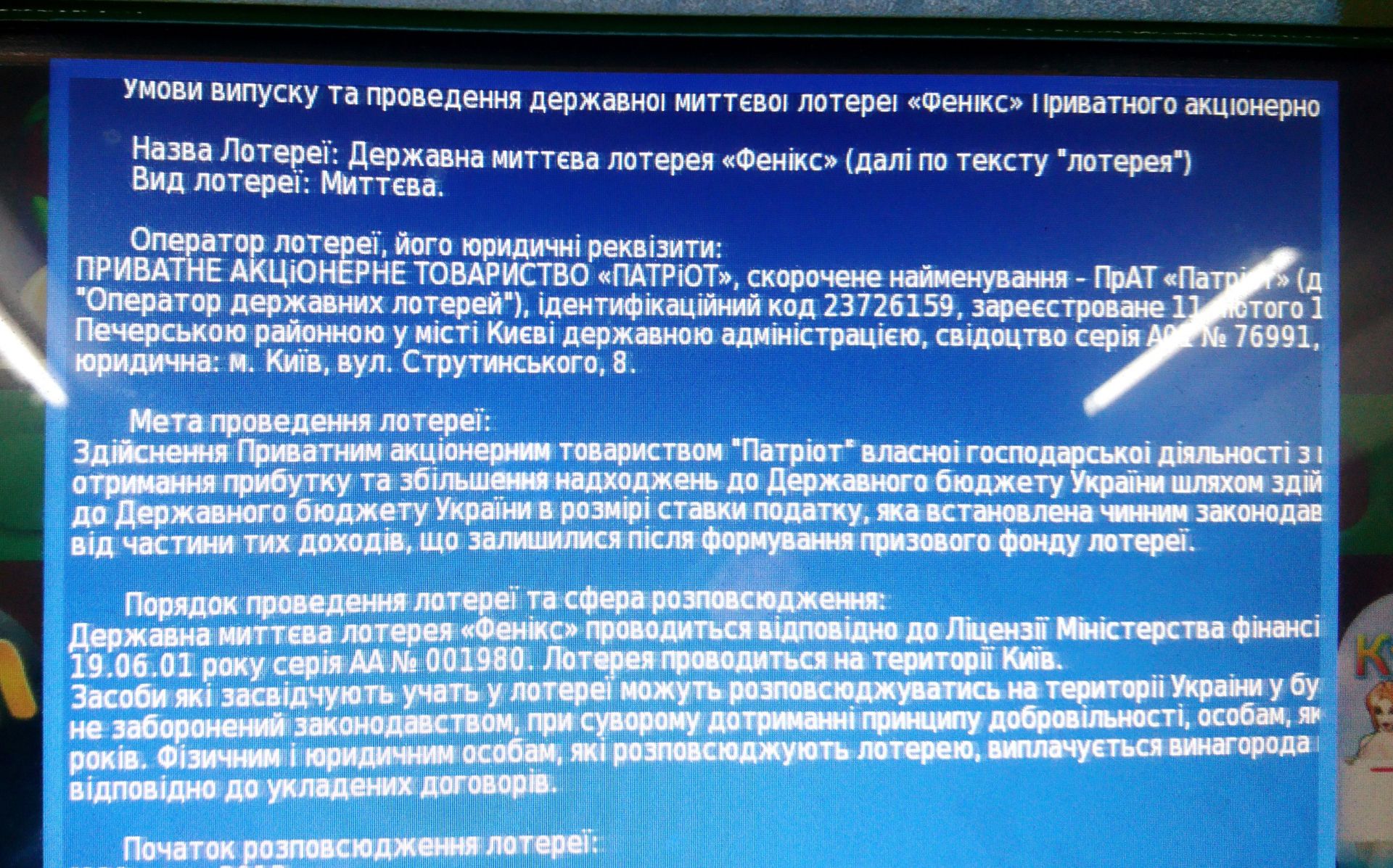 В умовах використання апарату є дані про оператора лотереї. Це приватне акціонерне товариство «Патріот». За даними реєстру Мін’юсту, засновником цієї компанії є фірма, зареєстрована на Кіпрі. Статутний капітал «Патріота» — 120 мільйонів гривень. Директор — Володимир Змаженко.