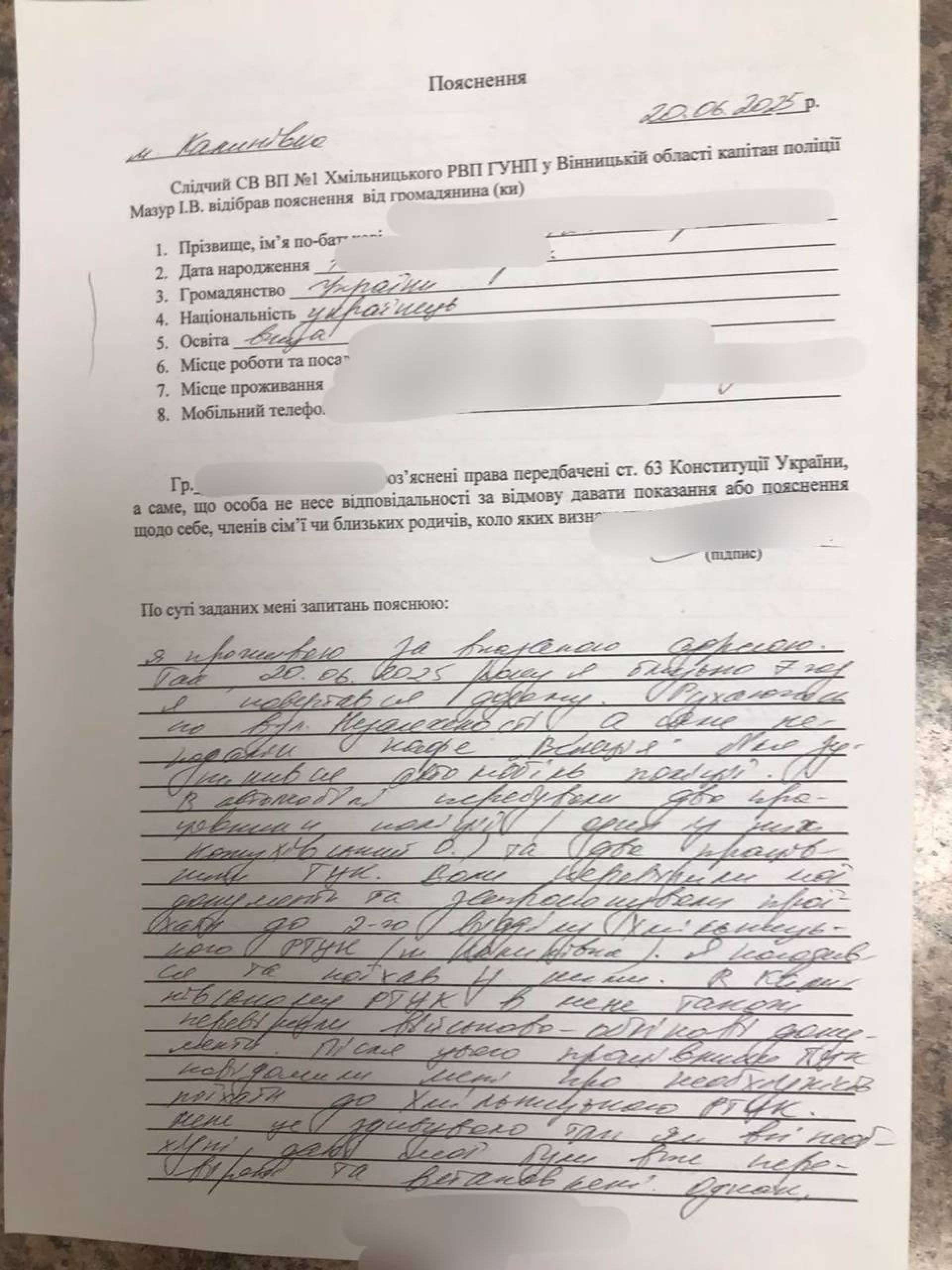 Чоловік проживає у Вінницькій області, в Хмільницькому районі. Вранці, близько сьомої години, за словами потерпілого, він добровільно погодився поїхати з представниками територіального центру комплектування — нібито для «перевірки документів». Чоловіка перестріли у Калинівці, де спочатку відвезли до другого відділку Хмільницького РТЦК та СП. Однак після того, як там перевірили військово-облікові документи, чоловікові повідомили, що він має поїхати з ними до Хмільницького РТЦК та СП, що безпосередньо у Хмільнику.