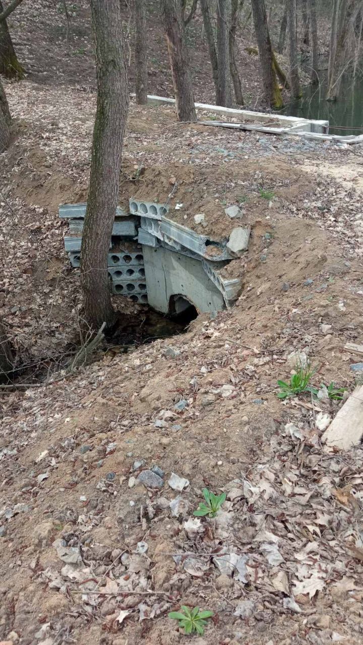 — У цьому лісі було озеро, з якого витікав струмок шириною понад метр, — розповідає місцева мешканка. — Вони розширюють цю річку, будують дамбу, тобто місток з панелей. Далі риють котлован, викладають його камінням. Оскільки це роблять не професіонали, то вони неправильно його виклали, в результаті чого вода не потекла до Бугу, а змінила русло і почала затоплювати ліс.