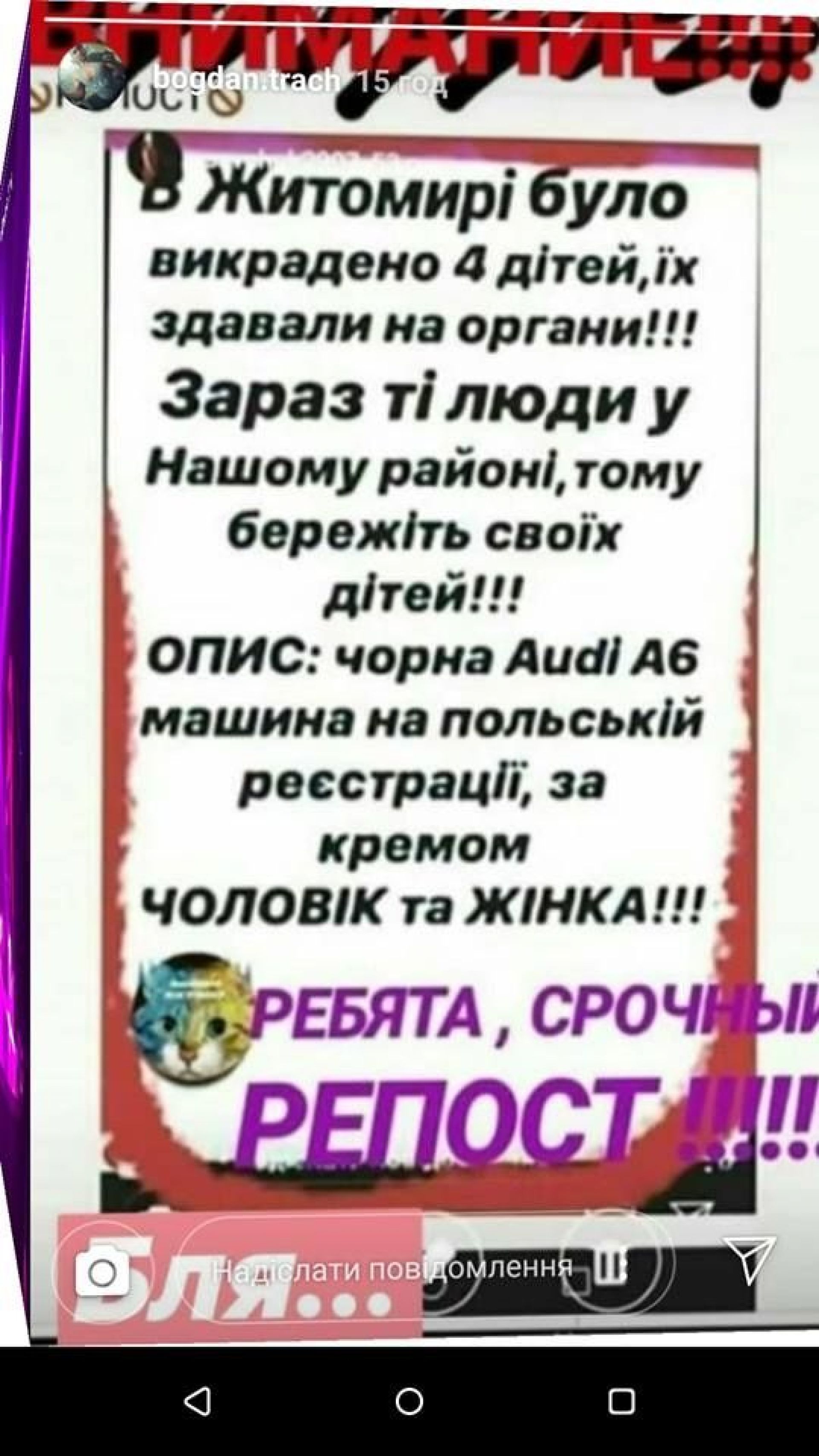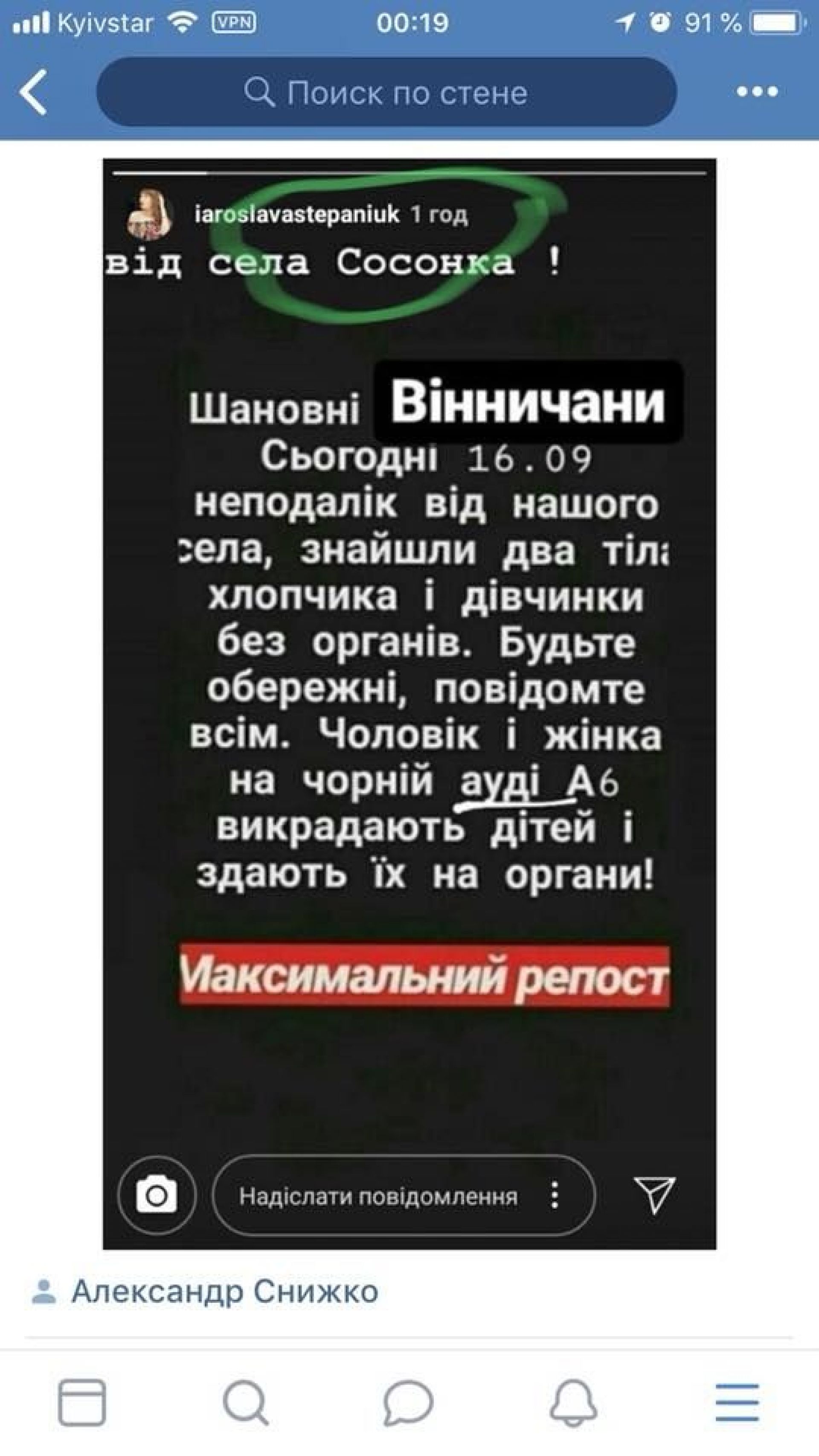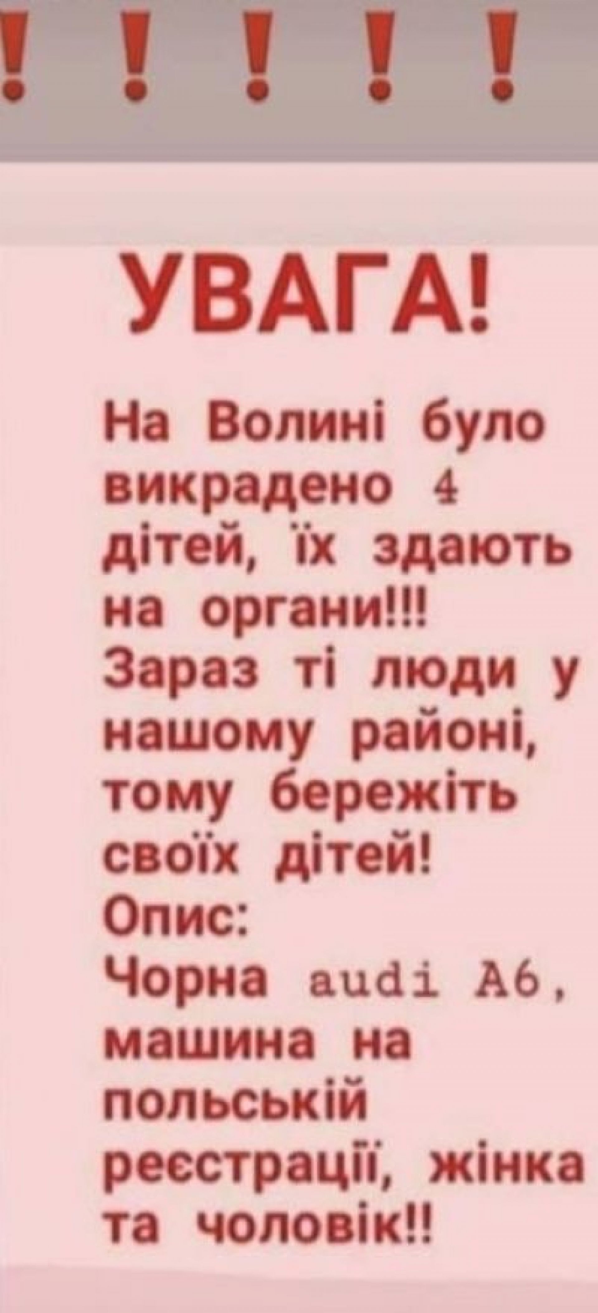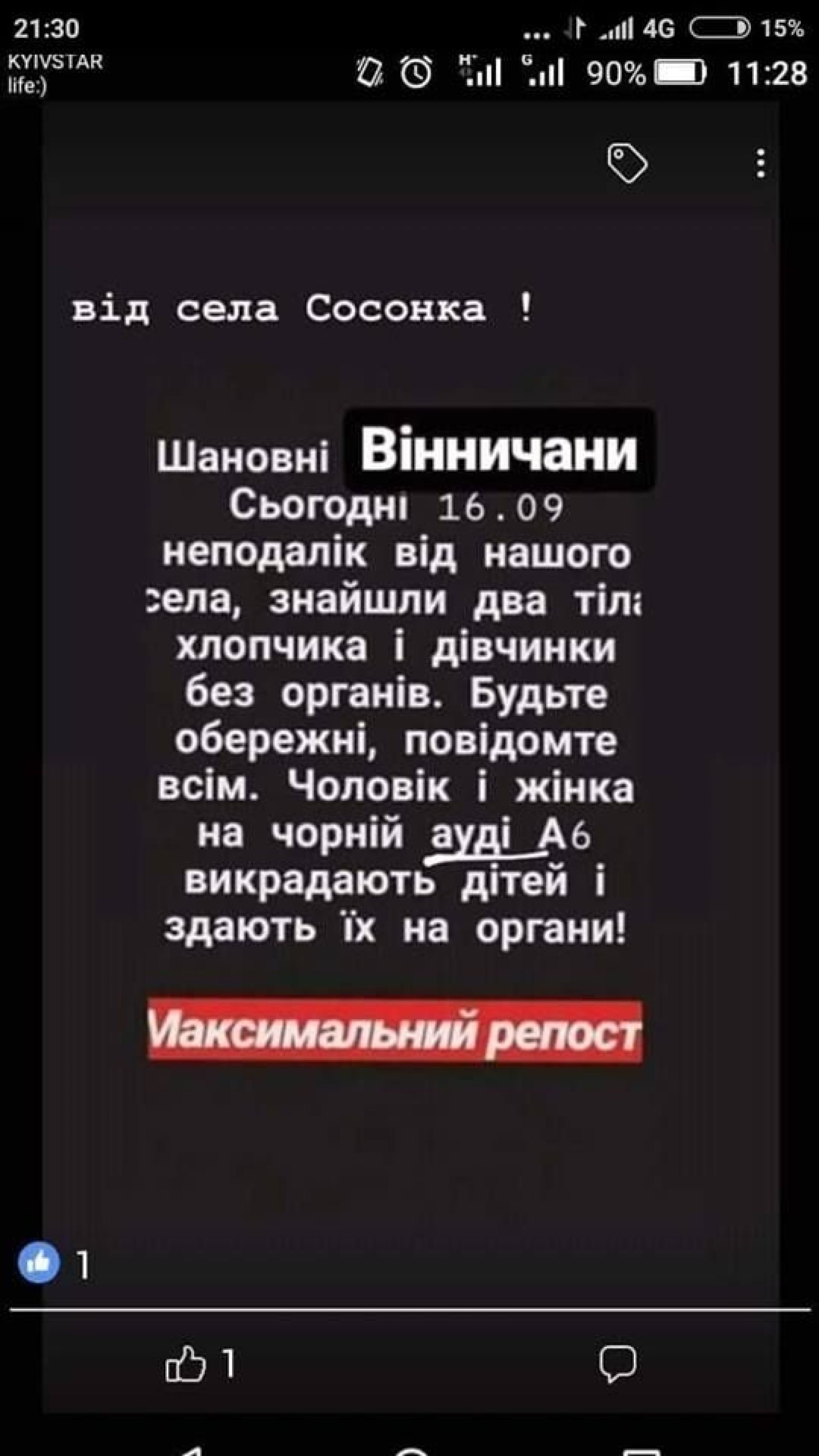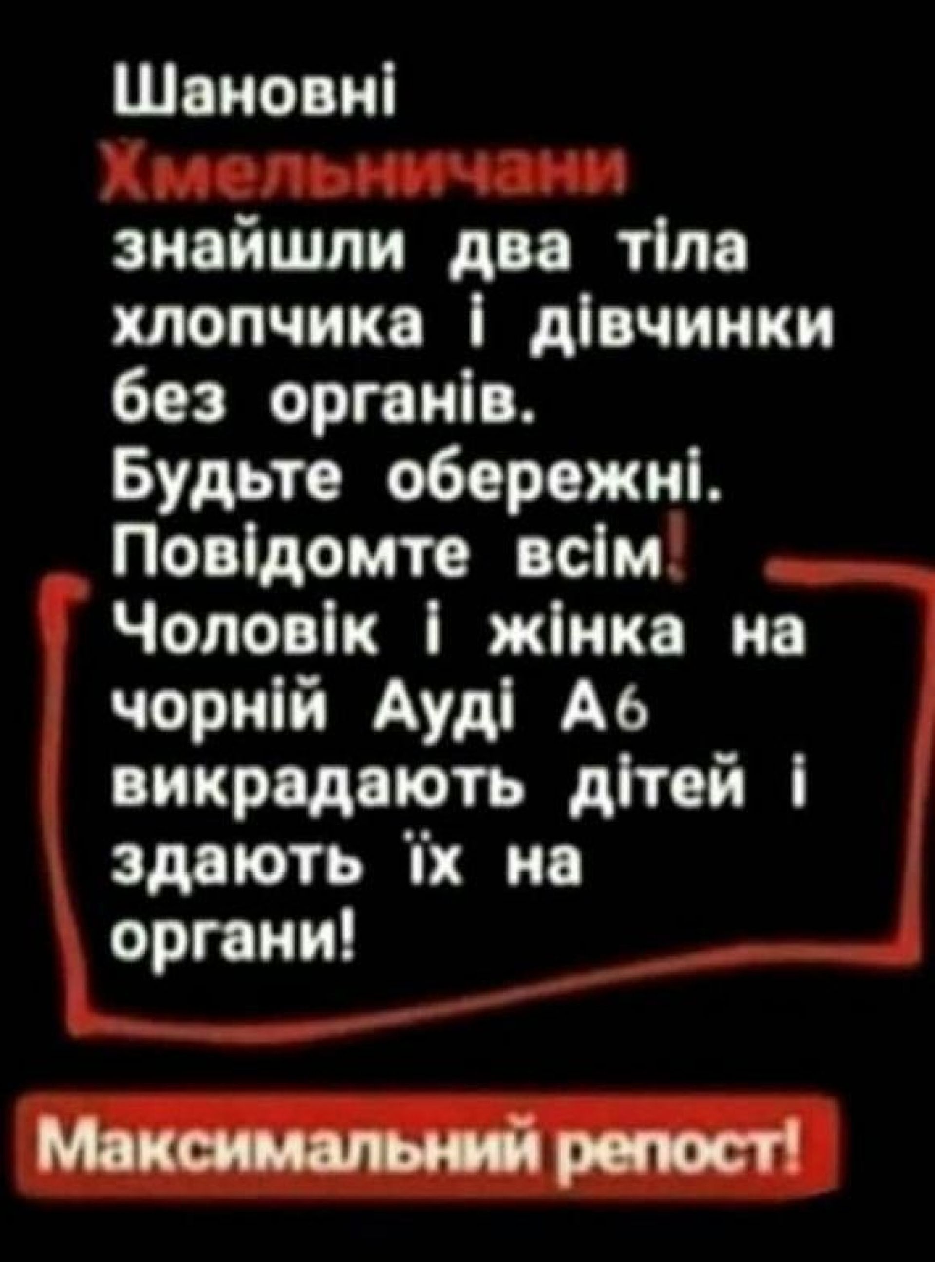 «Шановні вінничани, біля нашого села знайшли два тіла хлопчика і дівчинки без органів. Будьте обережні, повідомте всім. Чоловік і жінка на чорній «Ауді А6» викрадають дітей і здають їх на органи».