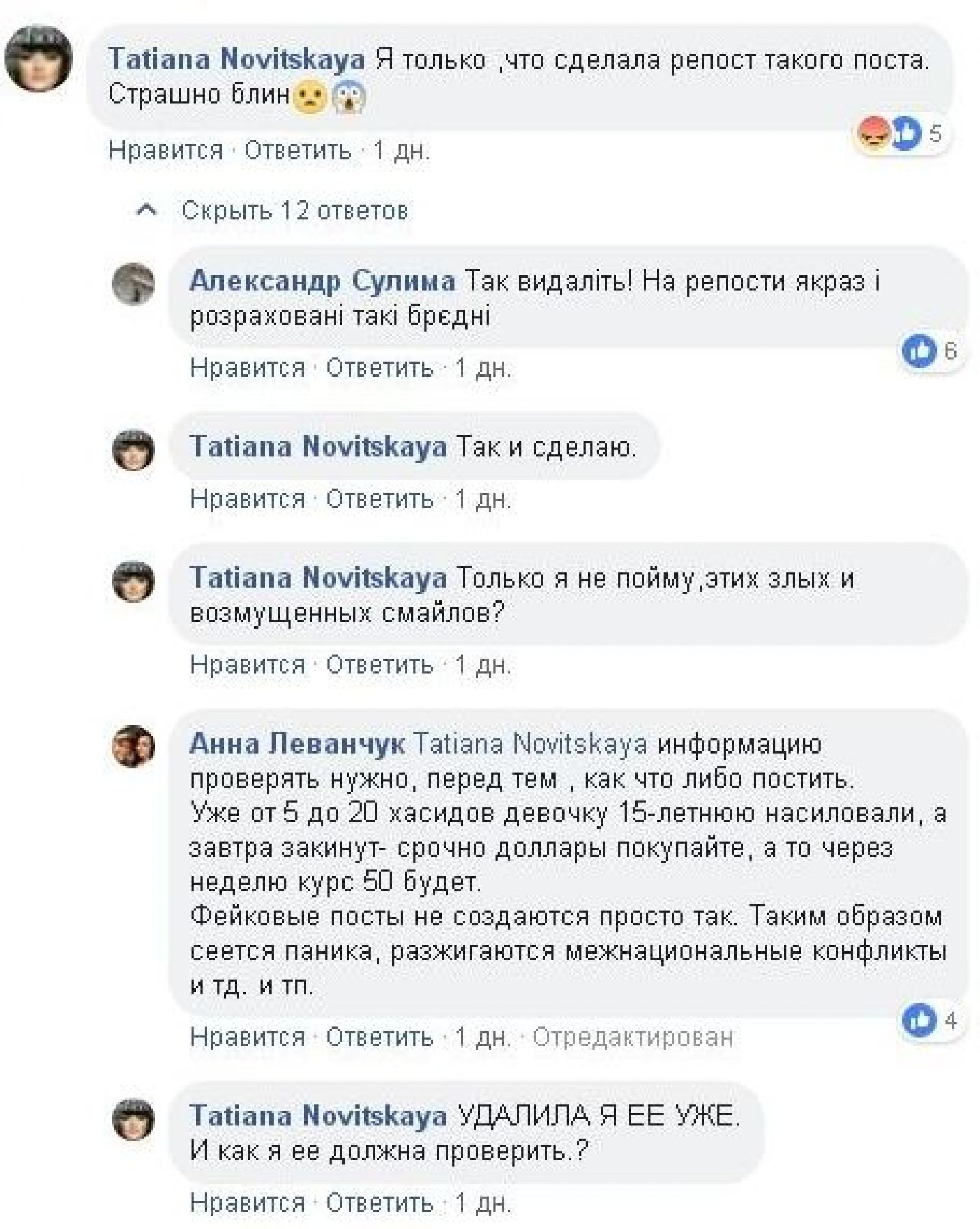 Помірковані читачі їй порадили звертати увагу на дату першоджерела з подібною інформацією і читати коментарі під ним. Писали: «спіть спокійно, це брехня». Особливо дратівливі назвали перепости про кіднепінг масовим психозом. А хтось і пожартував, що зараз «під шумок» варто дитячі GPS-годинники продавати.