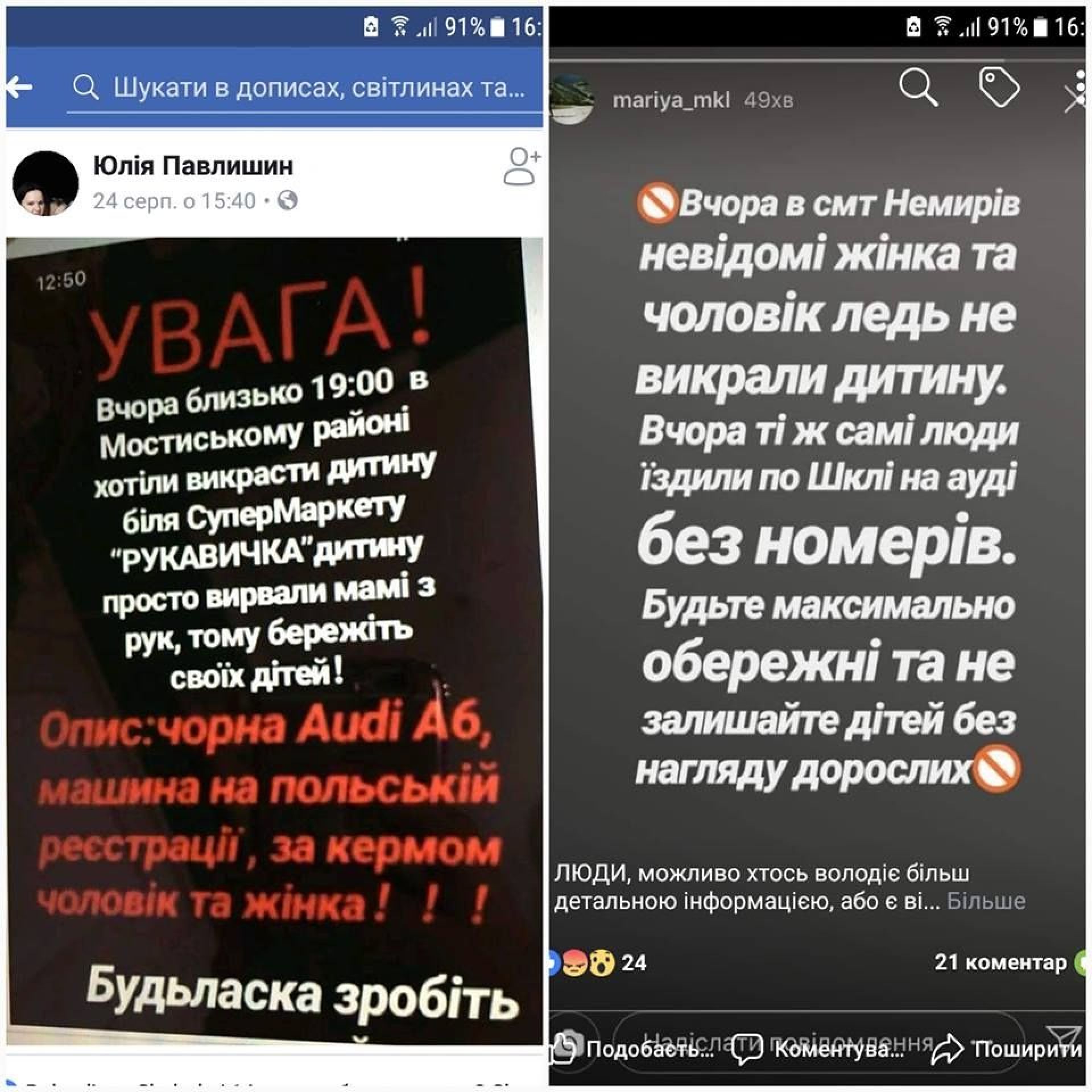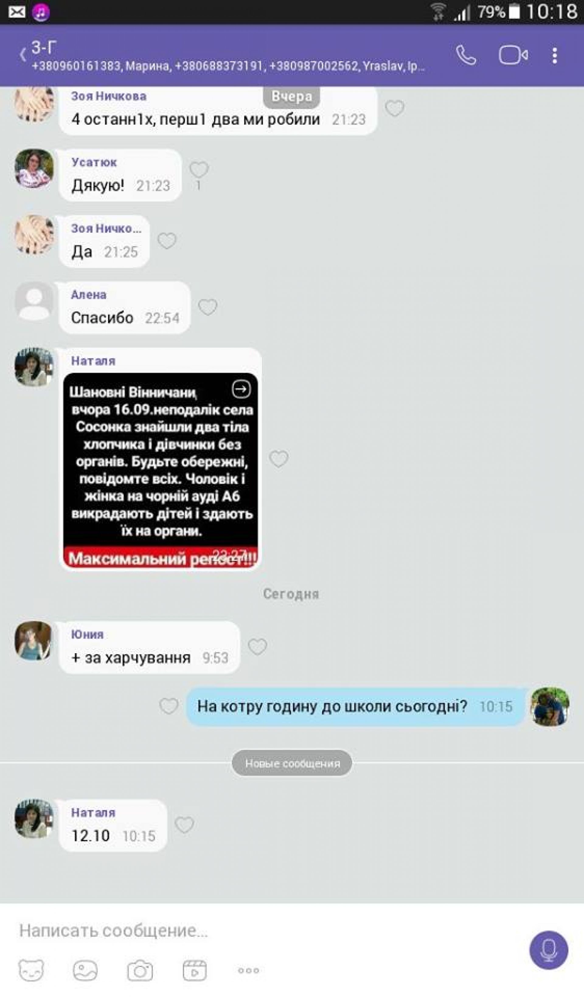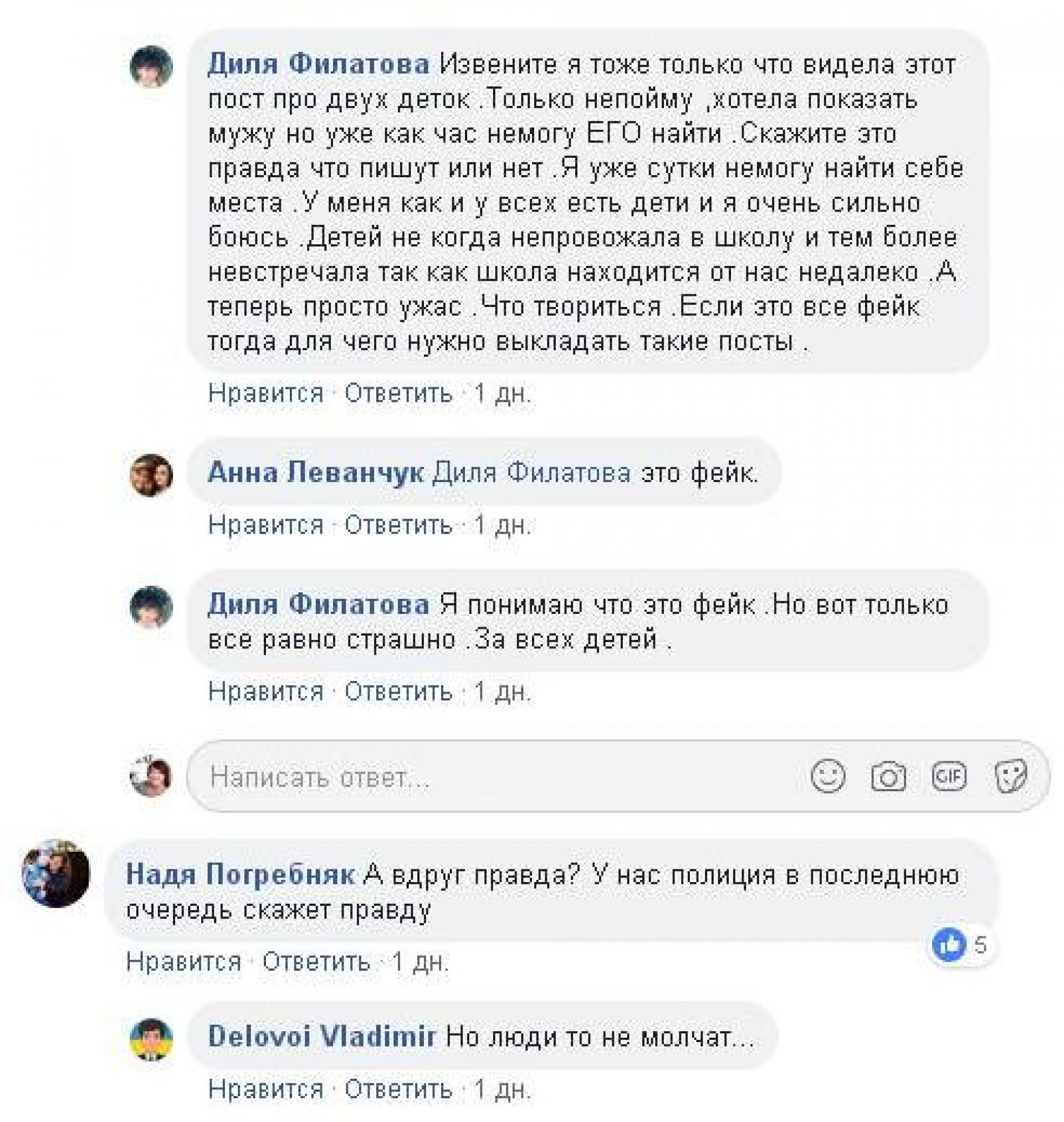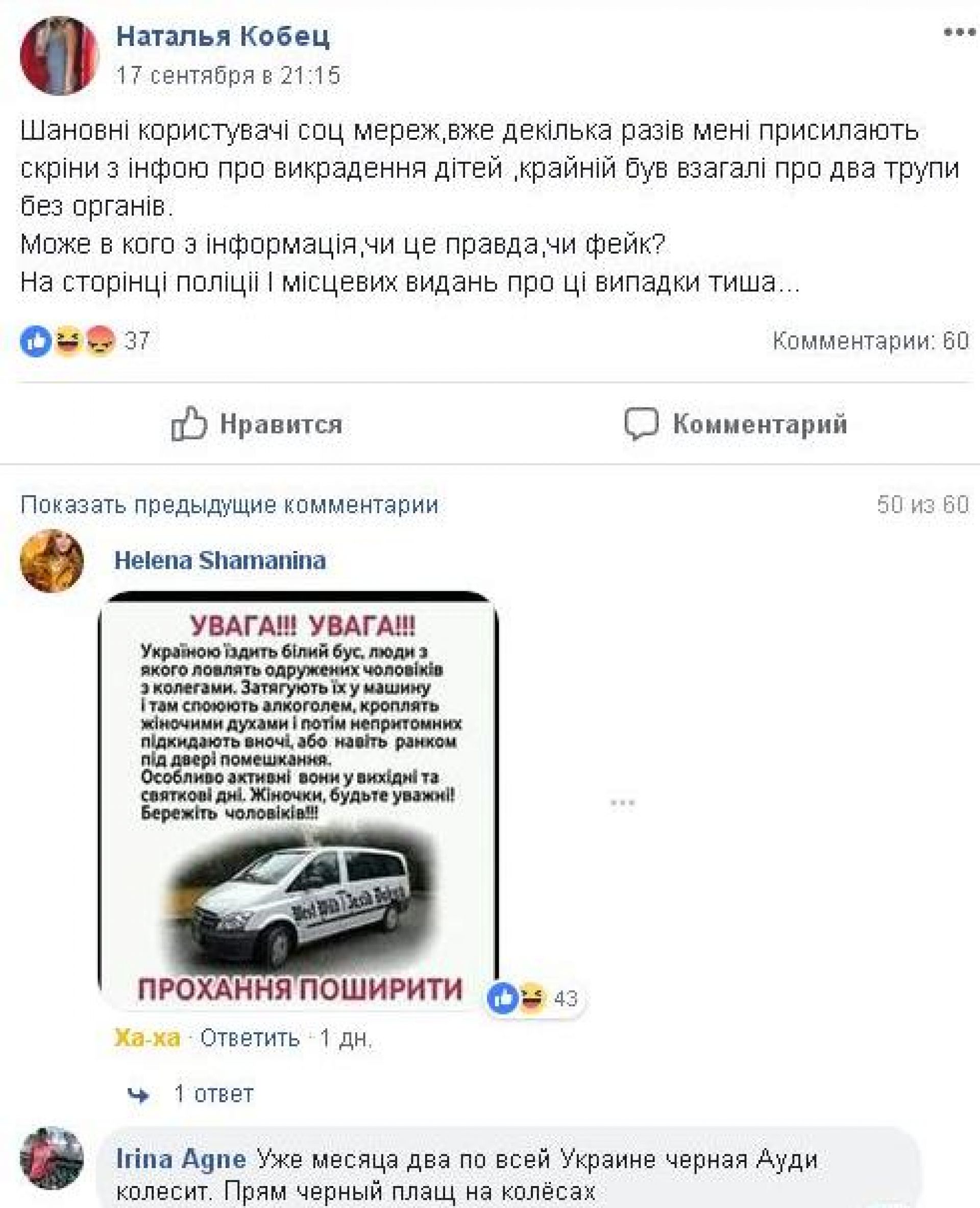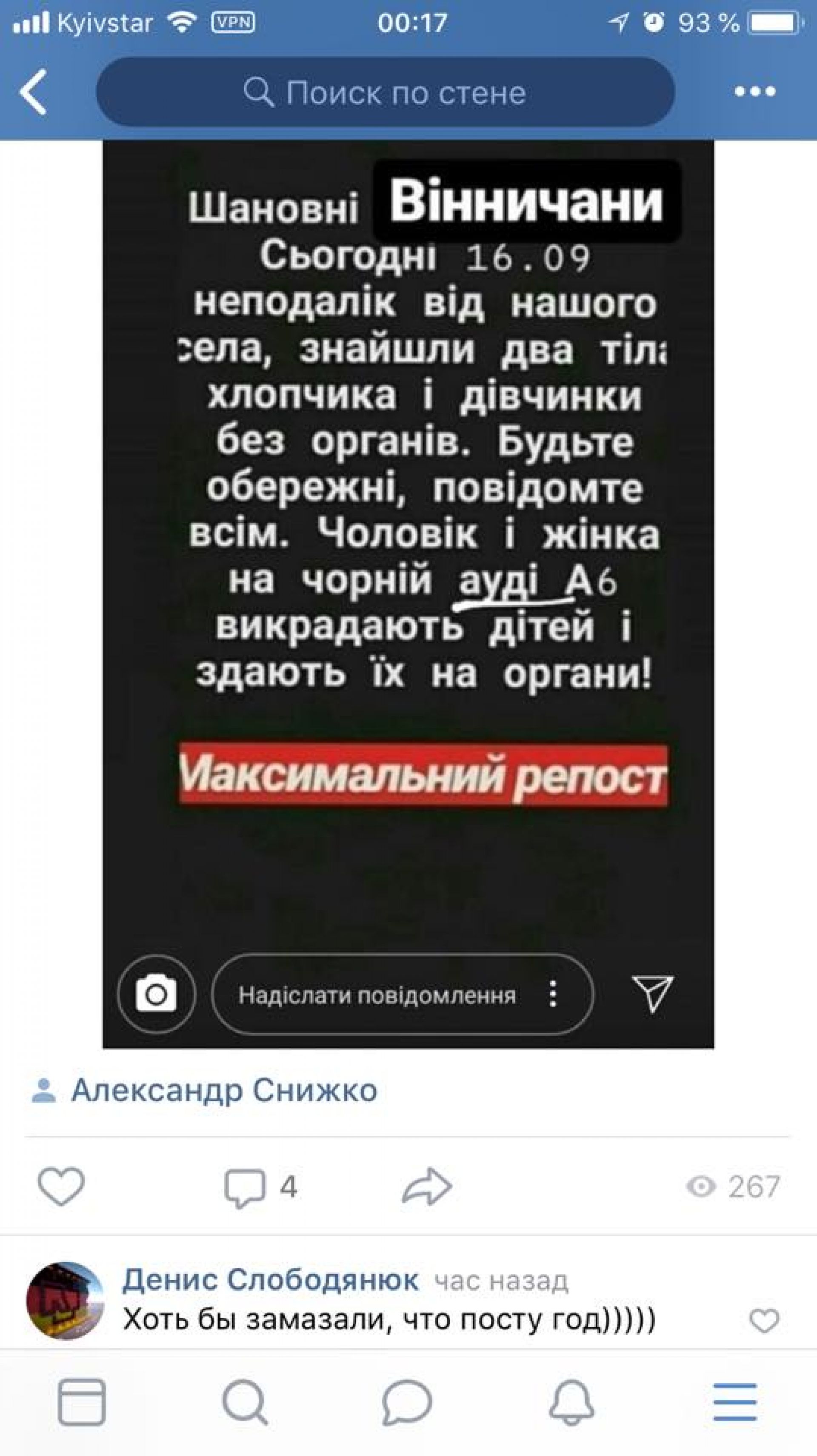 «Шановнi користувачi соцмереж, вже декiлька разiв менi присилають скрiни з iнфою про викрадення дiтей, крайнiй був взагалi про два трупи без органiв. Може в кого є iнформацiя, чи це правда, чи фейк? На сторiнцi полiцiї і мiсцевих видань про цi випадки тиша...», — написала вінничанка у групі «Черный список Винница».